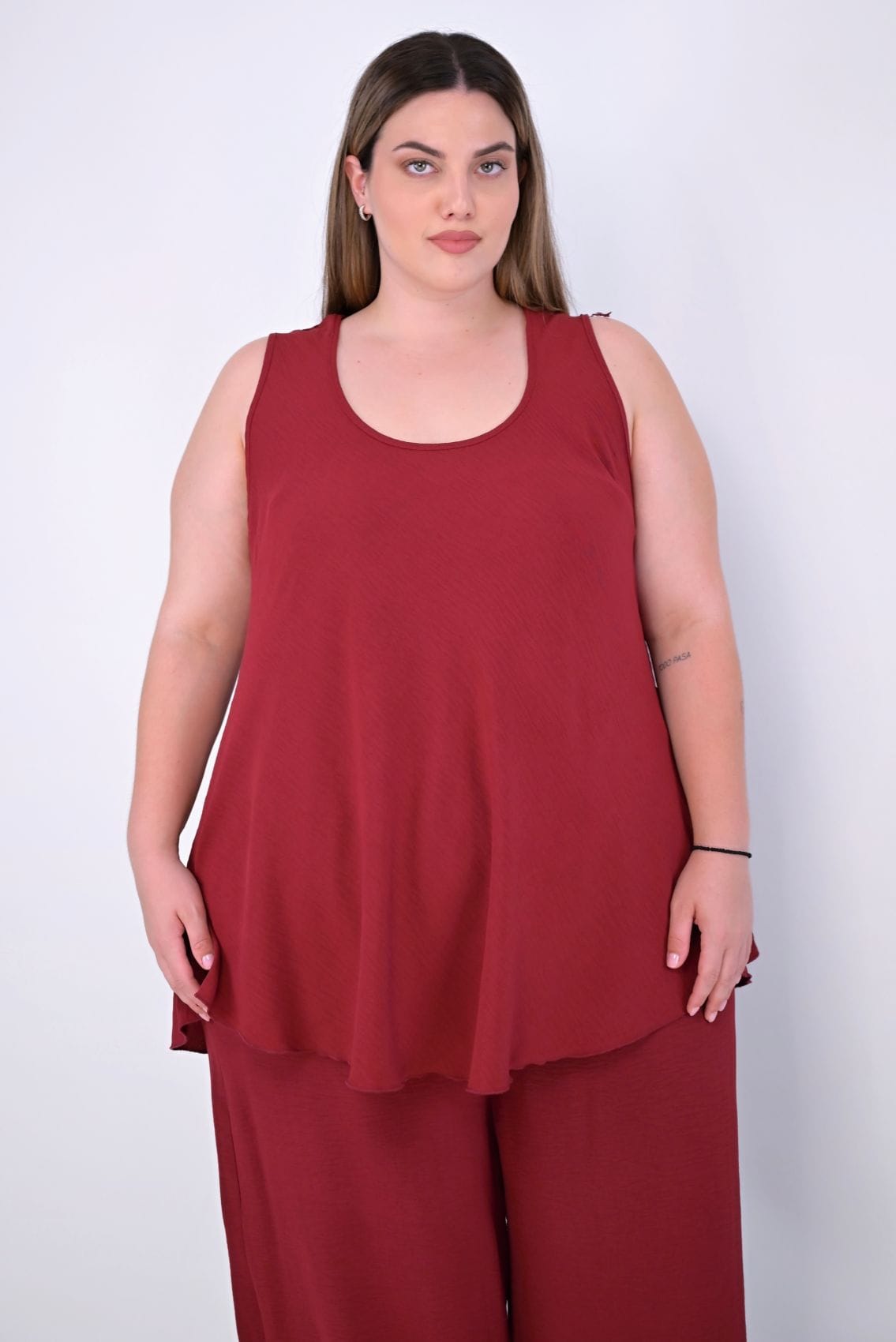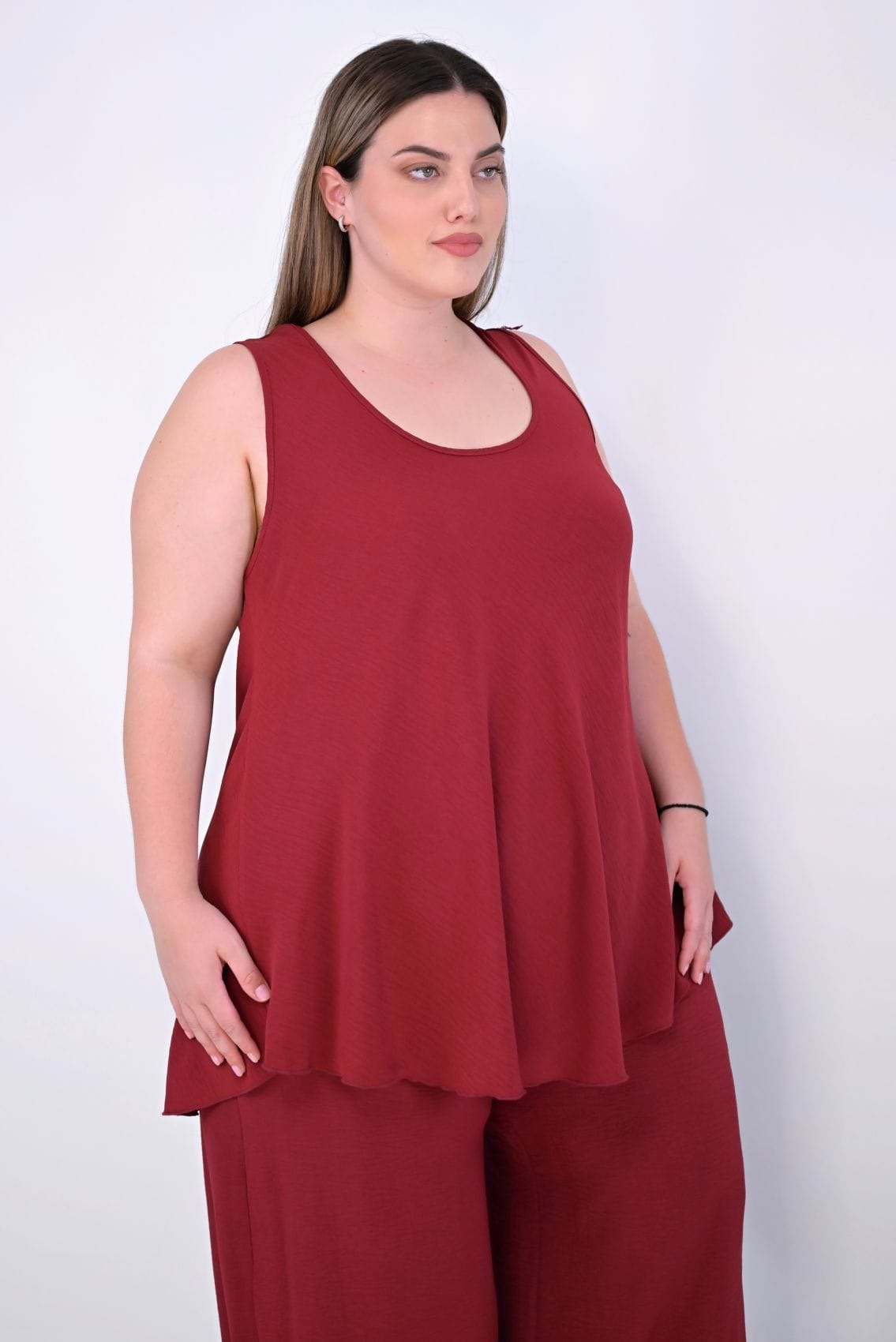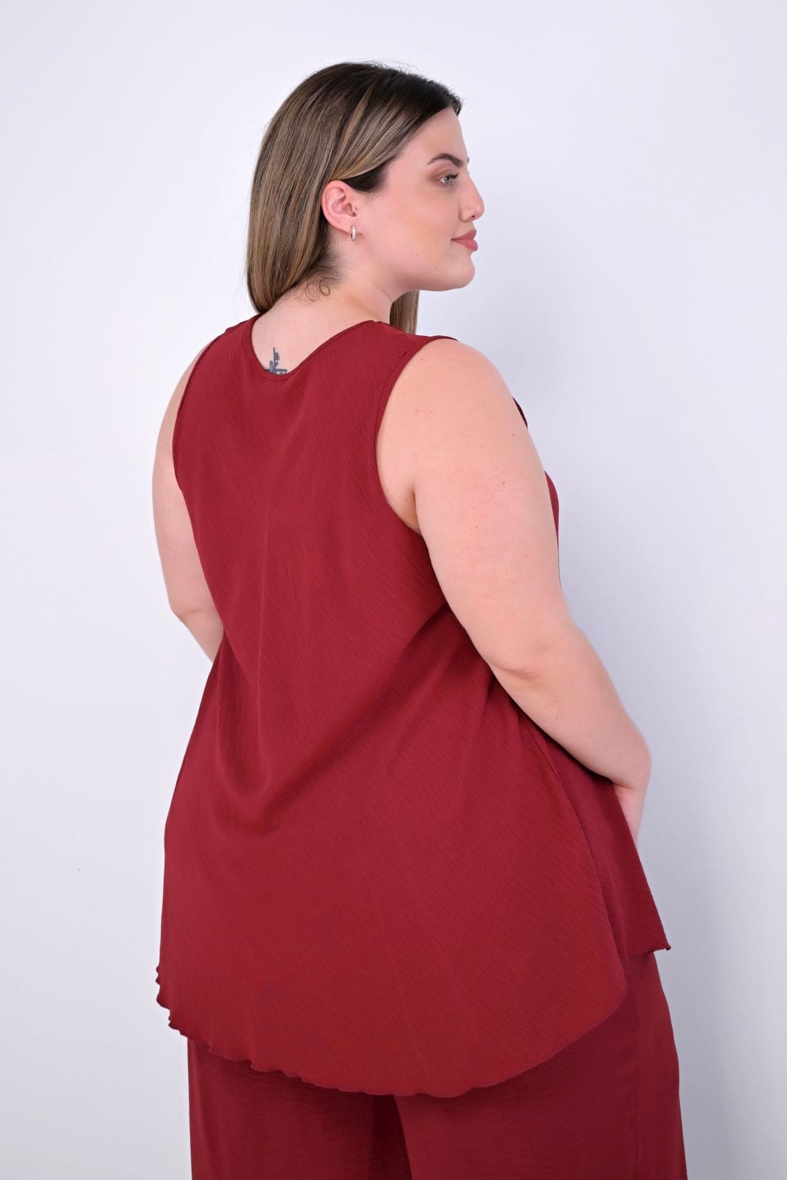 Η plus size αμάνικη μπλούζα σε μπορντό χρώμα έχει άλφα γραμμή που προσφέρει ελαφρώς φαρδιά εφαρμογή, καλύπτοντας τη μέση και την περιφέρεια. Το ύφασμα είναι τσαλακωτό, ελαφρώς ελαστικό, με ελαφριά υφή που εξασφαλίζει άνετη χρήση και δροσερή αίσθηση.