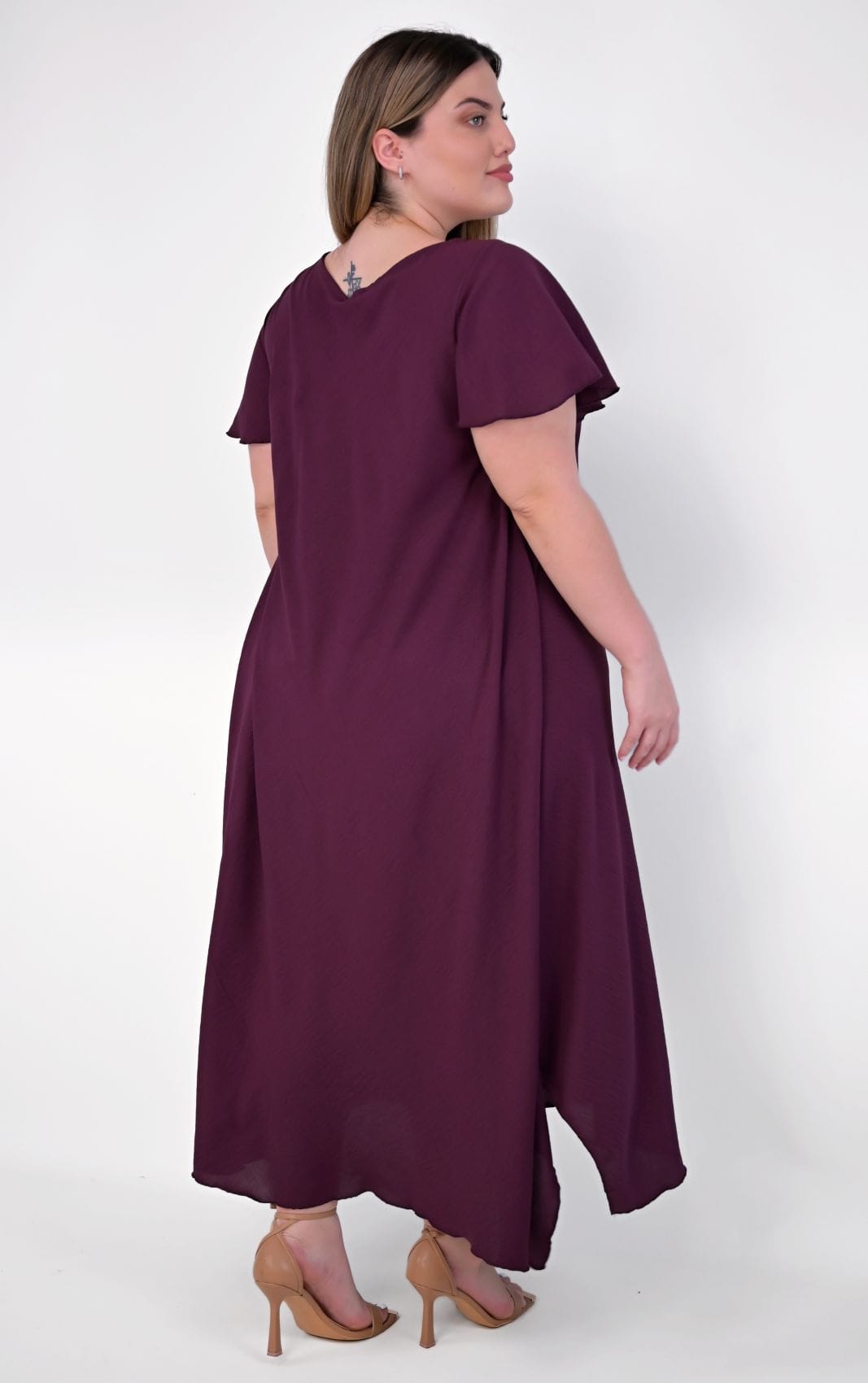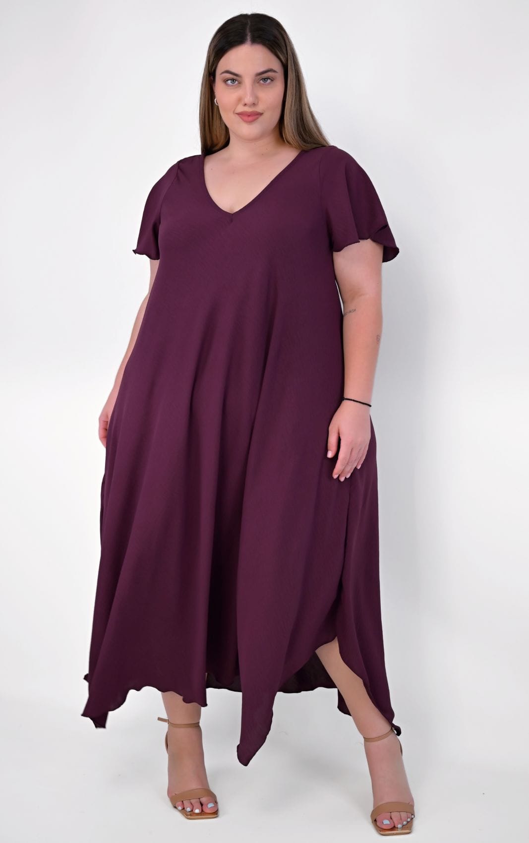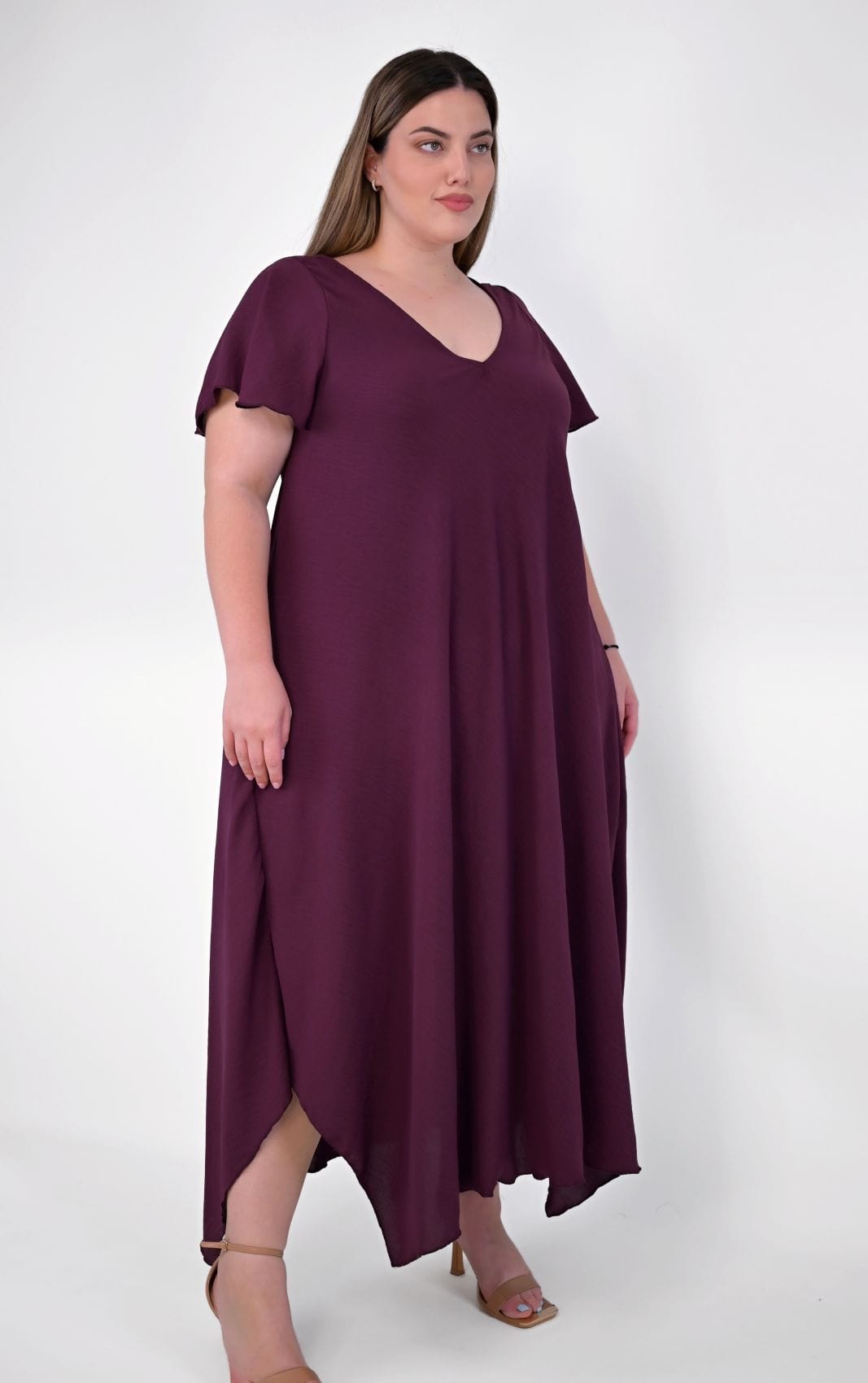 Plus size ασύμμετρο φόρεμα σε μελιτζανί. Κατασκευασμένο από δροσερό και ανάλαφρο ύφασμα, με απαλή υφή και εξαιρετική πτώση. Το σχέδιό του αγκαλιάζει το σώμα χωρίς να κολλάει, ενώ η γραμμή του ανοίγει ελαφρώς προς τα κάτω προσφέροντας ελευθερία στην κίνηση. Το τελείωμα είναι ασύμμετρο με στρογγυλή καμπύλη και βαθύτερες γωνίες στο πλάι. Τα κοντά μανίκια είναι σε στιλ καμπάνας και δεν κολλάνε στο μπράτσο. Στρογγυλή λαιμόκοψη με διακριτικό “V” και χωρίς ραφές στη μέση για απόλυτη άνεση. Δεν διαφανίζει.