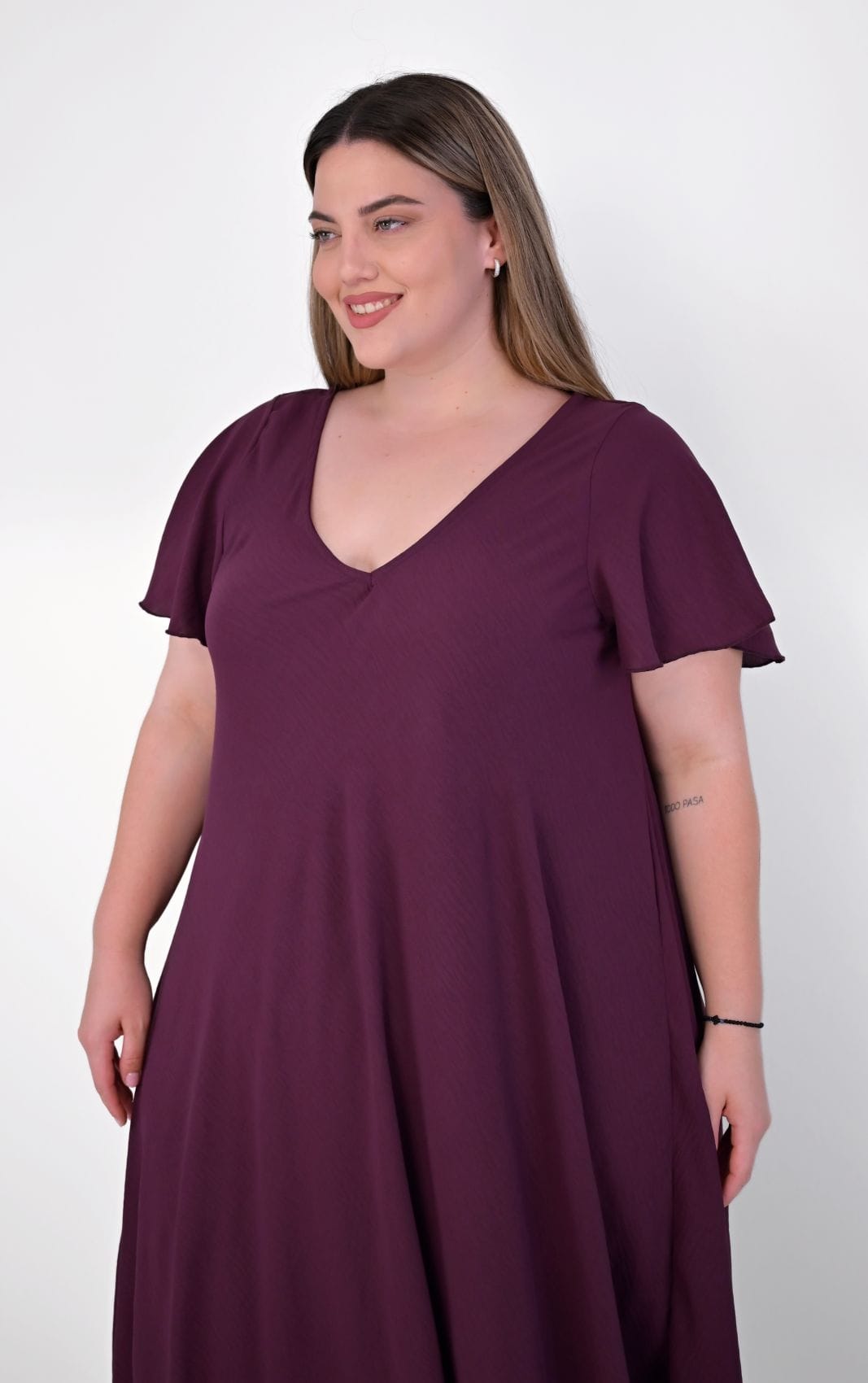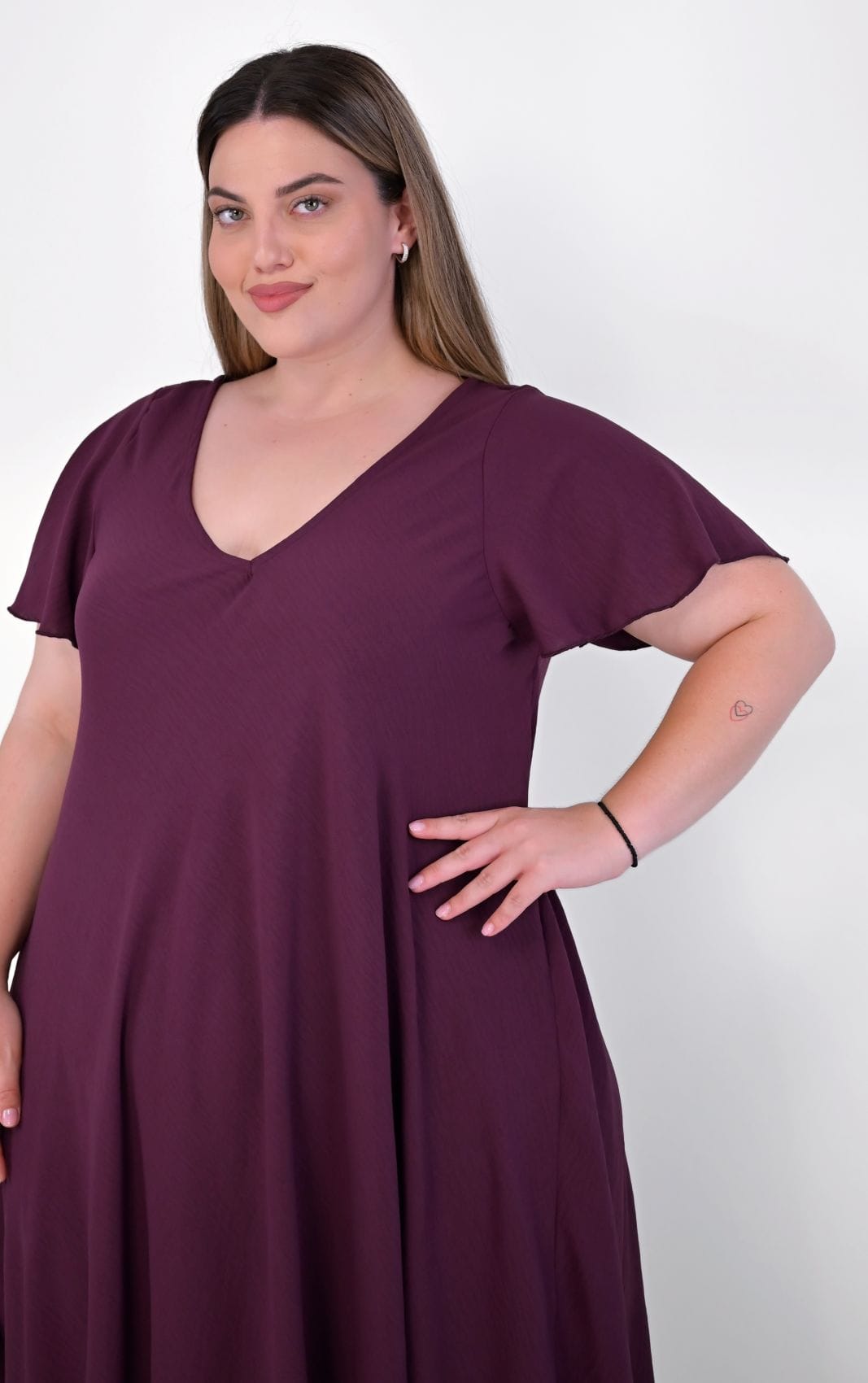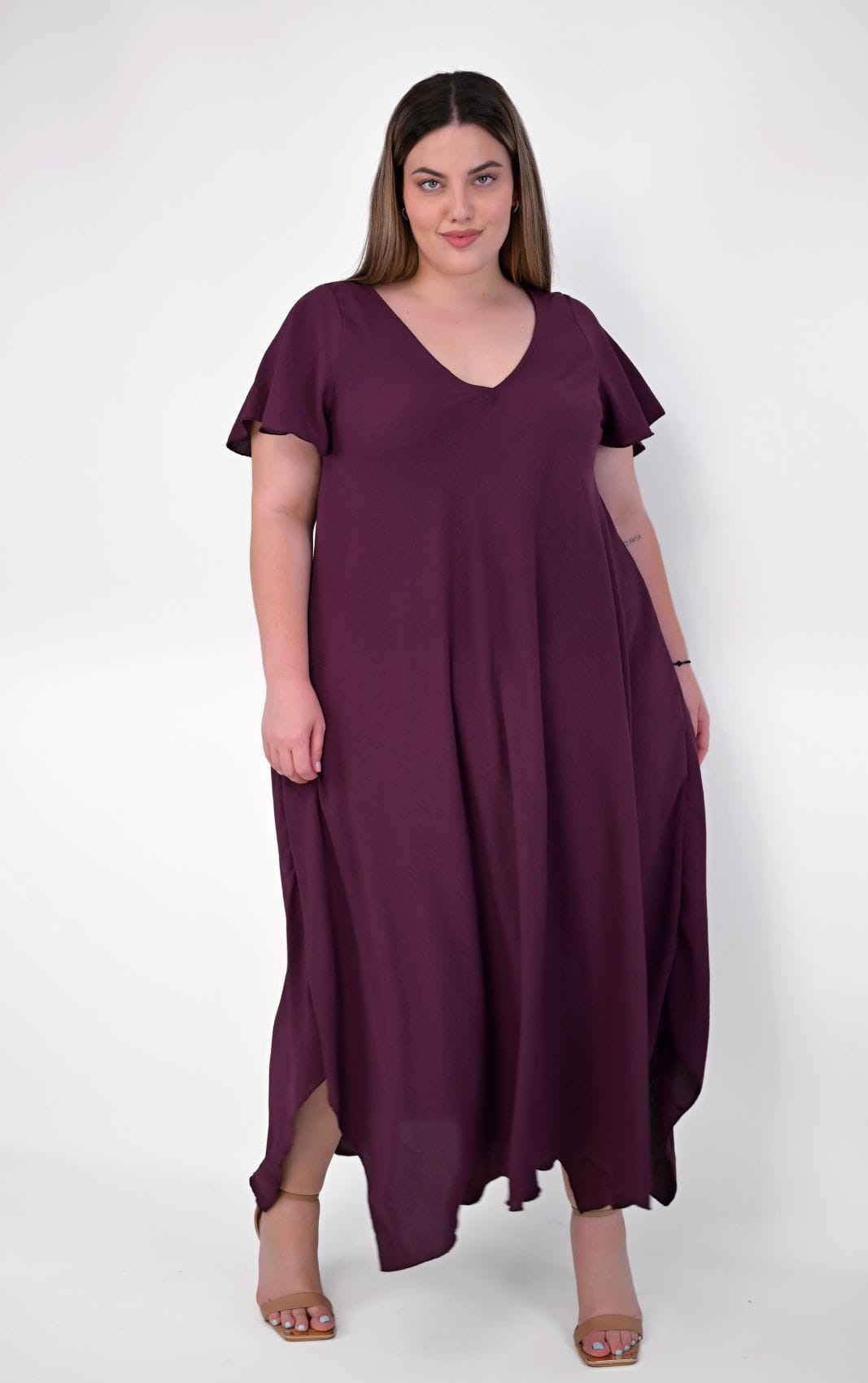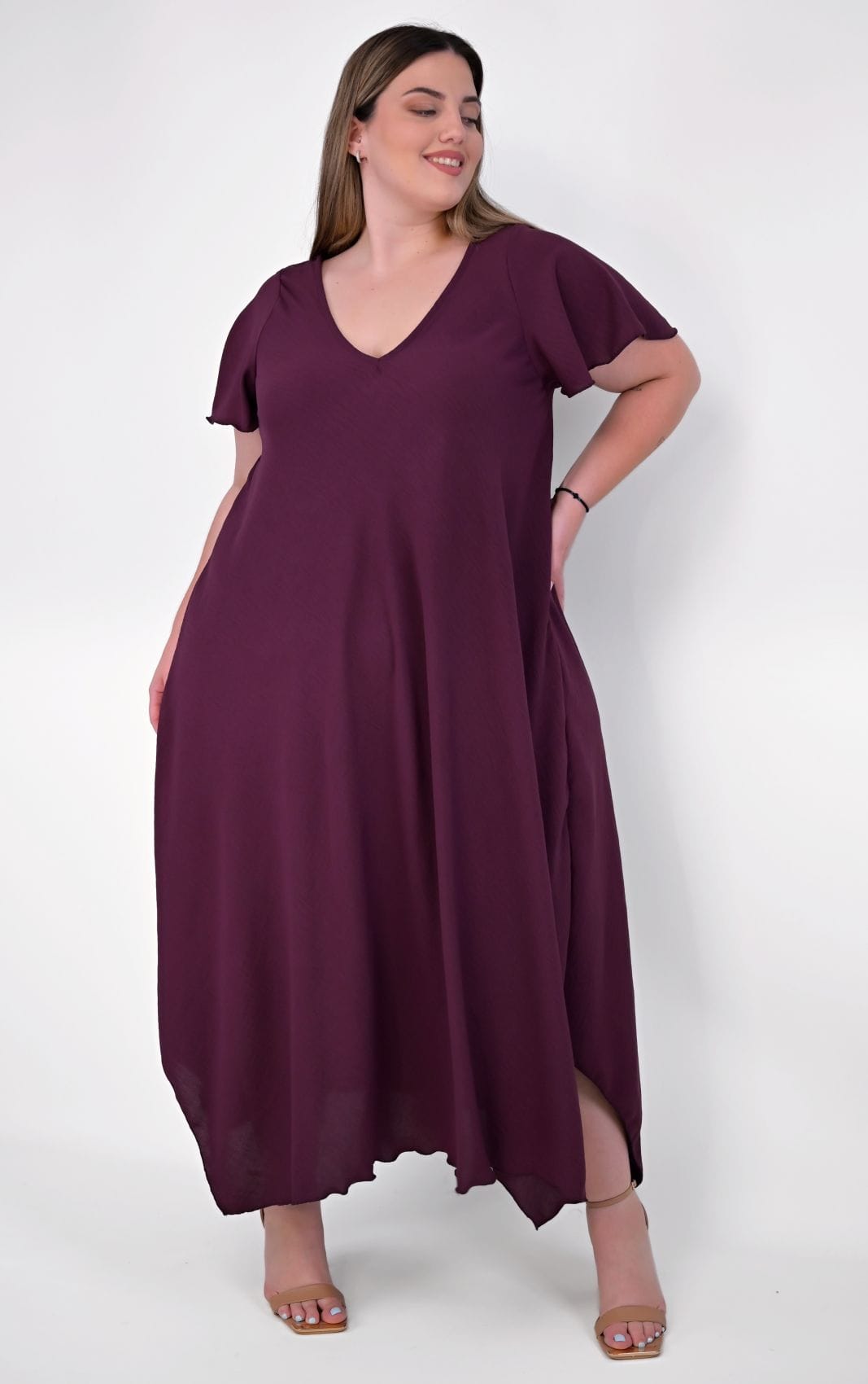 Plus size ασύμμετρο φόρεμα σε μελιτζανί. Κατασκευασμένο από δροσερό και ανάλαφρο ύφασμα, με απαλή υφή και εξαιρετική πτώση. Το σχέδιό του αγκαλιάζει το σώμα χωρίς να κολλάει, ενώ η γραμμή του ανοίγει ελαφρώς προς τα κάτω προσφέροντας ελευθερία στην κίνηση. Το τελείωμα είναι ασύμμετρο με στρογγυλή καμπύλη και βαθύτερες γωνίες στο πλάι. Τα κοντά μανίκια είναι σε στιλ καμπάνας και δεν κολλάνε στο μπράτσο. Στρογγυλή λαιμόκοψη με διακριτικό “V” και χωρίς ραφές στη μέση για απόλυτη άνεση. Δεν διαφανίζει.