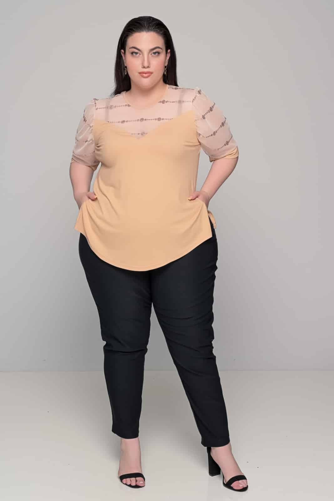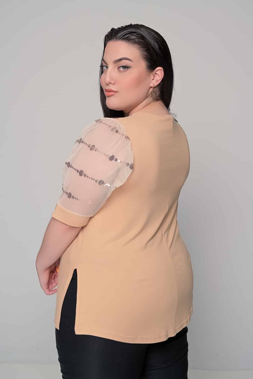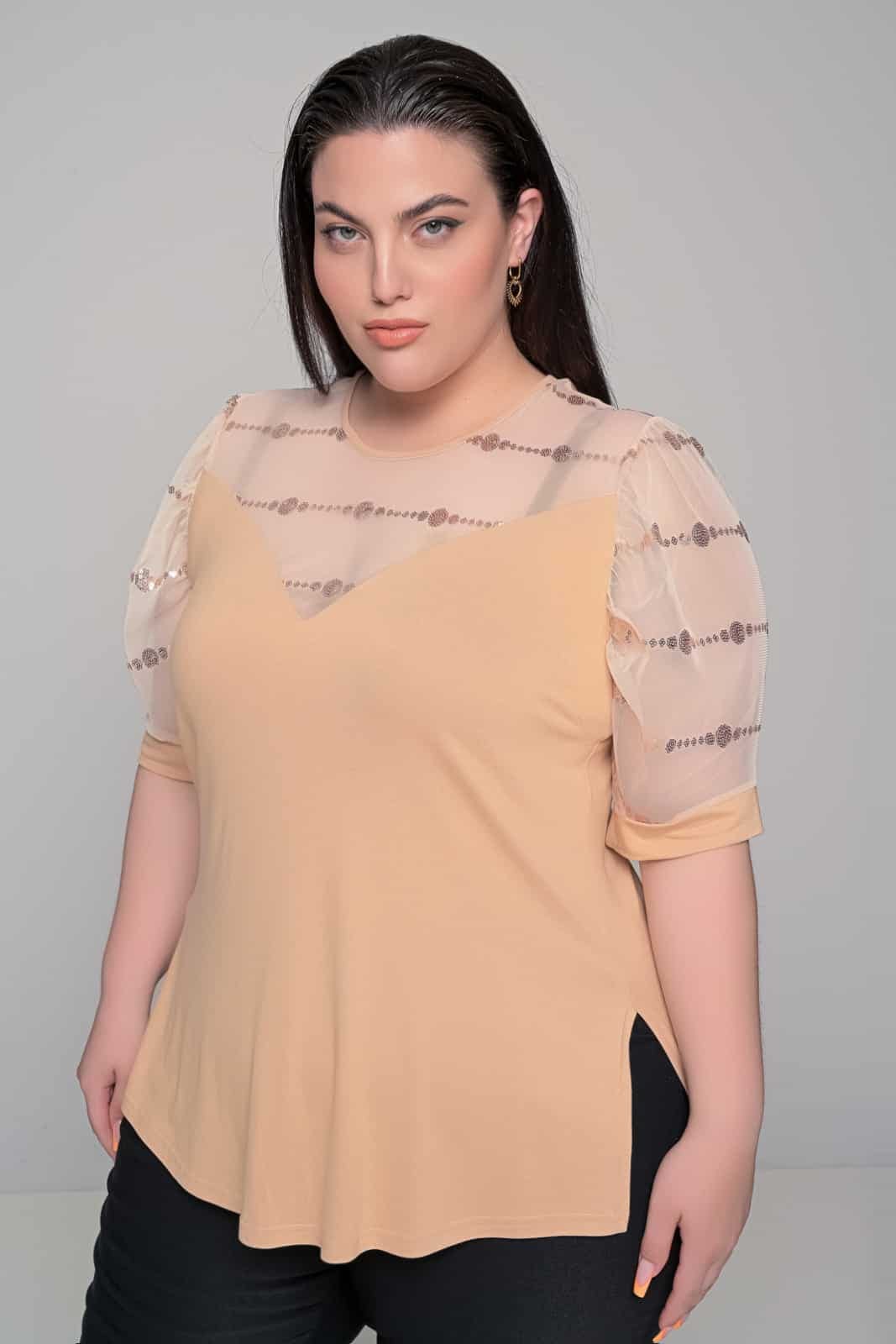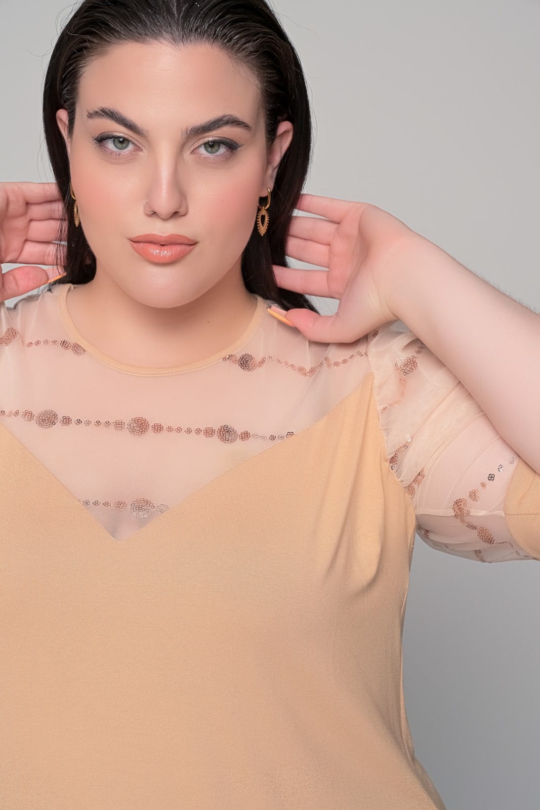 Μπλούζα μπεζ με λαιμόκοψη και ψεύτικο V στο μπούστο με διαφάνεια κεντημένη με παγιέτα. Το μανίκι κοντό με την ίδια διαφάνεια, με ελαφριά σούρα στον ώμο και υφασμάτινο τελείωμα για να δίνει την αίσθηση της φούσκας. Το μήκος της μπλούζας καλύπτει την περιφέρεια.