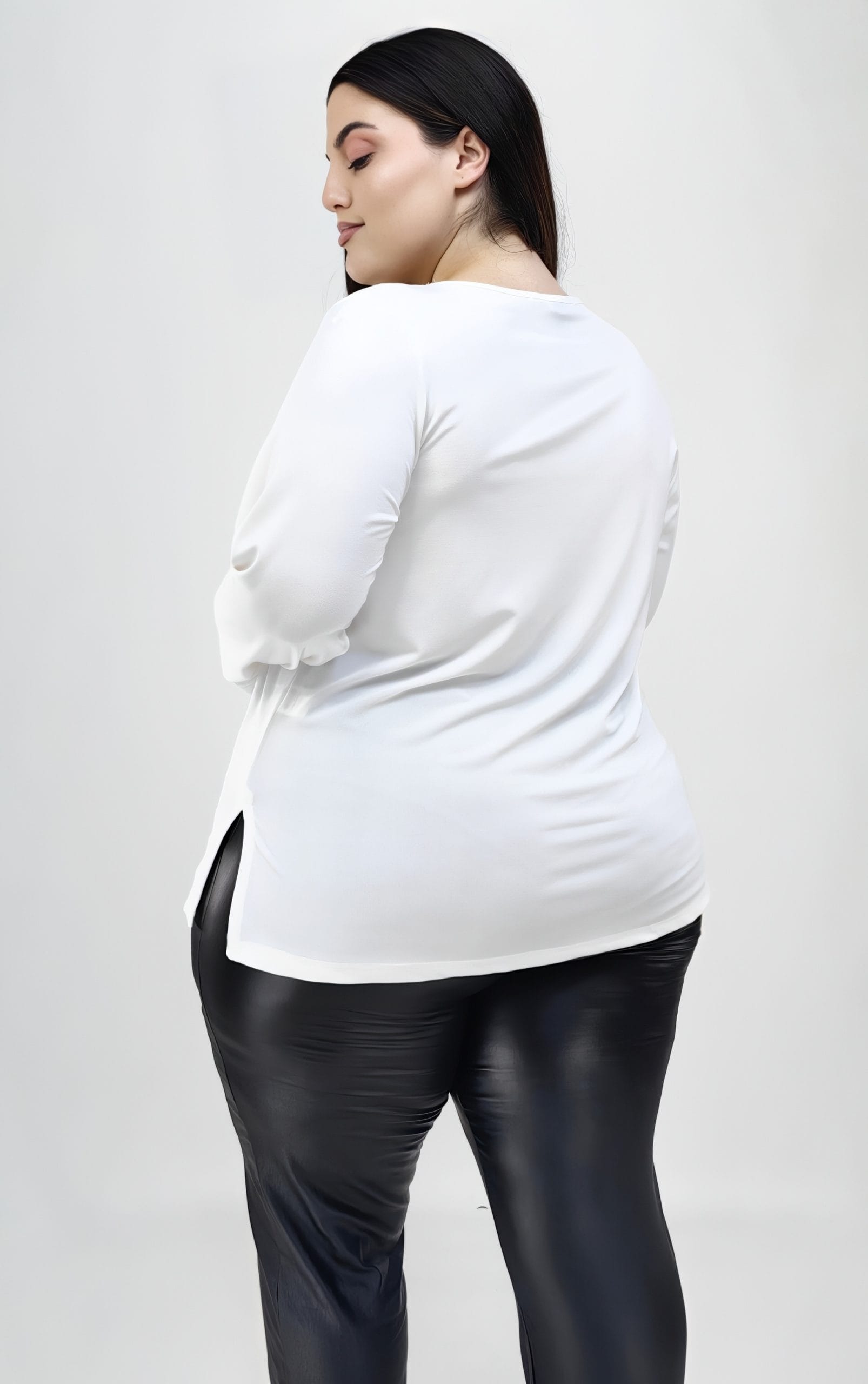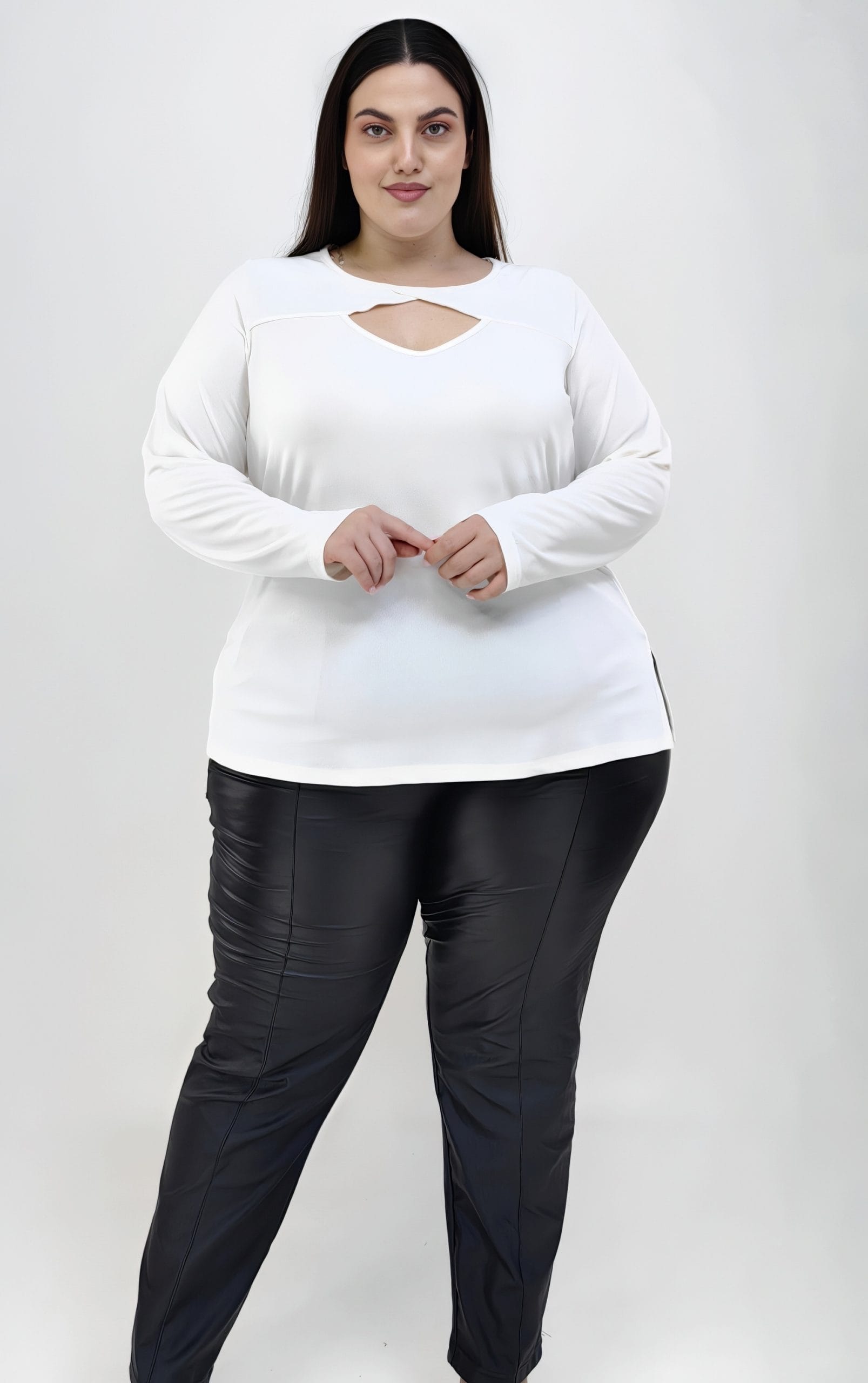 Τα πλαϊνά ανοίγματα εξασφαλίζουν καλύτερη εφαρμογή, ενώ το ημίκοντο μήκος της μπλούζας επιτρέπει να φοριέται τόσο μέσα όσο και έξω από παντελόνια ή φούστες. Αυτή η μπλούζα είναι μια ευέλικτη επιλογή που μπορεί να φορεθεί σε καθημερινές ή πιο ιδιαίτερες εμφανίσεις.Plus size εκρού μακρυμάνικη μπλούζα