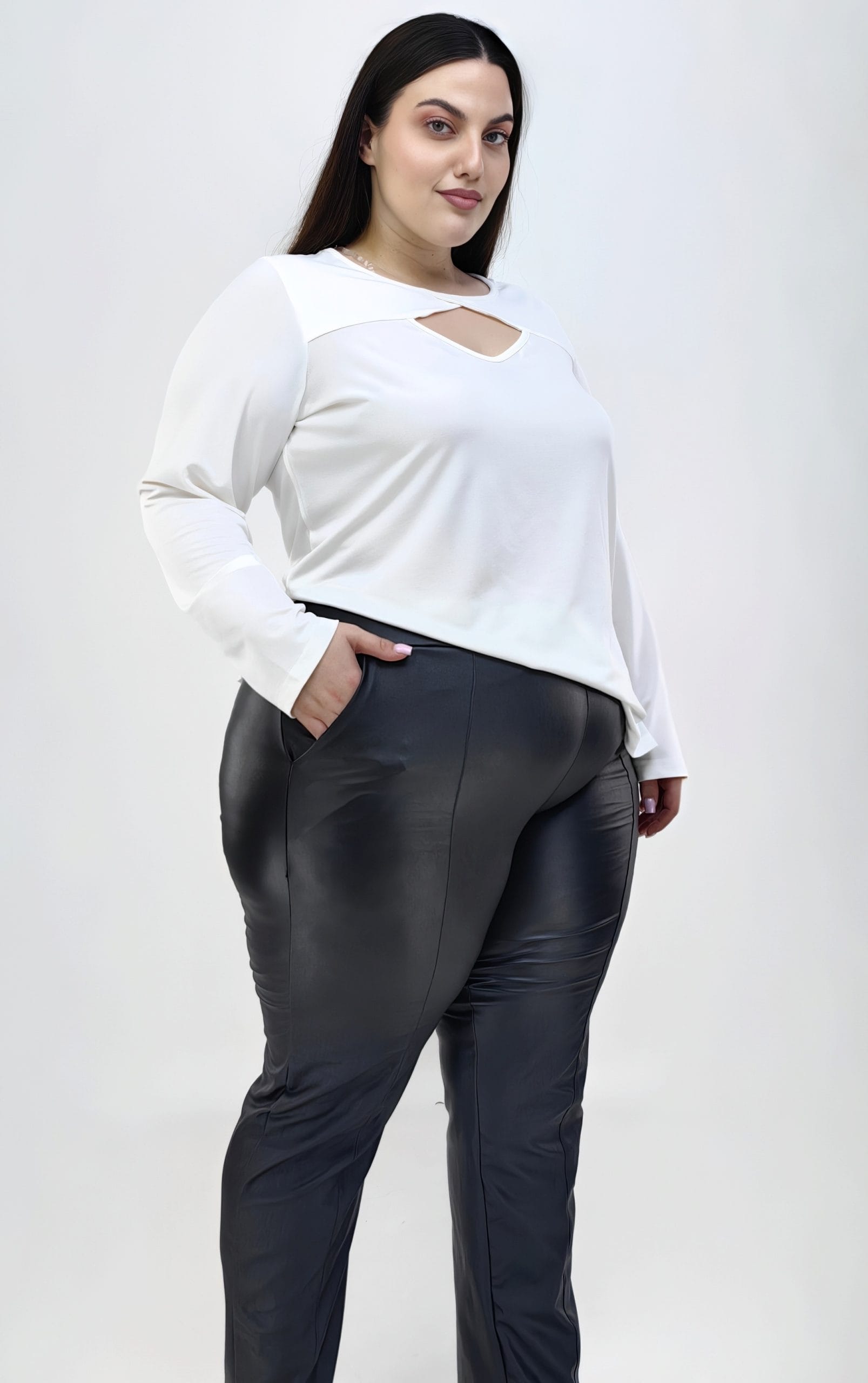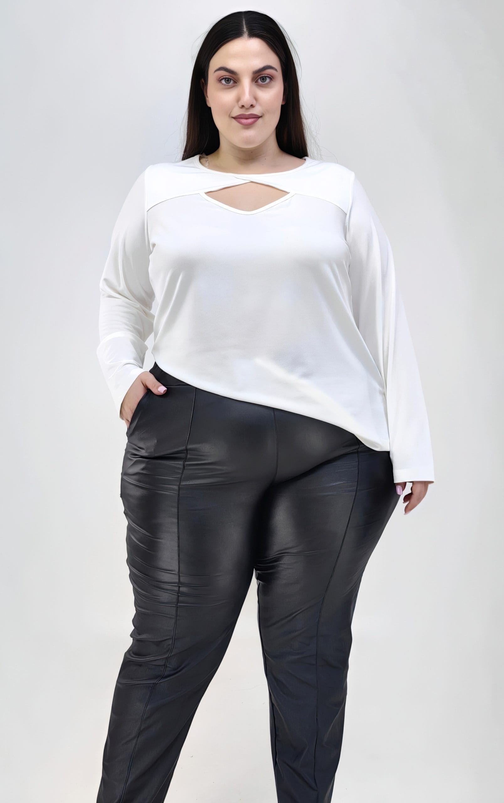Plus size εκρού μακρυμάνικη μπλούζα με κλασική λαιμόκοψη, σχεδιασμένη για να προσφέρει άνεση και στυλ σε κάθε εμφάνιση. Στο στήθος, το τριγωνικό cut out προσθέτει μια ξεχωριστή λεπτομέρεια που τραβάει την προσοχή και αναδεικνύει το ντύσιμό σας.