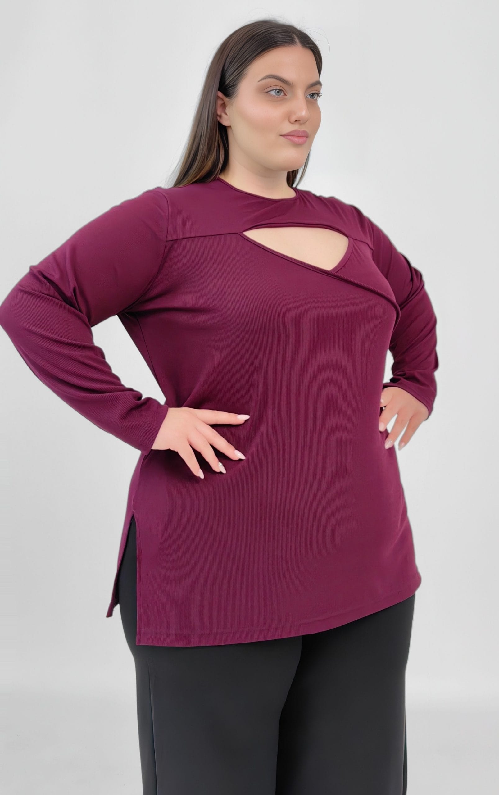 Στο κάτω μέρος, τα πλαϊνά ανοίγματα εξασφαλίζουν ότι η μπλούζα δεν κολλάει στην περιφέρεια, προσφέροντας καλύτερη εφαρμογή και άνεση σε κάθε κίνηση. Αυτή η μπλούζα είναι ιδανική για καθημερινή χρήση, συνδυάζοντας στυλ και πρακτικότητα.Plus size δαμασκηνί ριπ μπλούζα