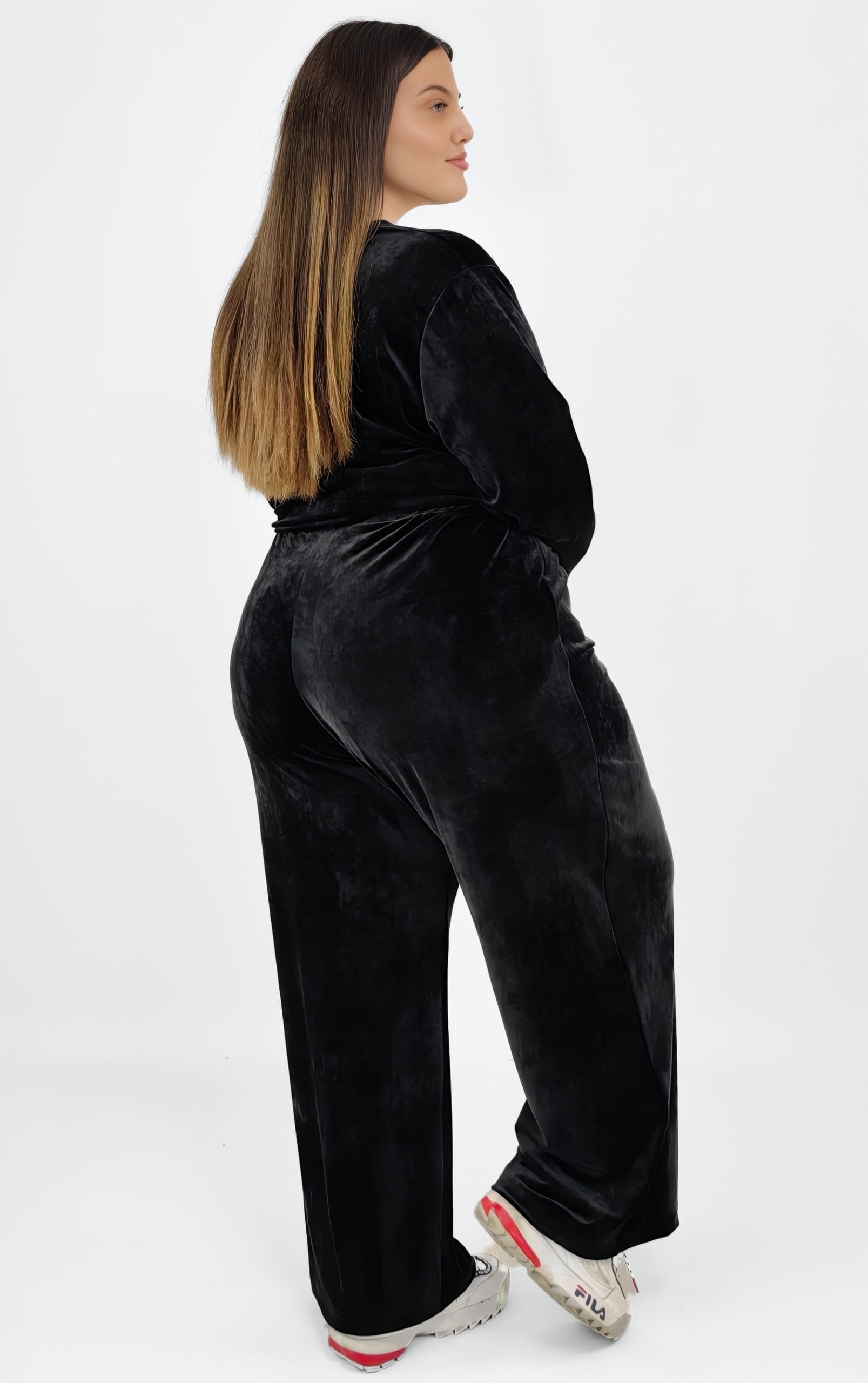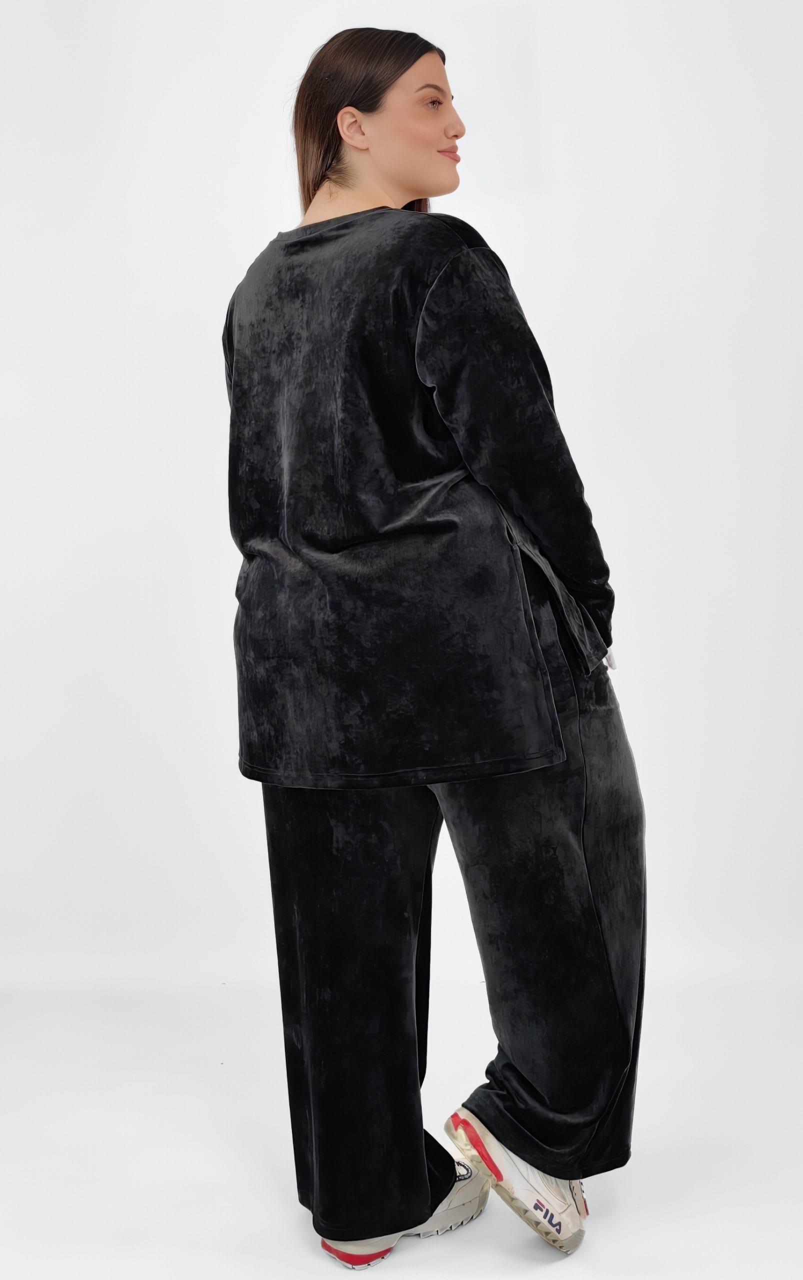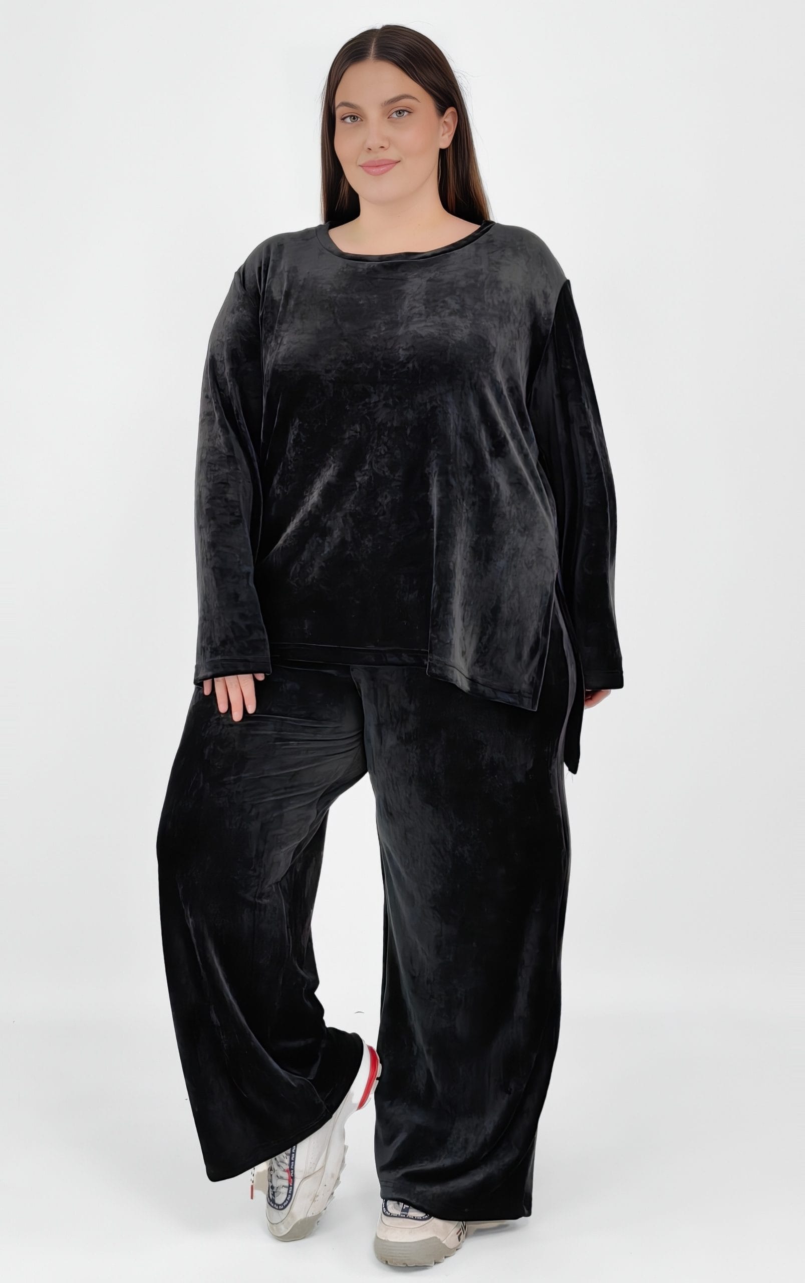 Η μαύρη plus size βελουτέ μπλούζα με λαιμόκοψη και ανοίγματα στο πλάι θα σας συναρπάσει! Αποτελεί μια μοντέρνα επιλογή για κάθε γκαρνταρόμπα με γυναικεία ρούχα σε μεγάλα μεγέθη. Το βελουτέ ύφασμα και τα ανοίγματα στα πλαϊνά δημιουργούν αέρινη αίσθηση, δίνοντάς σας κομψότητα και στυλ. Μπορείτε να τη συνδυάσετε  με την αντίστοιχη βελουτέ παντελόνα, αλλά και με τζιν για όλες τις ώρες. Προσθέστε μια ζώνη και λίγα κοσμήματα για να δώσετε ένα επιπλέον στιλιστικό άγγιγμα.
