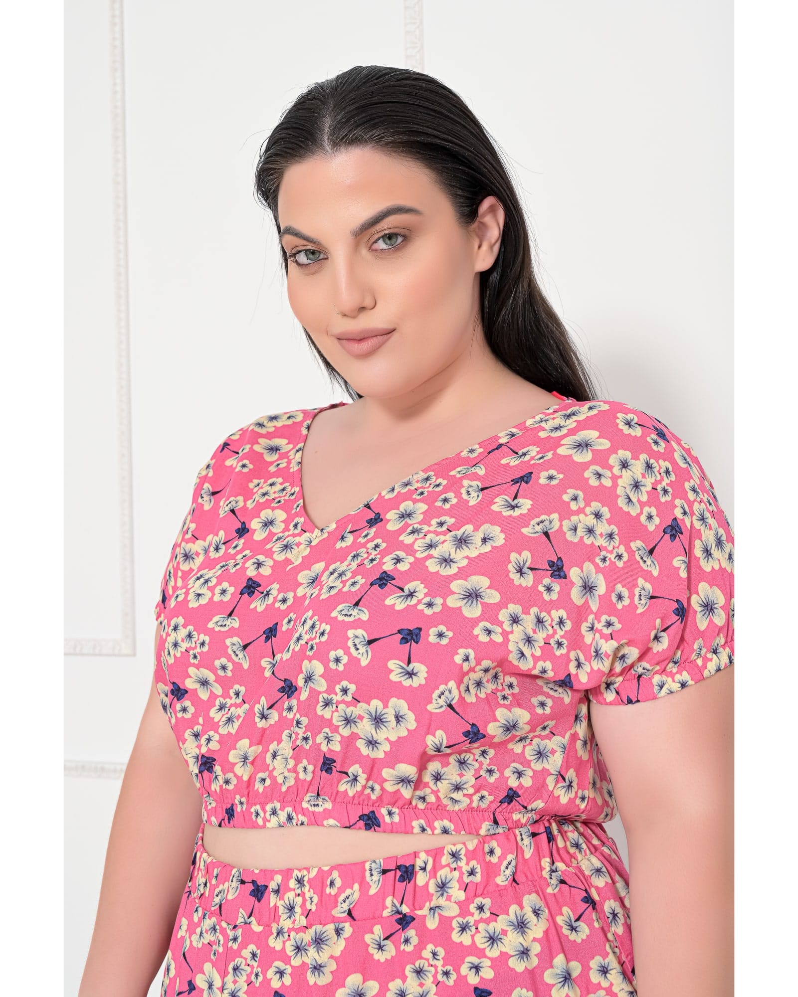Crop top φούξια floral με V στο λαιμό και λάστιχο στo μανίκι και στη μέση. Κοντομάνικο σε ύφασμα δροσερό και άνετο.