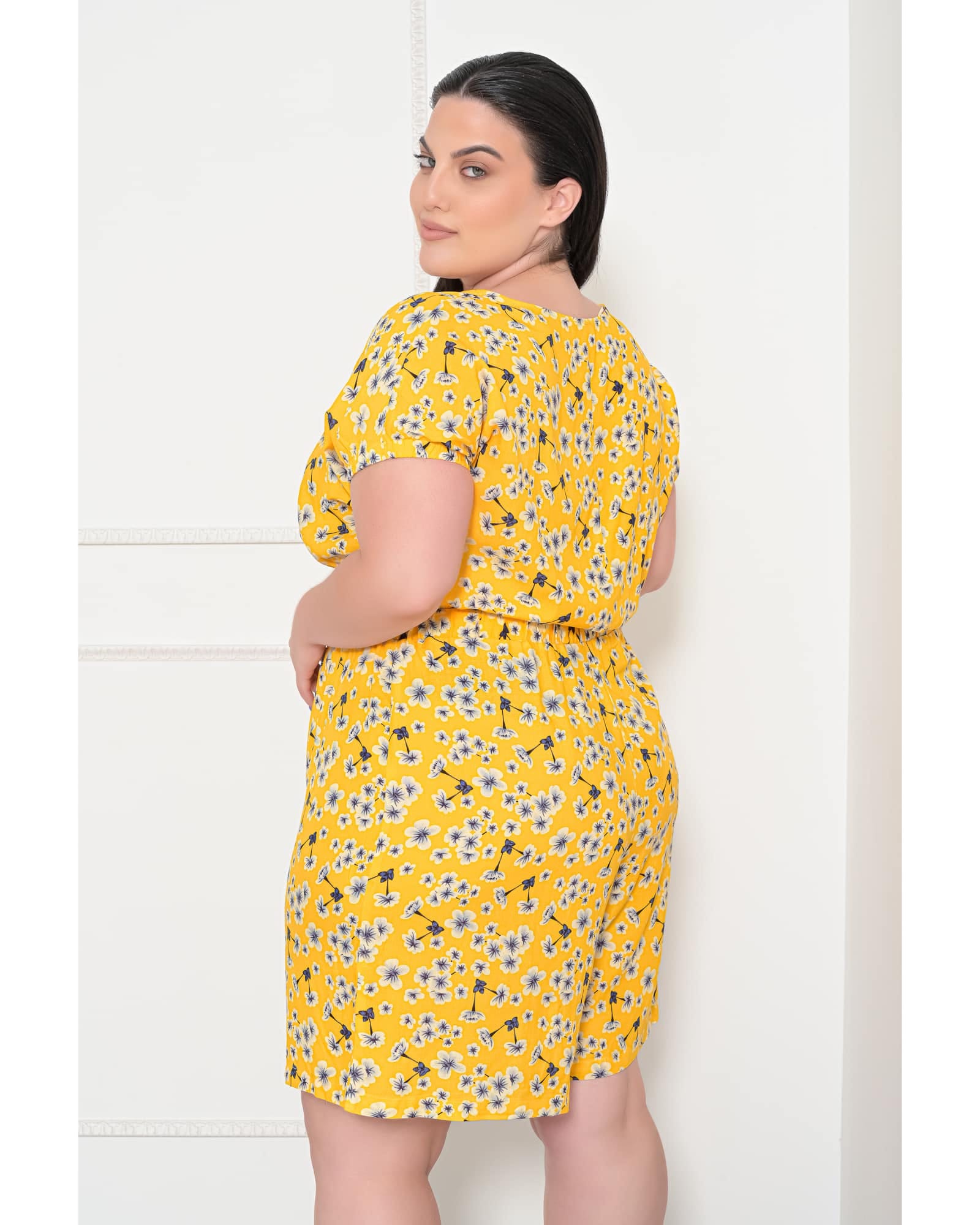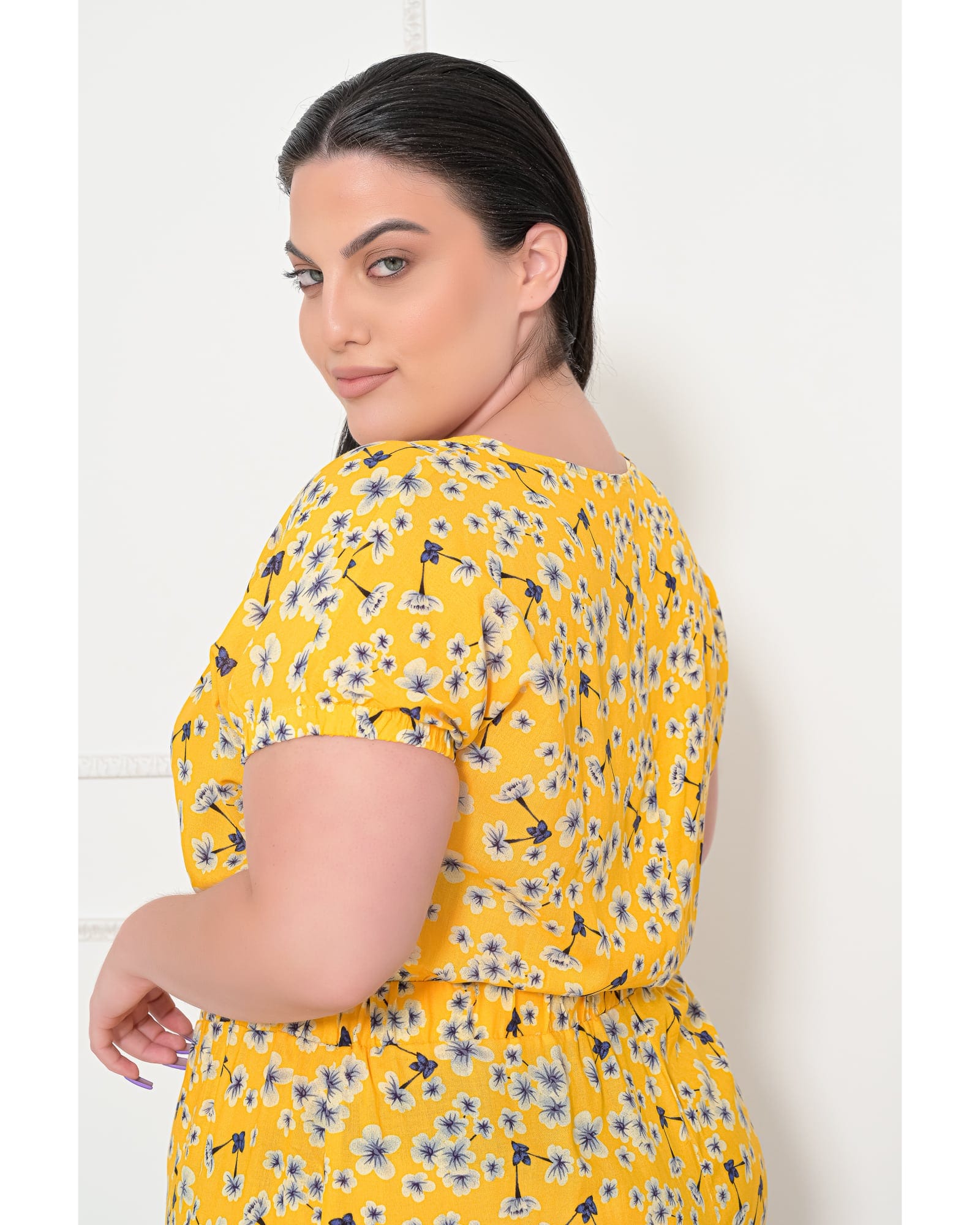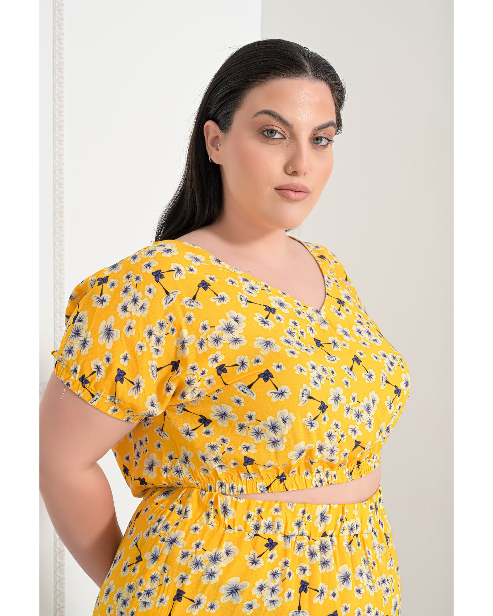 Crop top κίτρινο floral με V στο λαιμό και λάστιχο στo μανίκι και στη μέση. Κοντομάνικο σε ύφασμα δροσερό και άνετο.