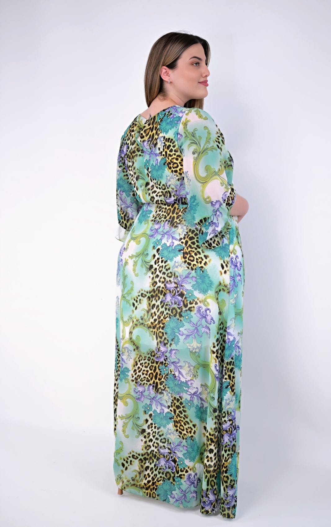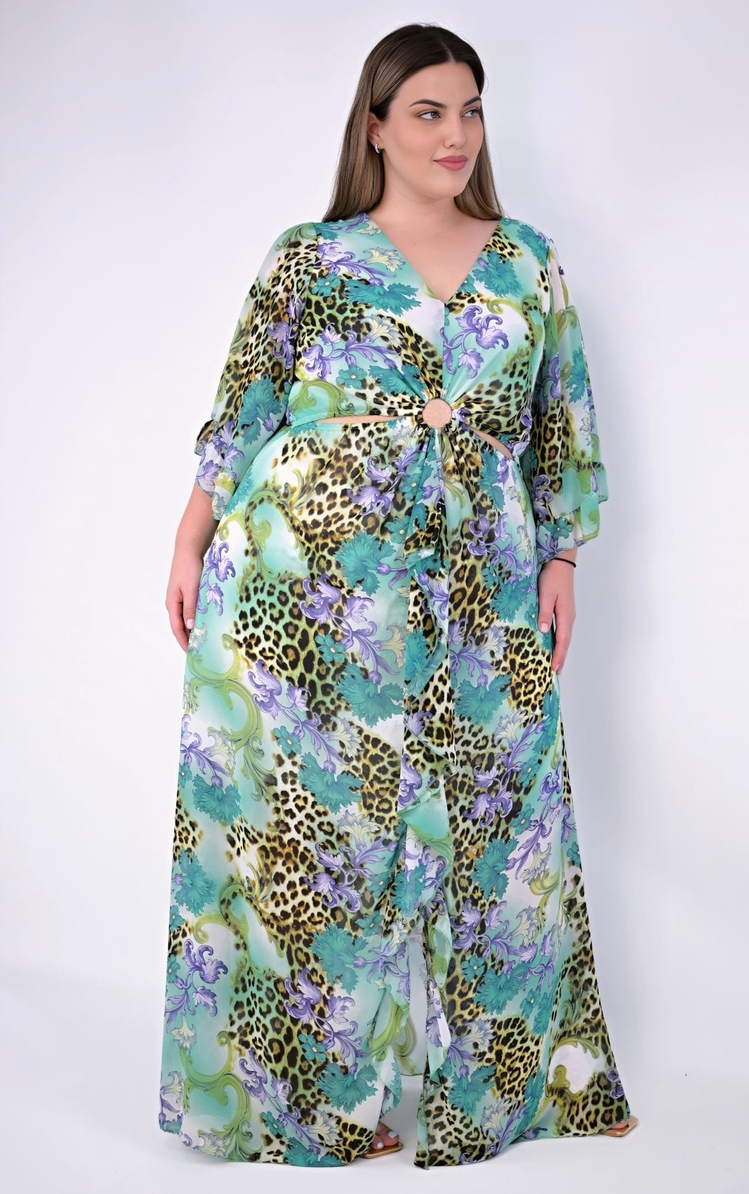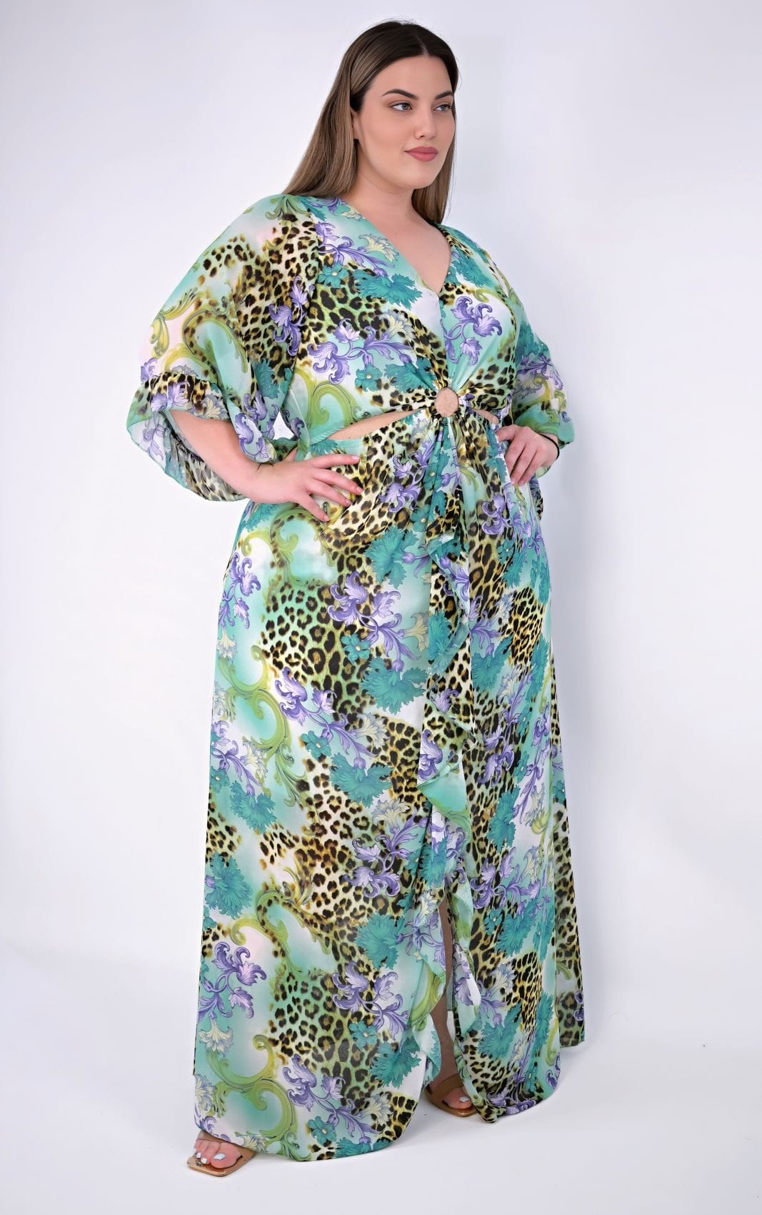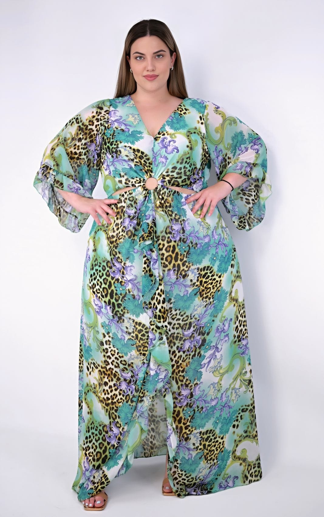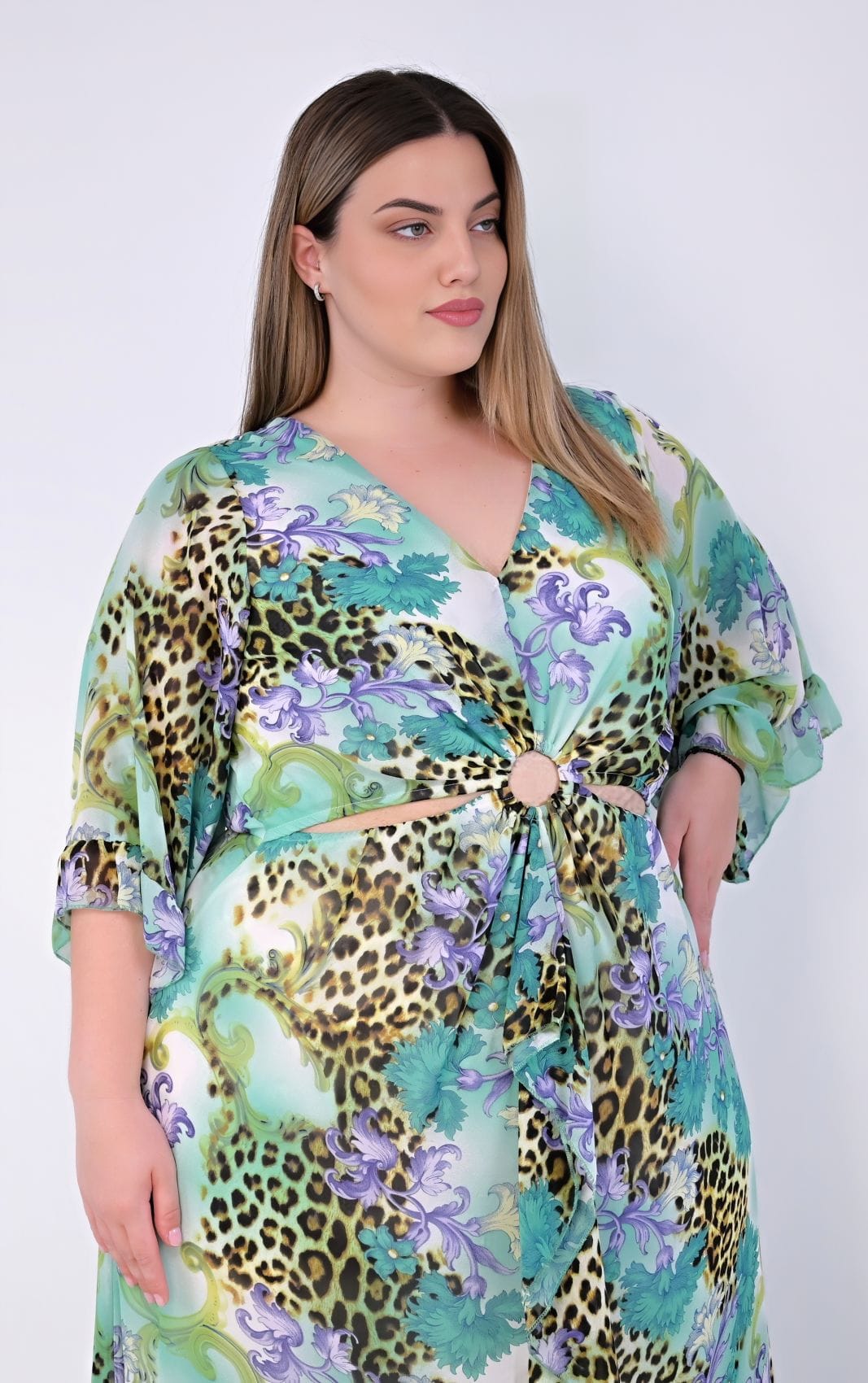 Plus Size μάξι φόρεμα από ελαφριά ζορζέτα με ανάγλυφη υφή και τροπική διάθεση. Το έντονο print συνδυάζει leopard μοτίβο με jungle λουλούδια σε αποχρώσεις πράσινου, λιλά και μαύρου, δημιουργώντας ένα outfit που δεν περνά απαρατήρητο. Το V λαιμόκοψη με τον διακοσμητικό κρίκο στο στήθος τονίζει διακριτικά το μπούστο, ενώ τα φαρδιά, αέρινα μανίκια προσθέτουν θηλυκή χάρη. Η μπροστινή πατιλέτα με βολάν κινείται υπέροχα στο περπάτημα και χαρίζει μια ανάλαφρη, εξωτική αισθητική.