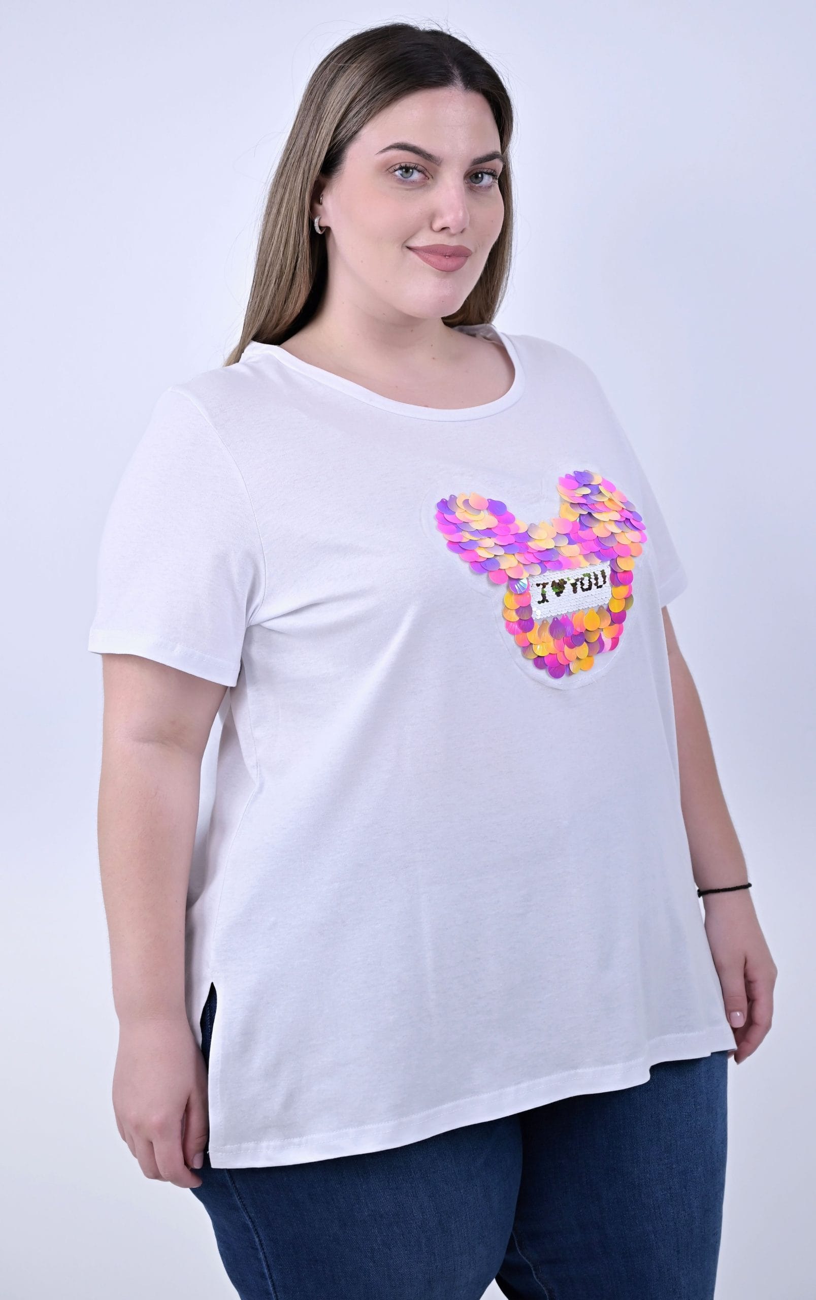 Plus Size Λευκή Μπλούζα με Παγιέτες σε Σχήμα Mickey