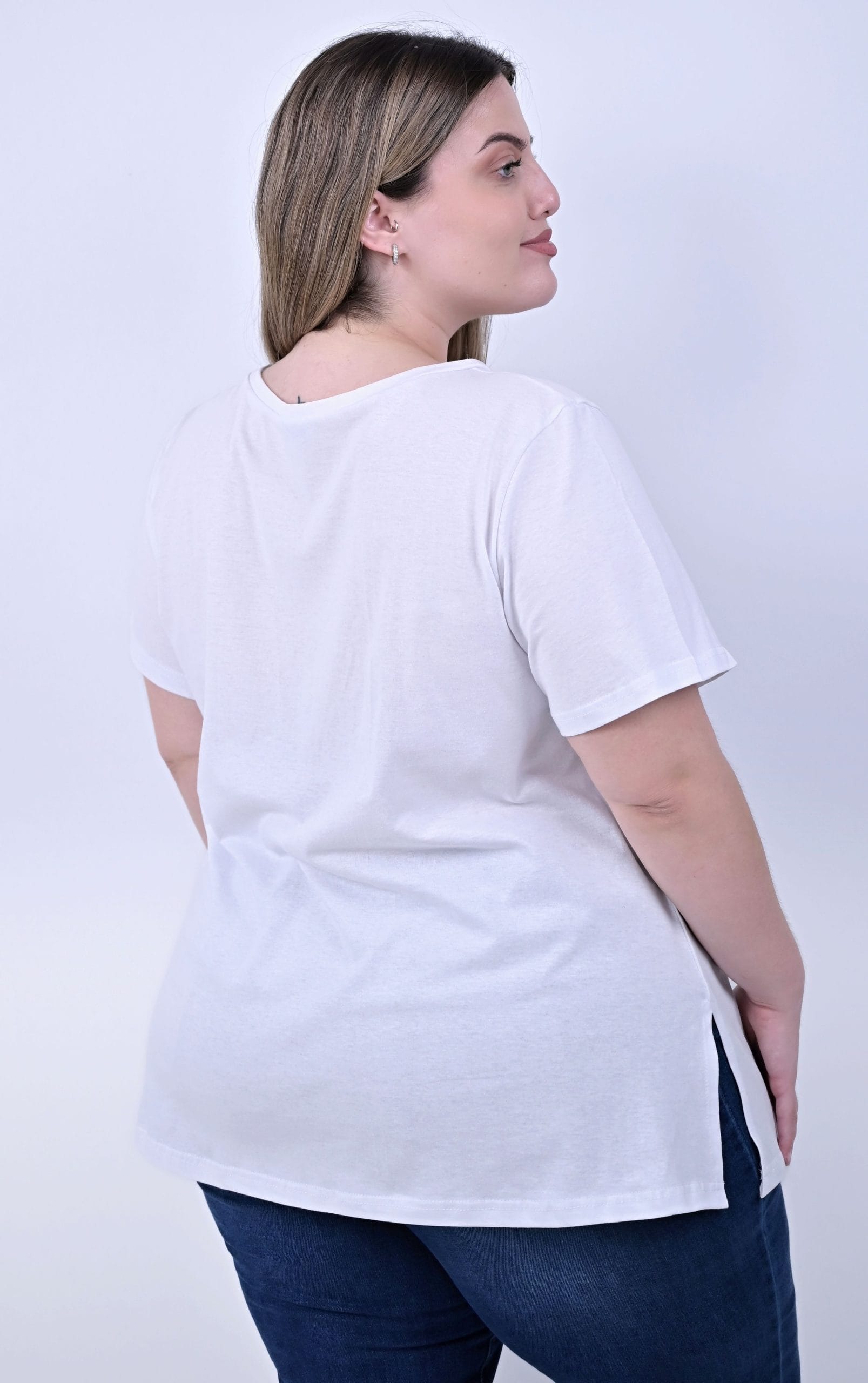 Ανανεώστε τη συλλογή σας με αυτή τη plus size λευκή μπλούζα από 100% βαμβάκι, σχεδιασμένη για καθημερινή άνεση και ευχάριστη εφαρμογή. Το σταθερό ύφασμα προσφέρει φυσική αίσθηση στο δέρμα και υποστηρίζει σωστά το σώμα, χωρίς να κολλάει.