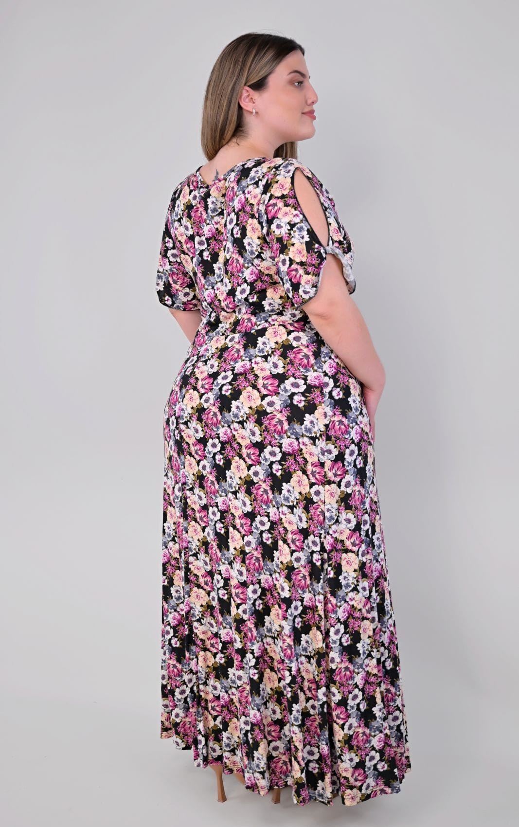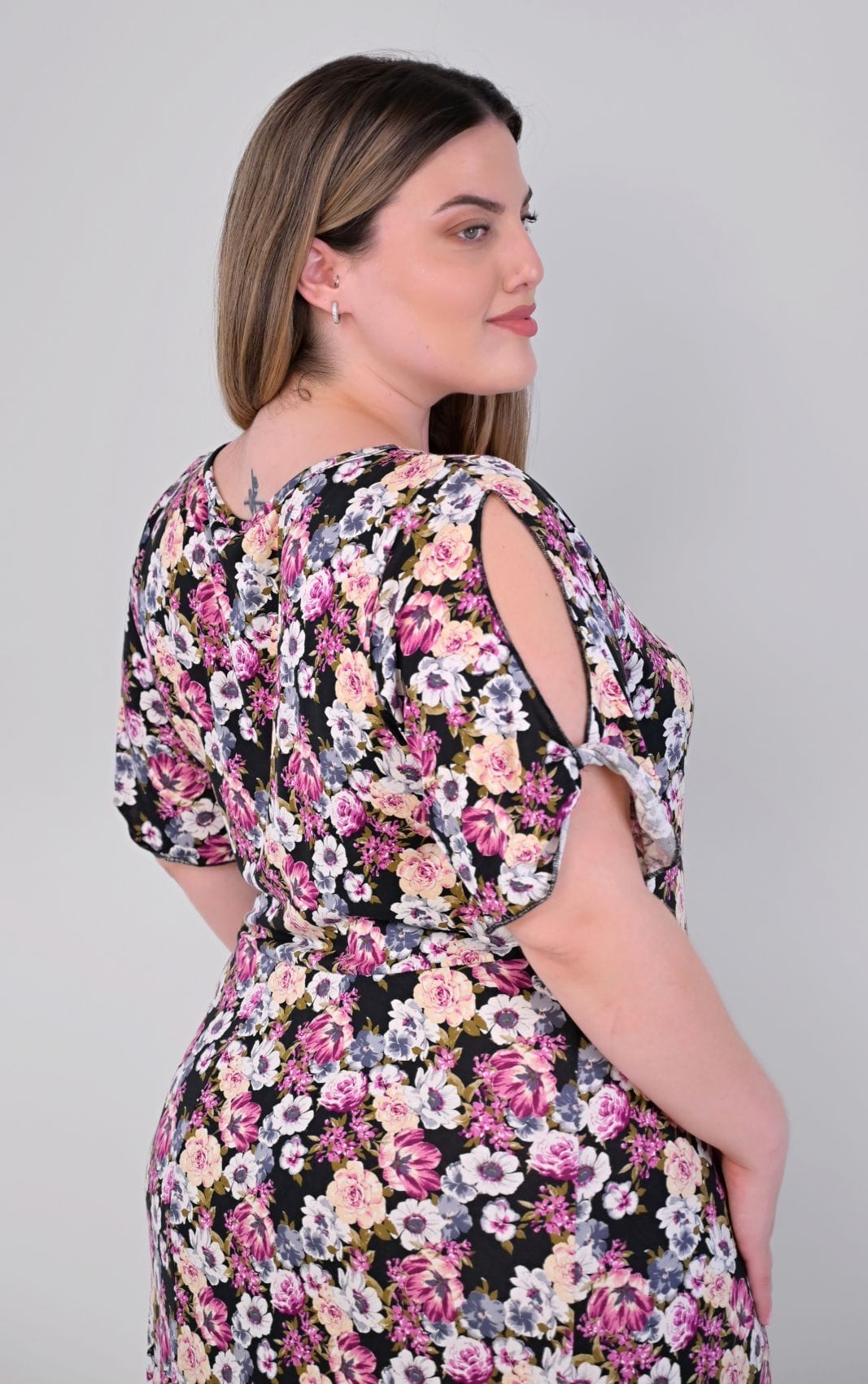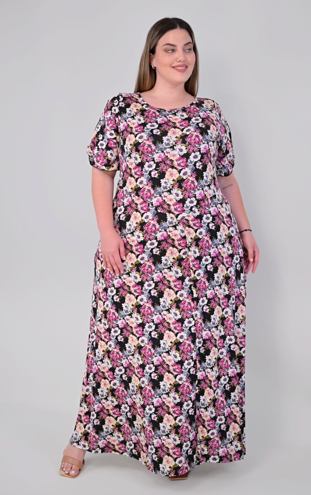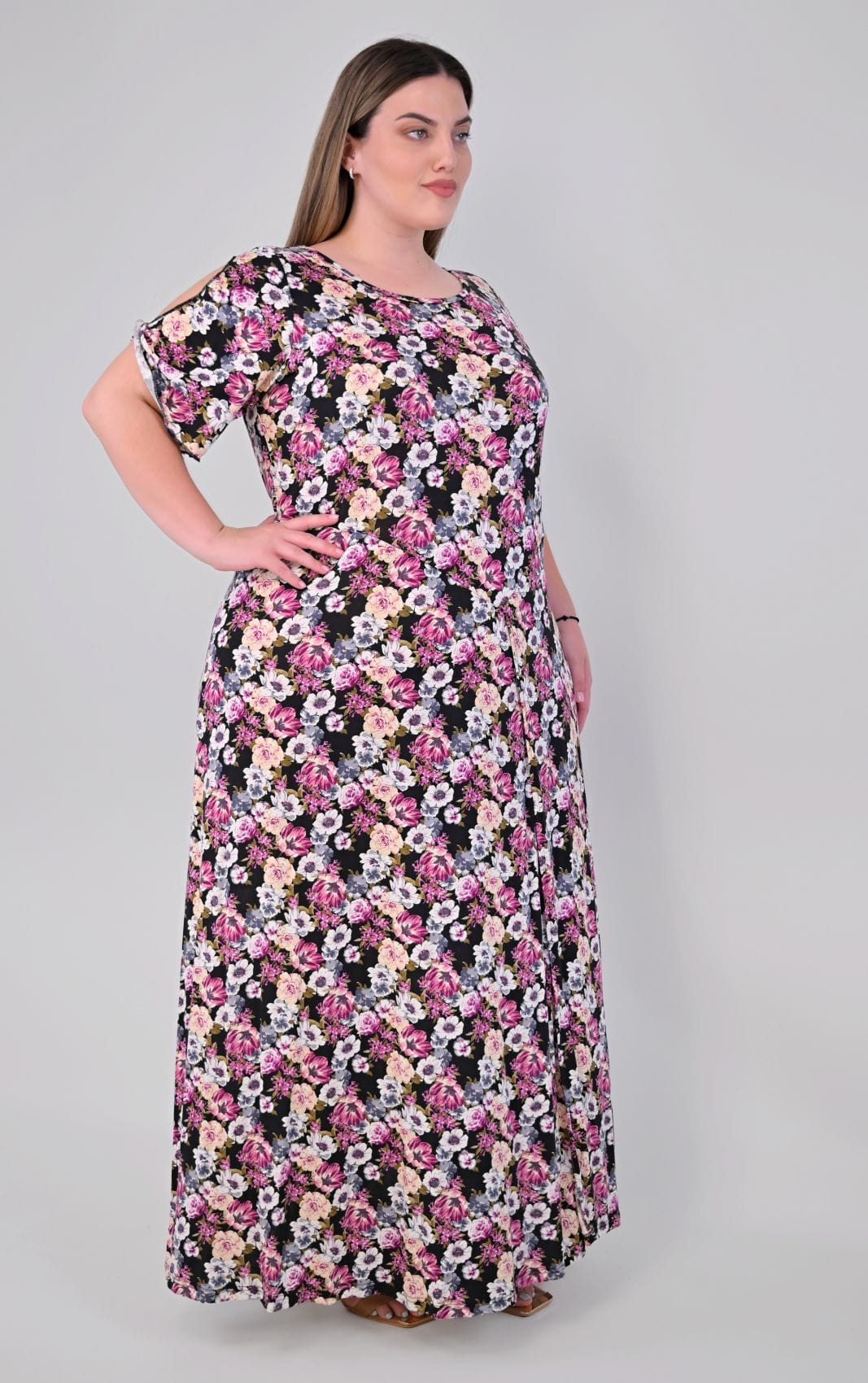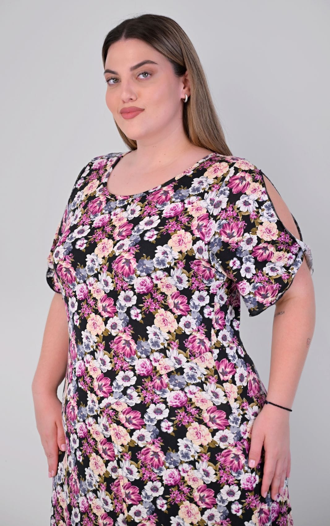Κατασκευασμένο από ποιοτικό, ρευστό ύφασμα, αυτό το φόρεμα προσφέρει μια υπέροχη, αέρινη κίνηση στο περπάτημα. Η άνετη plus size γραμμή του πέφτει αρμονικά στο σώμα, αγκαλιάζοντας τις καμπύλες χωρίς να τις περιορίζει. Διαθέτει κλασική στρογγυλή λαιμόκοψη και μανίκια με διακριτικό άνοιγμα στο μπράτσο, που κλείνουν με μικρό γύρισμα για κομψή λεπτομέρεια. Στη μία πλευρά του φορέματος υπάρχει πλαϊνό σκίσιμο που φτάνει μέχρι το μπούτι, προσδίδοντας ζωντάνια και πρακτικότητα.