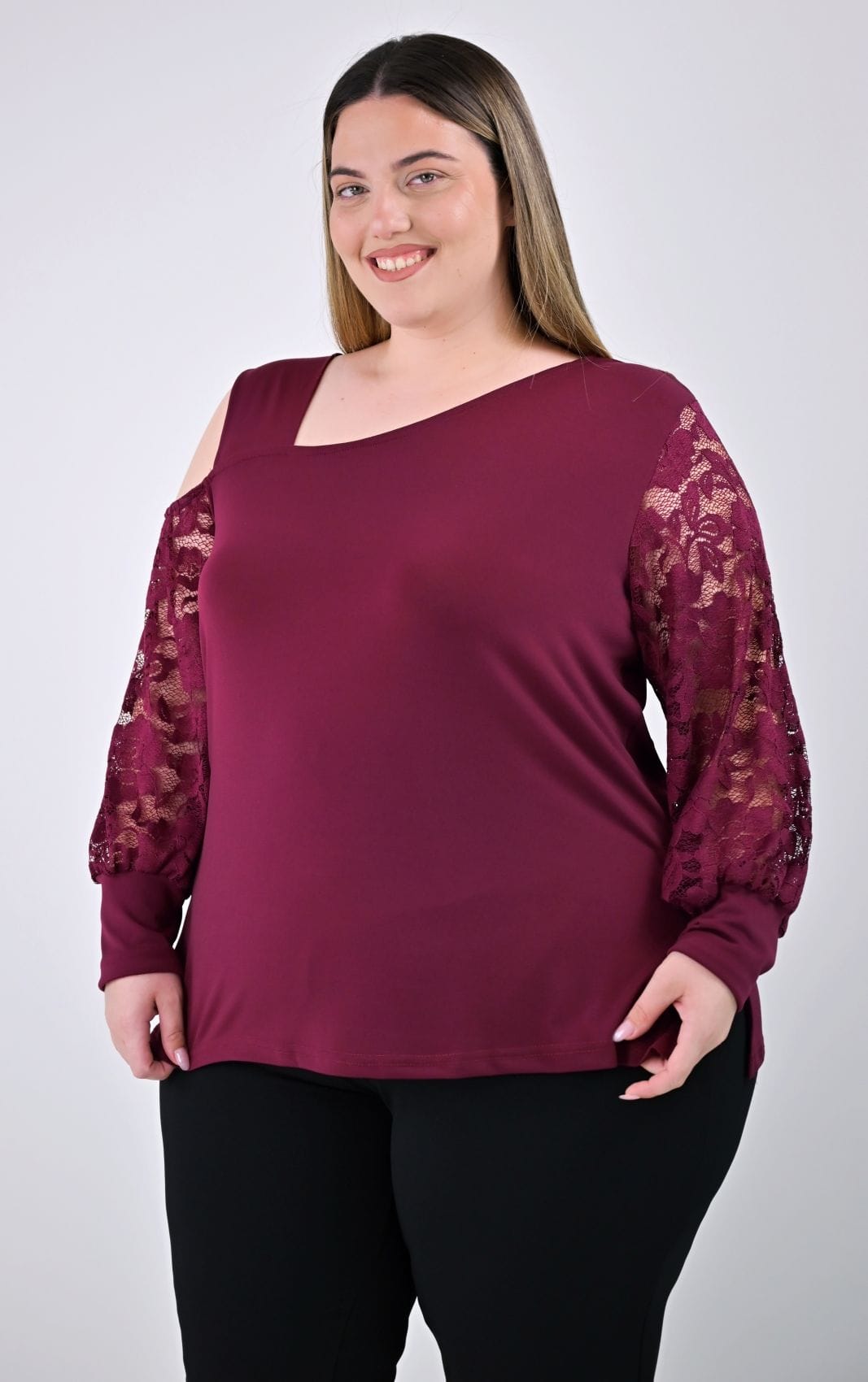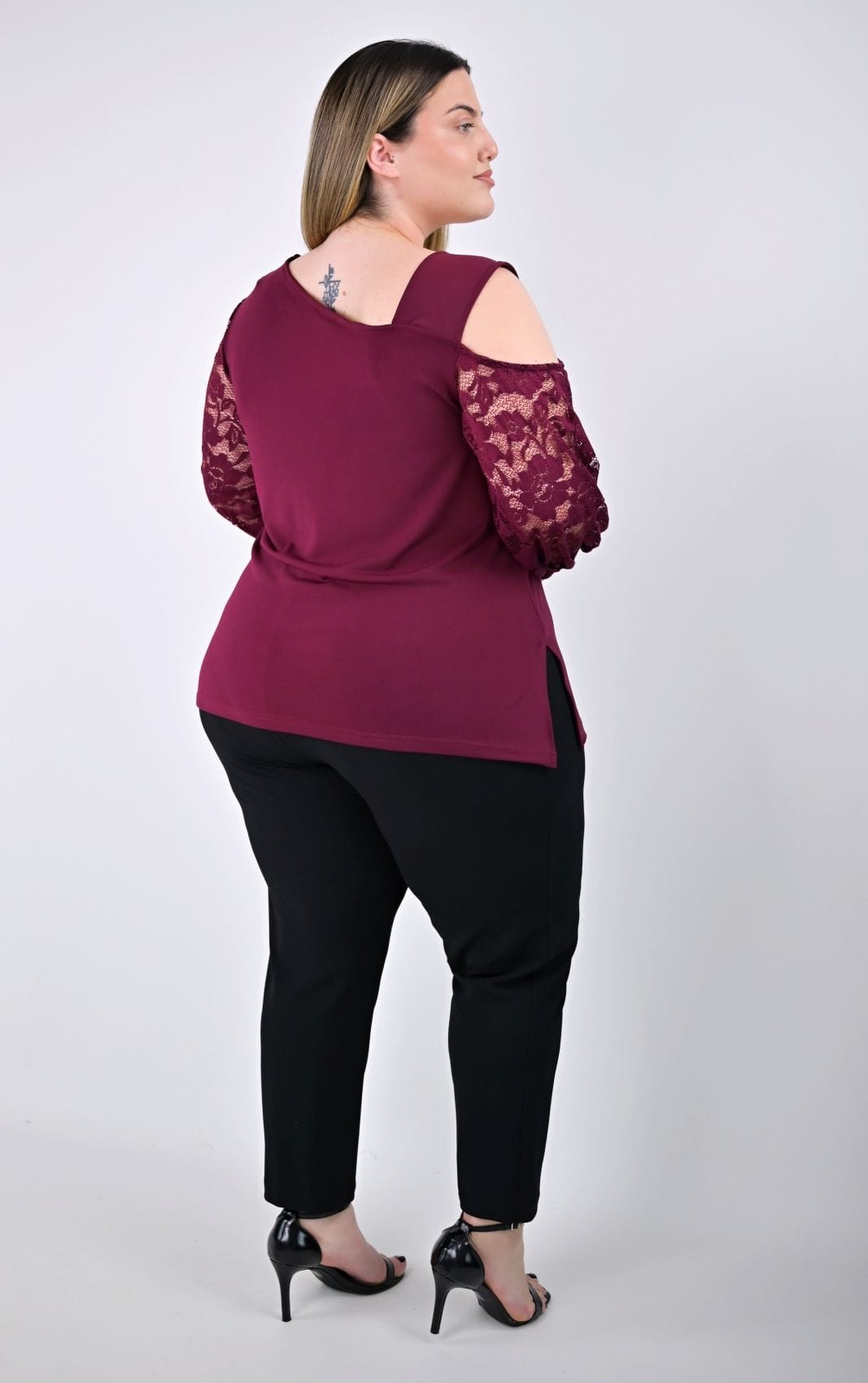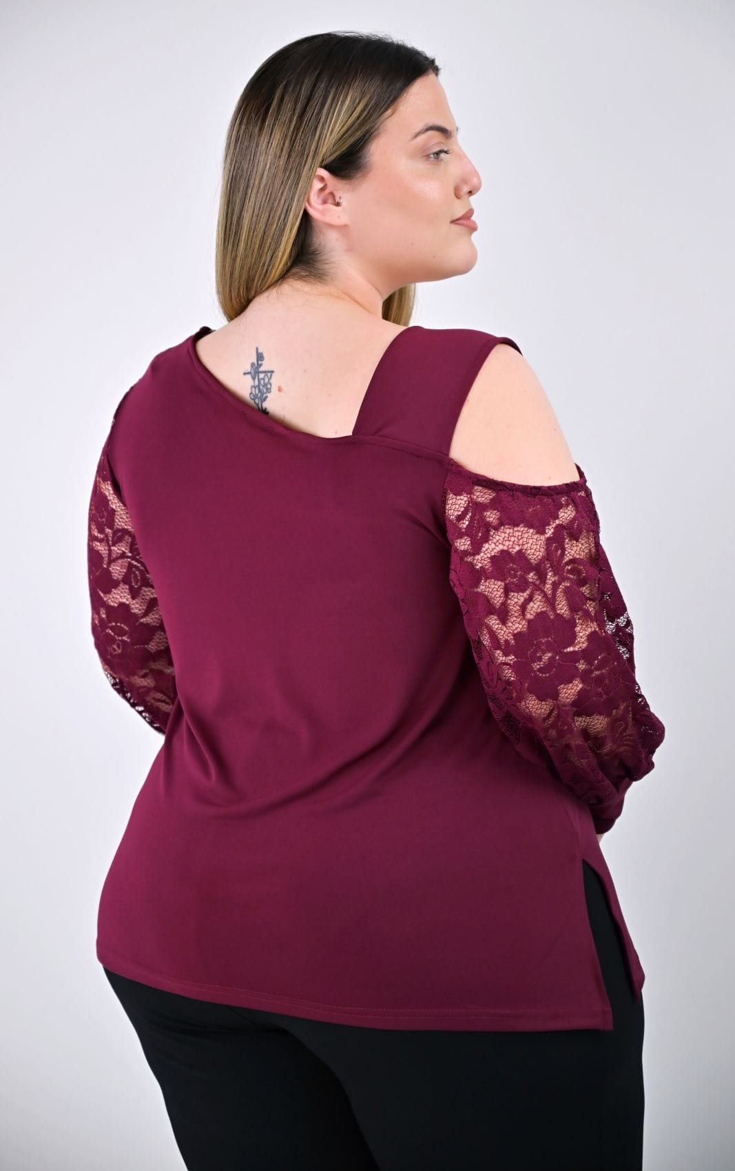 Μπλούζα Μπορντό με Δαντέλα και Έναν Ώμο Έξω