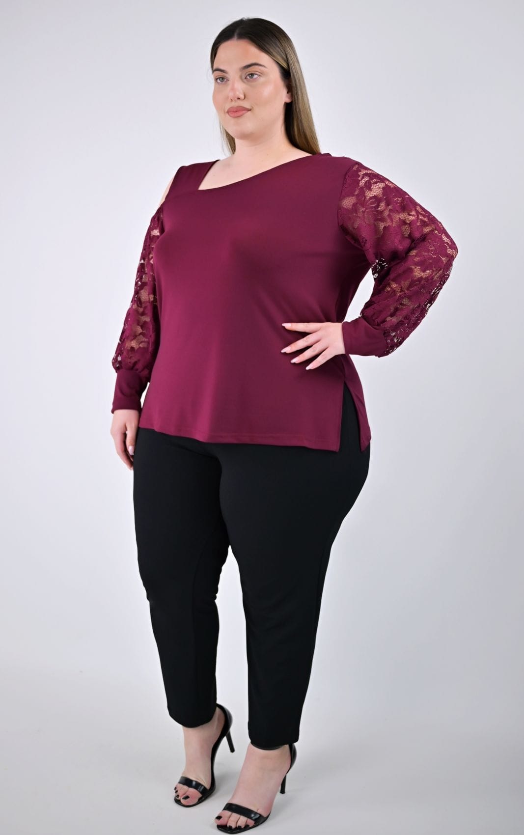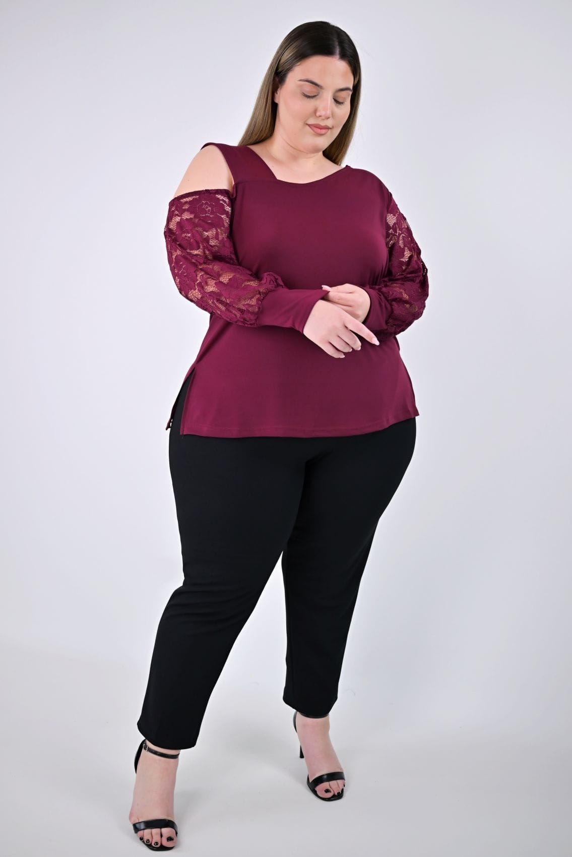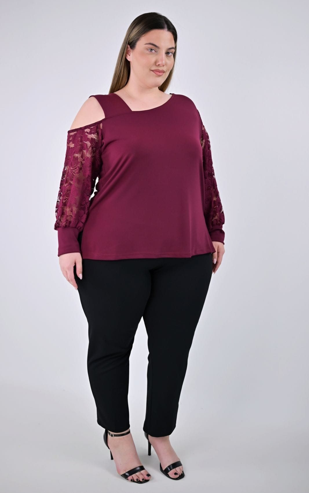 Μπλούζα Μπορντό με Δαντέλα και Έναν Ώμο Έξω
