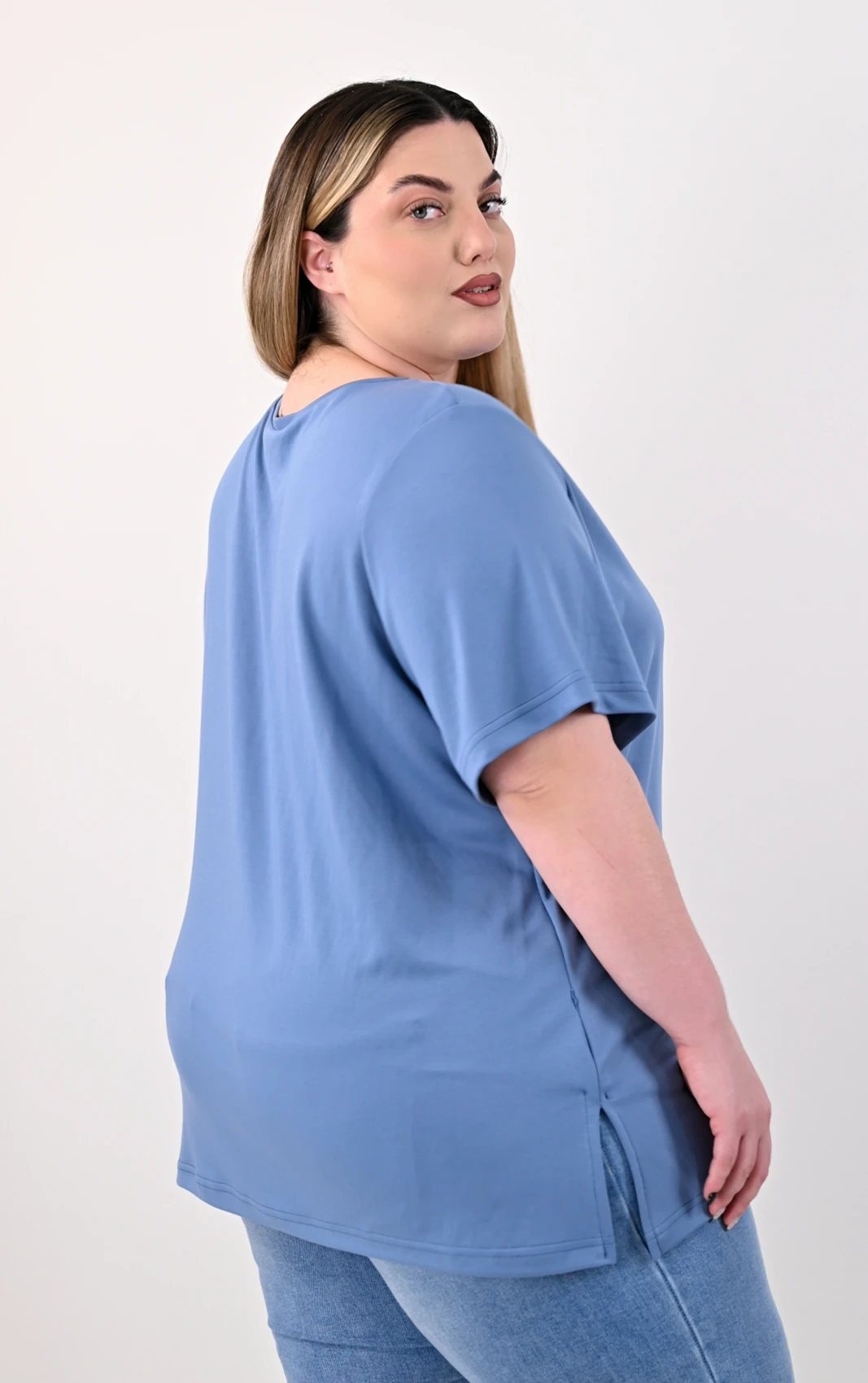 1. Πώς είναι η εφαρμογή της μπλούζας; Η γραμμή της είναι φαρδιά και δεν κολλάει στο σώμα. Τα ανοίγματα στο πλάι δίνουν επιπλέον άνεση στην κίνηση.