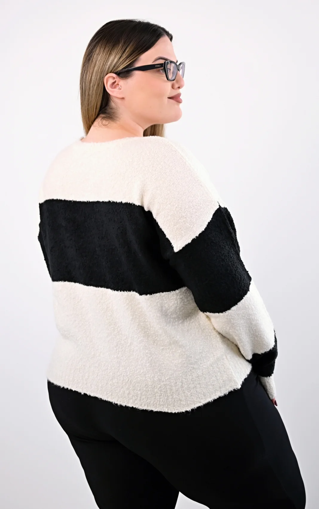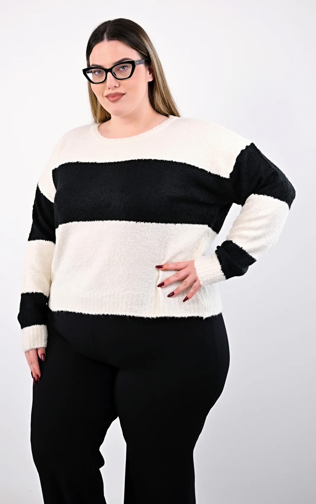 Αναβαθμίστε το καθημερινό σας στυλ με αυτό το plus size πλεκτό crop top, ιδανικό για τις πιο δροσερές μέρες. Η πλέξη του είναι μαλακή και αφράτη, προσφέροντας μια αίσθηση άνεσης και ζεστασιάς. Το μοντέρνο σχέδιο με φαρδιές ρίγες σε ασπρόμαυρο είναι διαχρονικό και στυλάτο, κάνοντας το ένα ευκολοφόρετο και εντυπωσιακό κομμάτι. Η χαλαρή, άνετη γραμμή του αγκαλιάζει τη σιλουέτα χωρίς να περιορίζει τις κινήσεις, ενώ το cropped μήκος του είναι ιδανικό για σύγχρονους συνδυασμούς με ψηλόμεσα ρούχα.