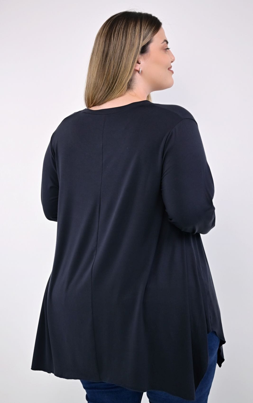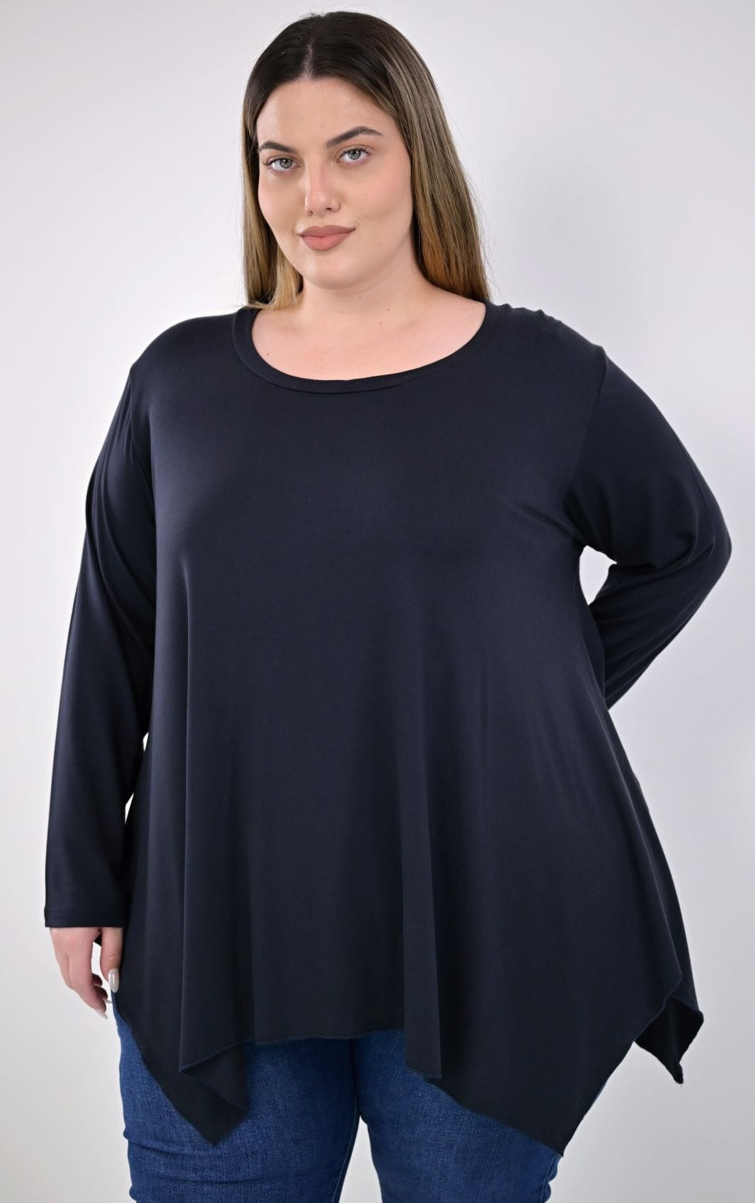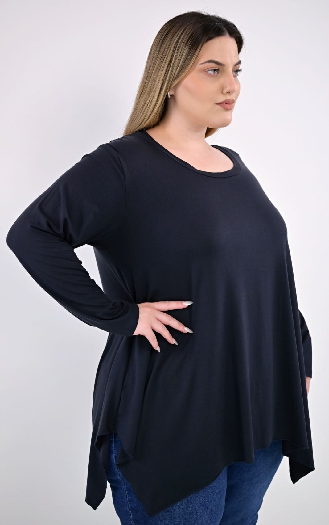 Η γραμμή της είναι άνετη, με ελαφριά Α εφαρμογή που δεν αγκαλιάζει σφιχτά το σώμα, αλλά ακολουθεί αρμονικά τη σιλουέτα χωρίς να την περιορίζει. Το χαρακτηριστικό που κάνει τη μπλούζα να ξεχωρίζει είναι το ασύμμετρο τελείωμα που προσδίδει μοντέρνο ύφος και κολακεύει τη γραμμή του σώματος. Το μήκος της καλύπτει επαρκώς την περιφέρεια, καθιστώντας τη ιδανική επιλογή για συνδυασμούς με κολάν ή στενά παντελόνια.