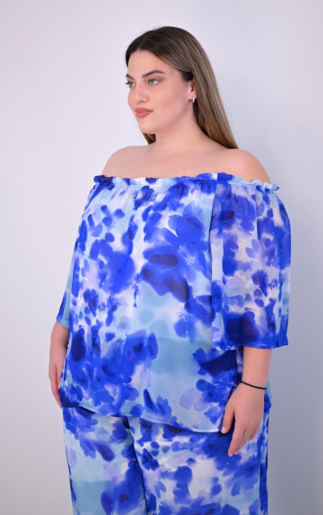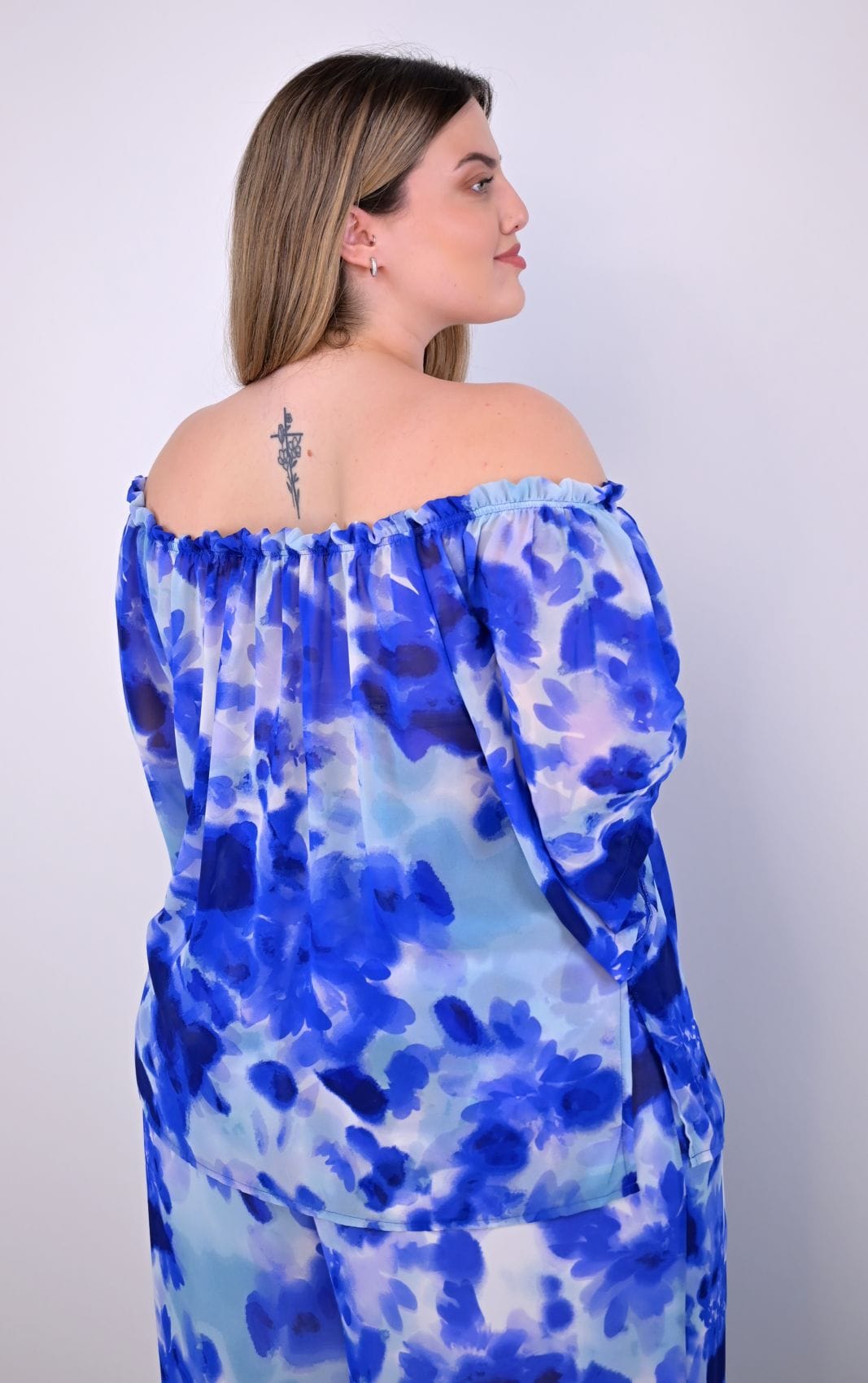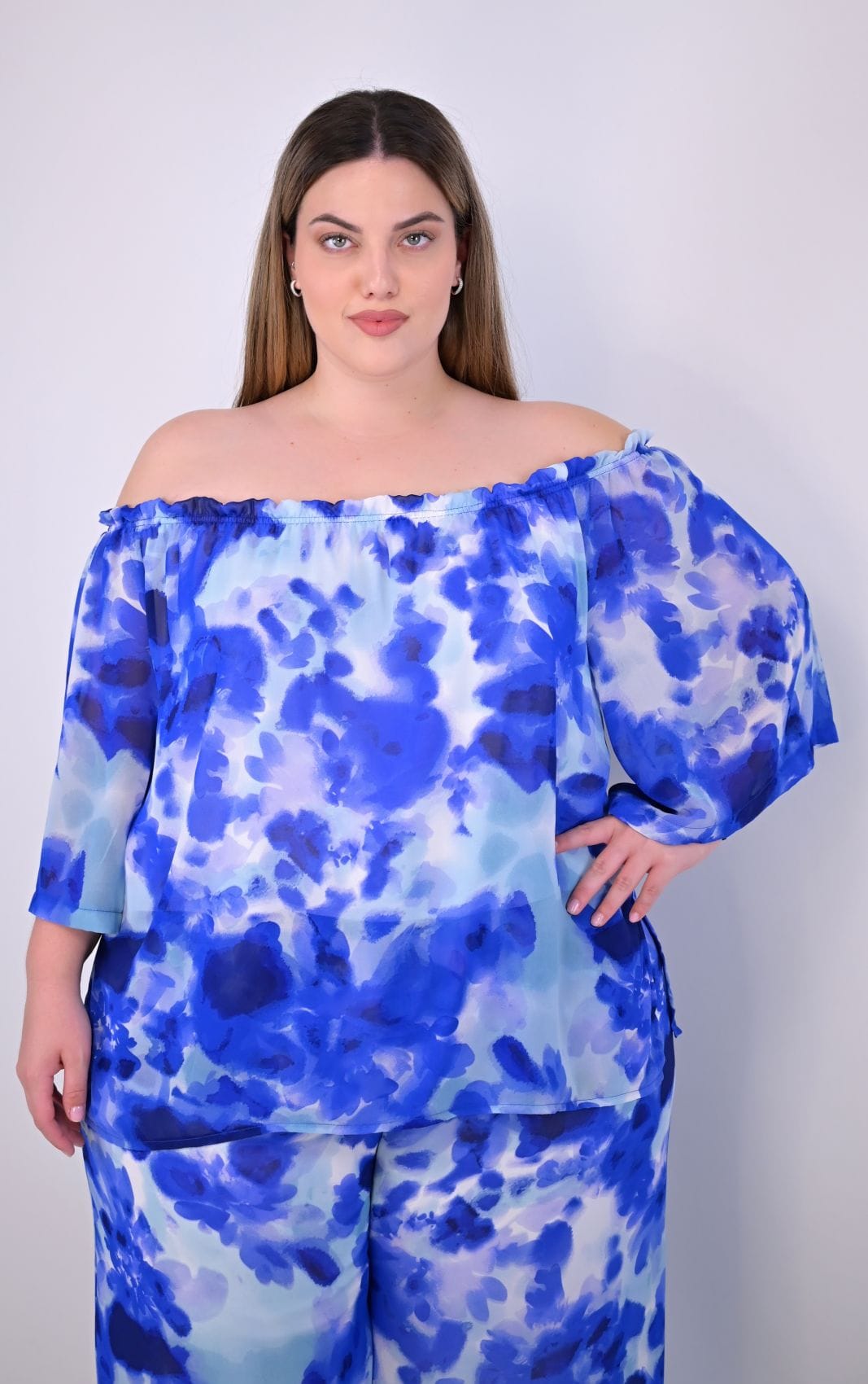 Η plus size μπλούζα αυτή είναι φτιαγμένη από ζορζέτα με μπλε εμπριμέ σχέδιο, συνδυάζοντας ελαφρύ και αέρινο ύφασμα με πλήρη φόδρα στο μπροστινό μέρος που εξασφαλίζει κάλυψη στο δέρμα. Διαθέτει άνοιγμα ώμων με λάστιχο που δημιουργεί έναν θηλυκό, ανοιχτό λαιμό και φαρδιά μανίκια για άνεση και ελευθερία κινήσεων. Ιδανική επιλογή για casual αλλά και πιο επίσημες εμφανίσεις.
