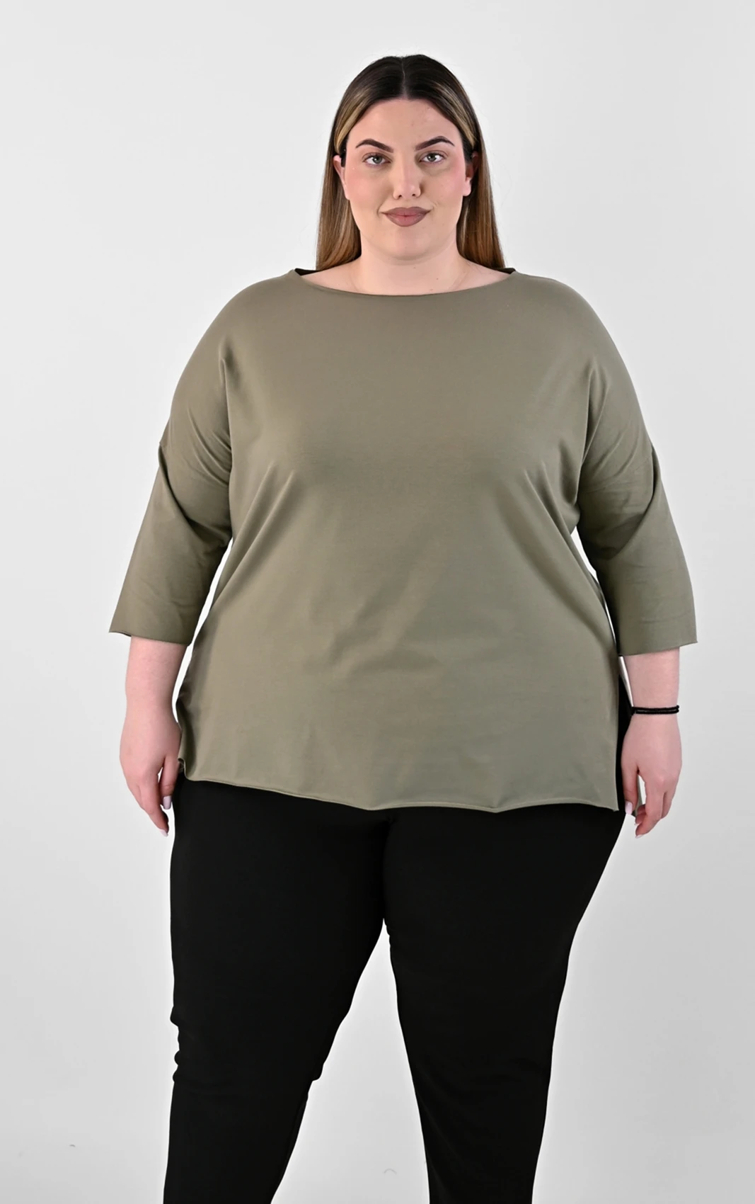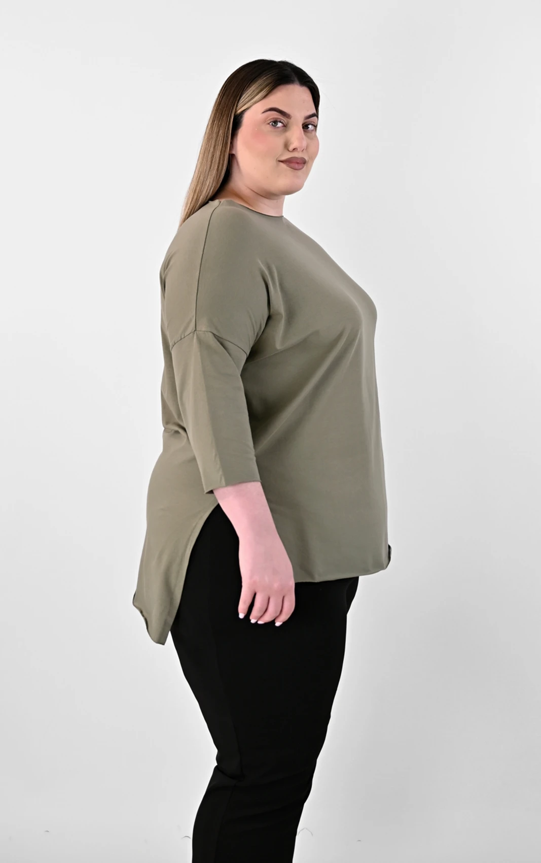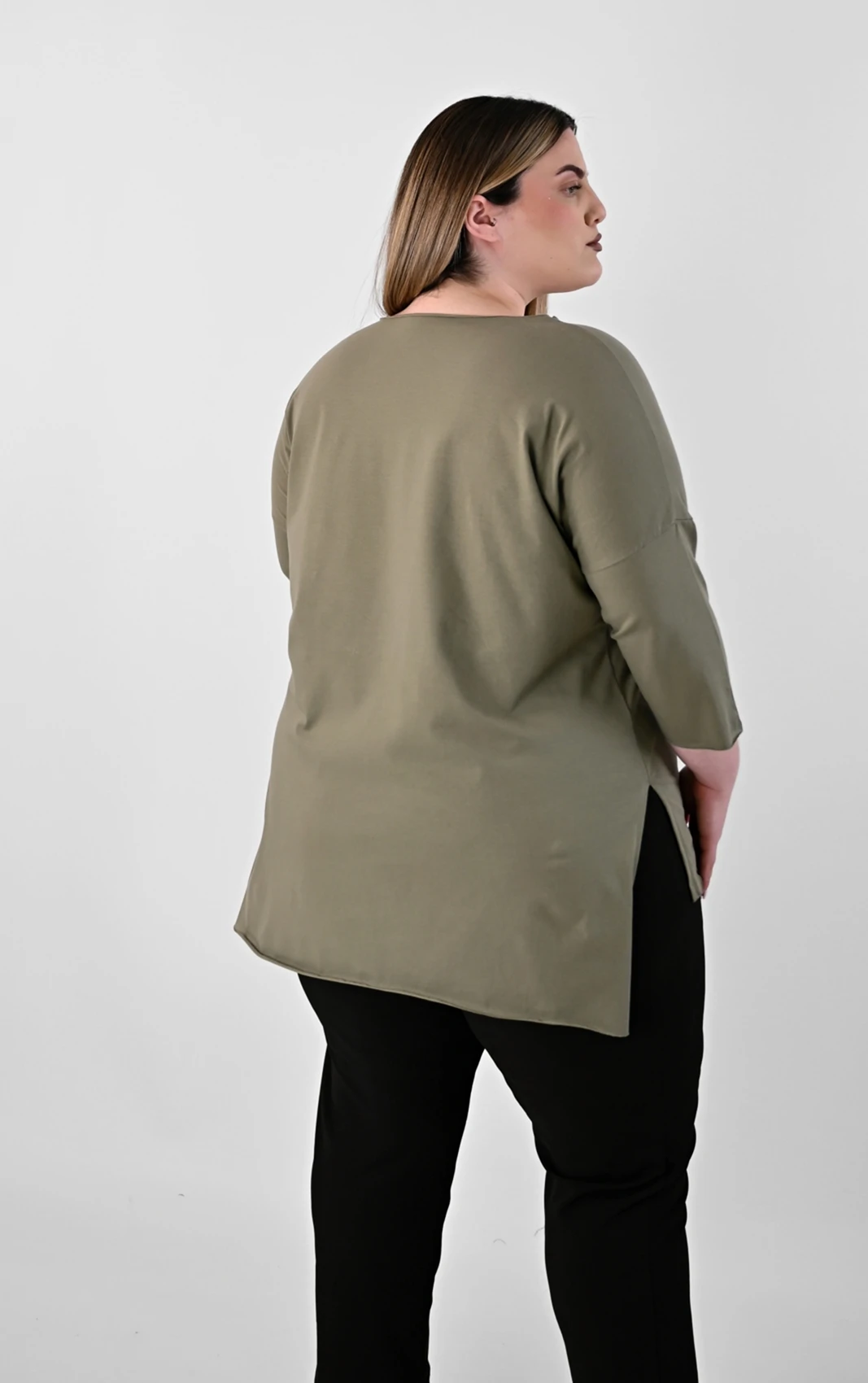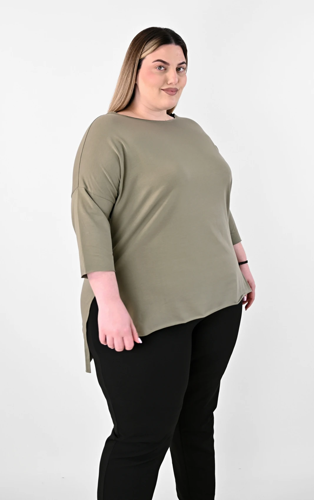 Χακί Μπλούζα με Μανίκι 3/4 και Πλαϊνά Ανοίγματα