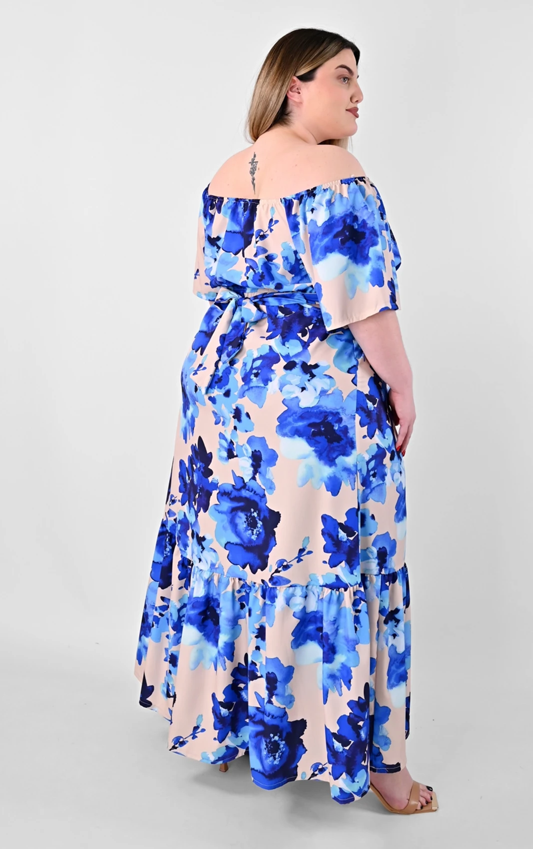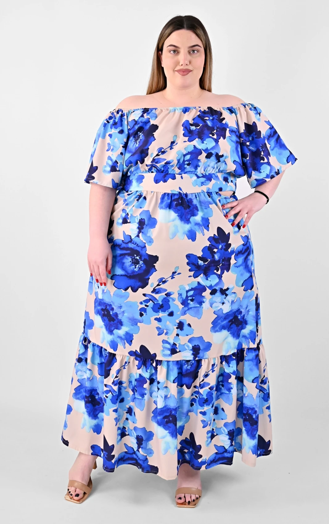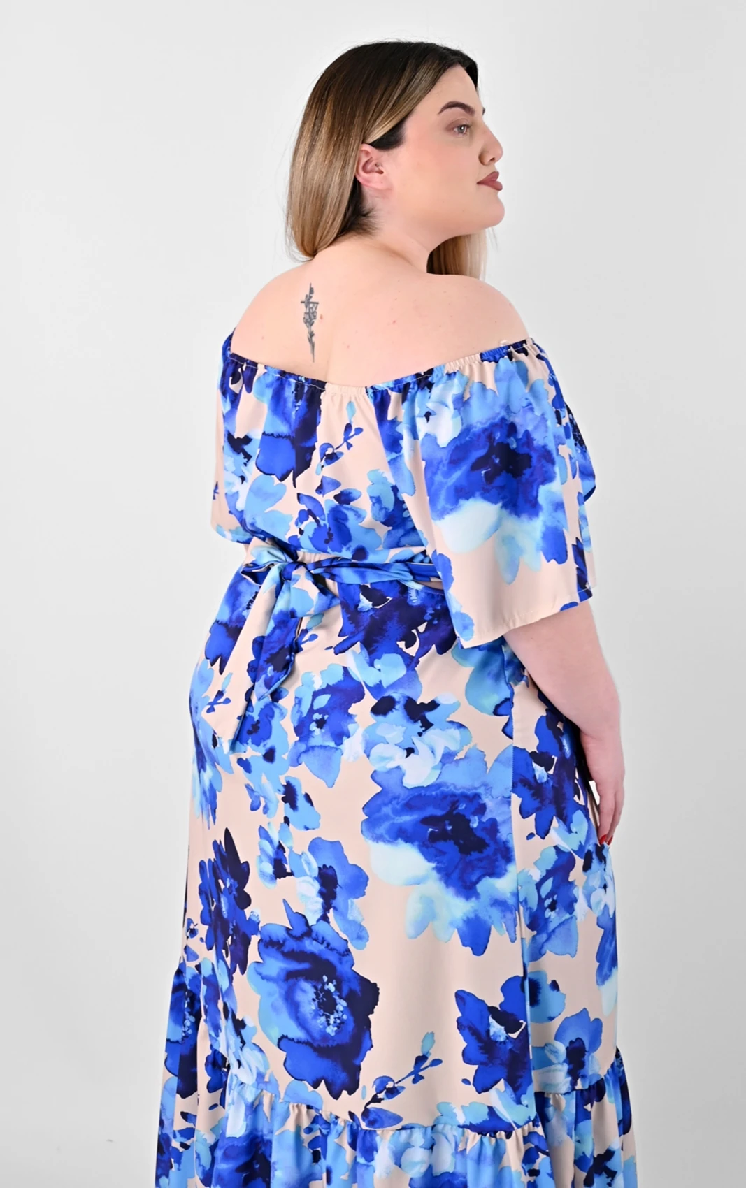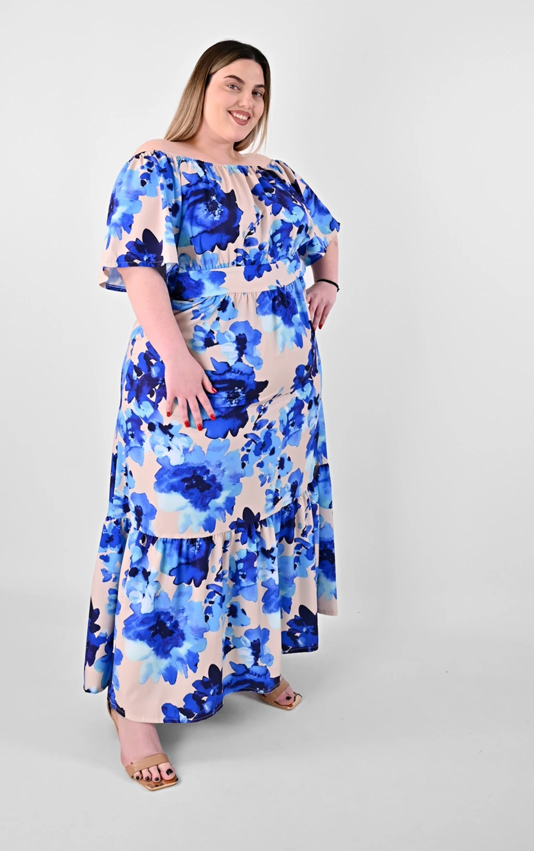 Αναδείξτε την πιο ρομαντική σας πλευρά με αυτό το μάξι floral φόρεμα, που συνδυάζει την αέρινη κίνηση με τις τολμηρές λεπτομέρειες. Το λάστιχο στο ντεκολτέ σάς επιτρέπει να το φορέσετε είτε κανονικά είτε με τους ώμους έξω (off-the-shoulder), δημιουργώντας ένα άκρως καλοκαιρινό look στην απόλυτη απόχρωση του μπλε.