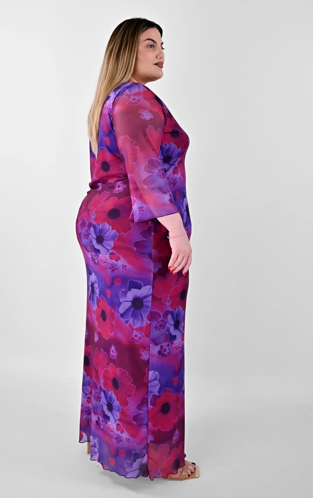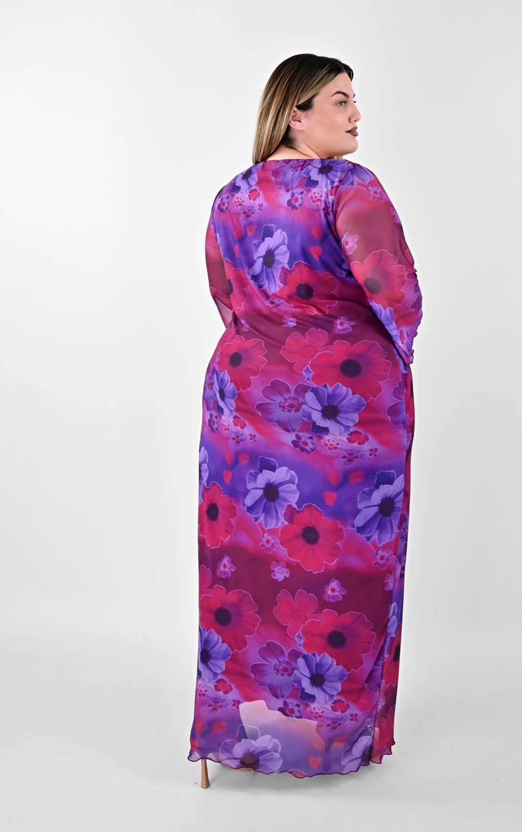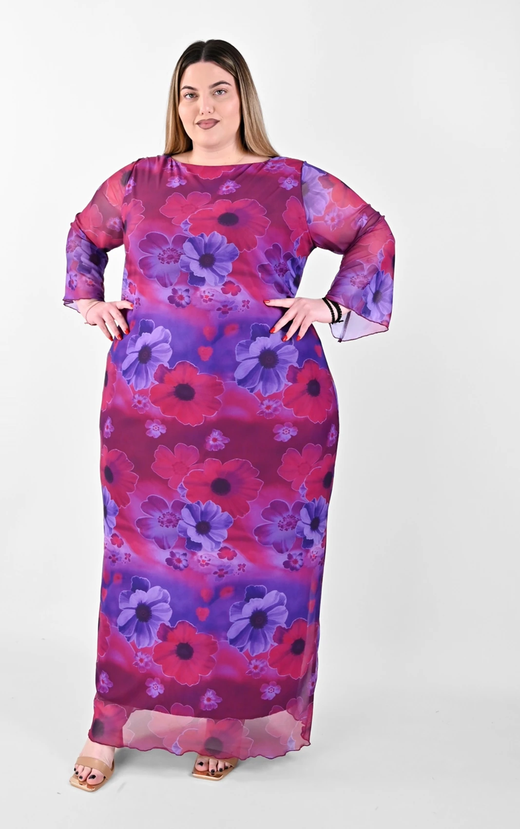 Απογειώστε το στυλ σας με αυτό το εκθαμβωτικό plus size μωβ floral τούλινο φόρεμα. Είναι ένα κομμάτι που συνδυάζει την αέρινη αίσθηση του τούλιου με ένα ζωηρό και εντυπωσιακό floral print σε αποχρώσεις του μωβ, του φούξια και του βιολετί. Σχεδιασμένο για τη γυναίκα που θέλει να μαγνητίζει τα βλέμματα, αυτό το φόρεμα προσφέρει ρομαντισμό και δυναμισμό ταυτόχρονα. Η ελαφριά, ημιδιάφανη τούλινη στρώση πέφτει υπέροχα πάνω από την εσωτερική φόδρα, δημιουργώντας μια αίσθηση κίνησης και χάρης, ενώ η άνετη γραμμή του αγκαλιάζει τις καμπύλες χωρίς να τις πιέζει.