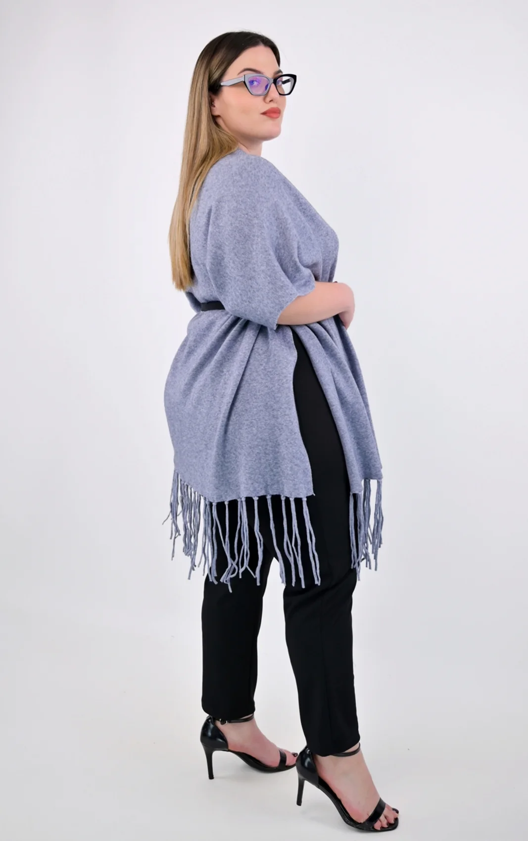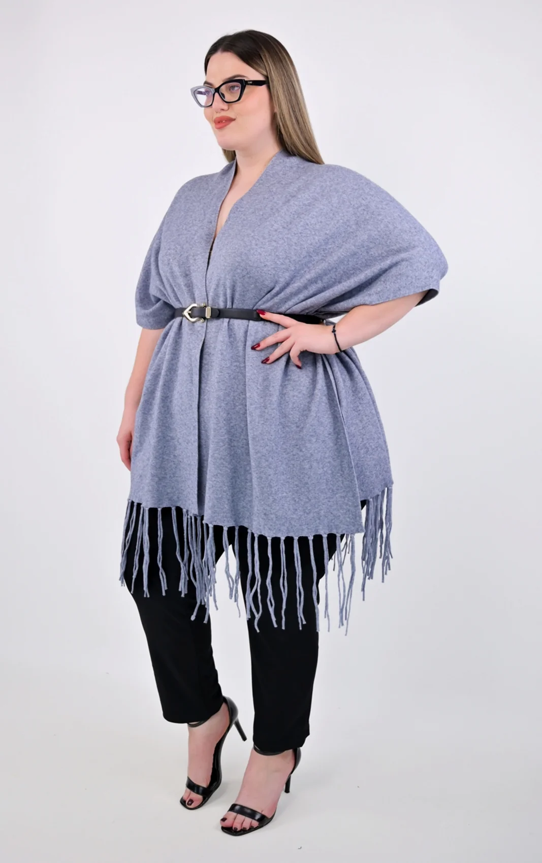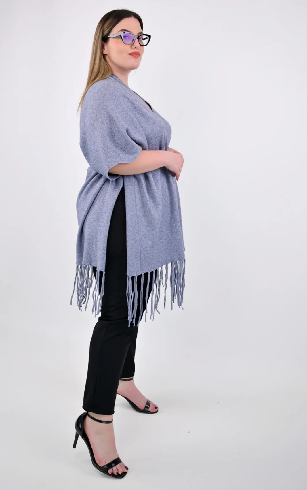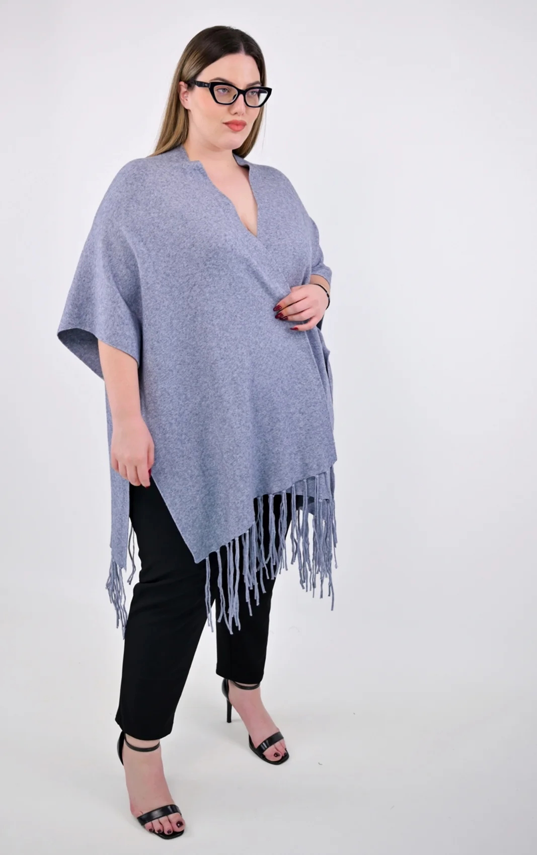 Πλεκτή Κάπα-Poncho Γκρι με Κρόσσια