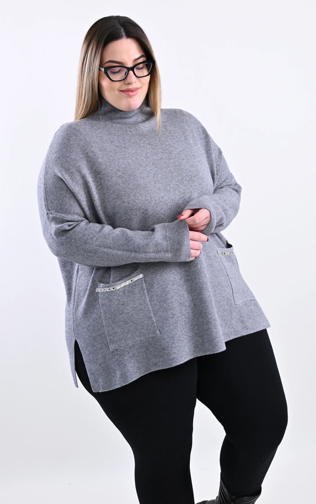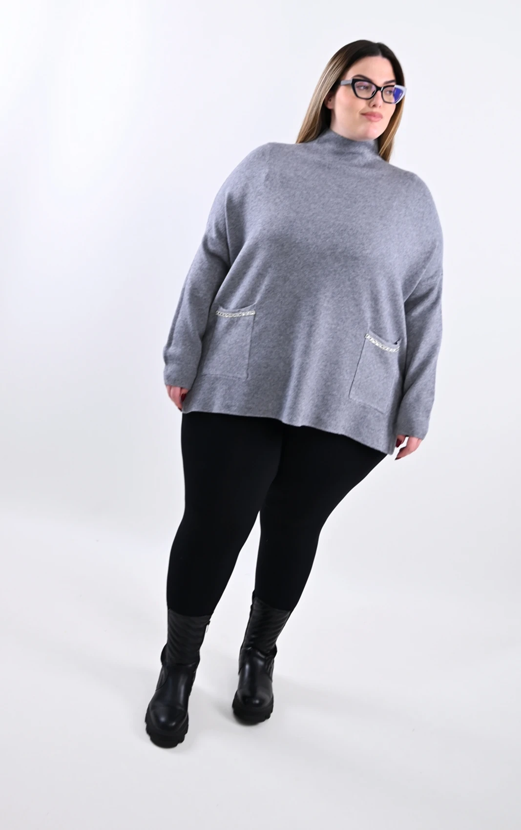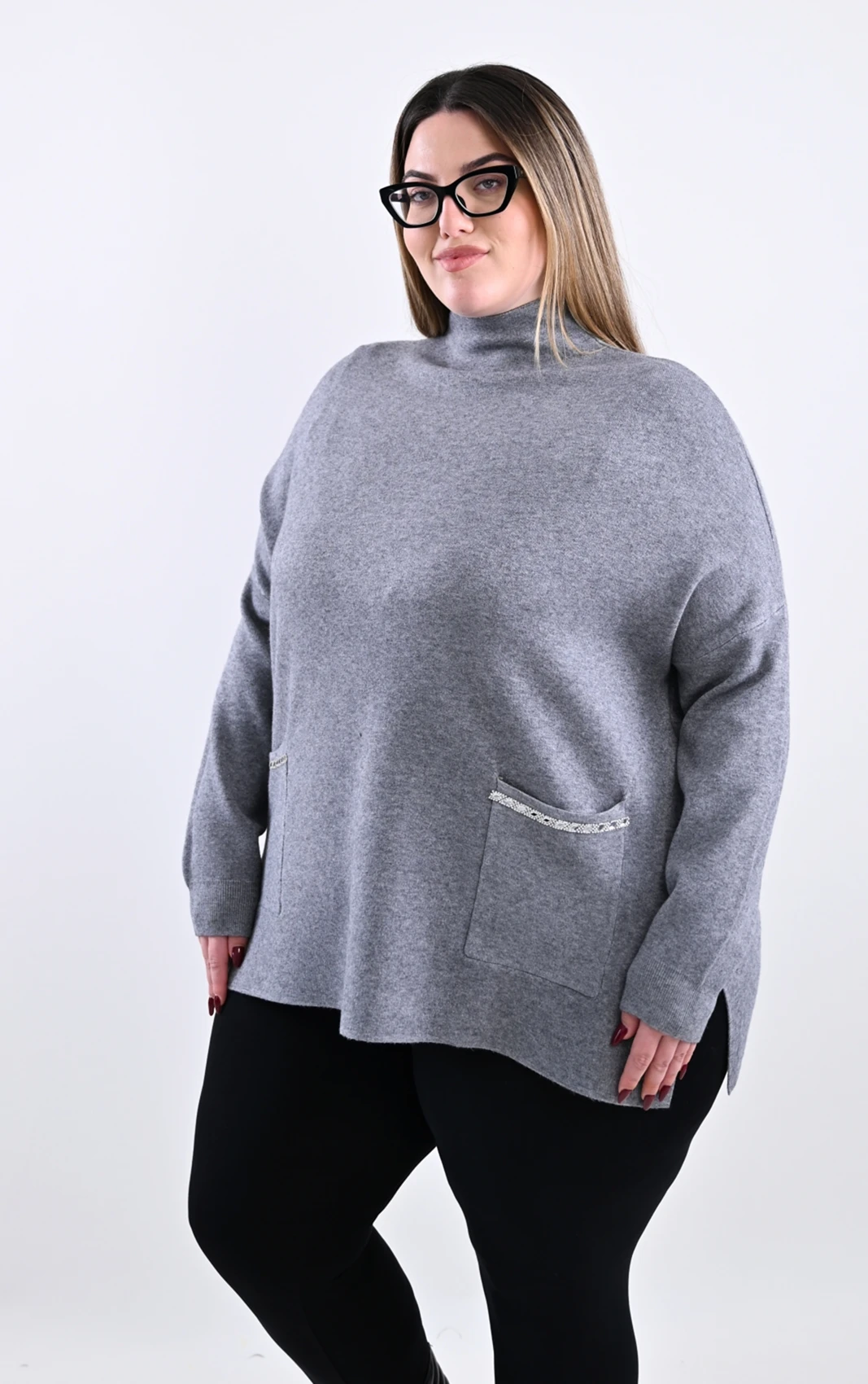 Γκρι Πλεκτή Μπλούζα με Τσέπες