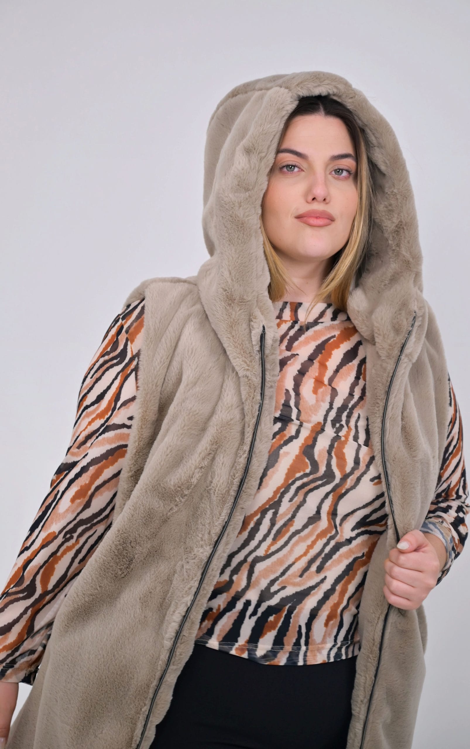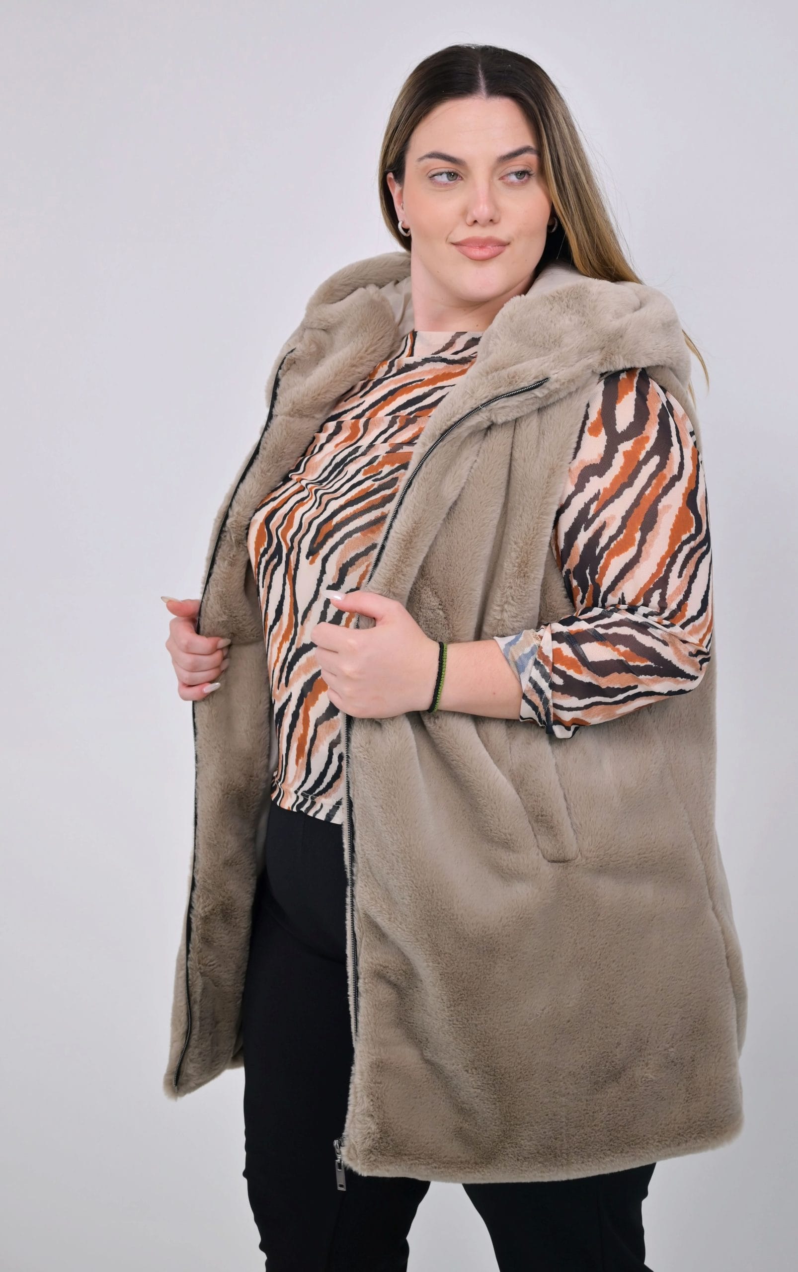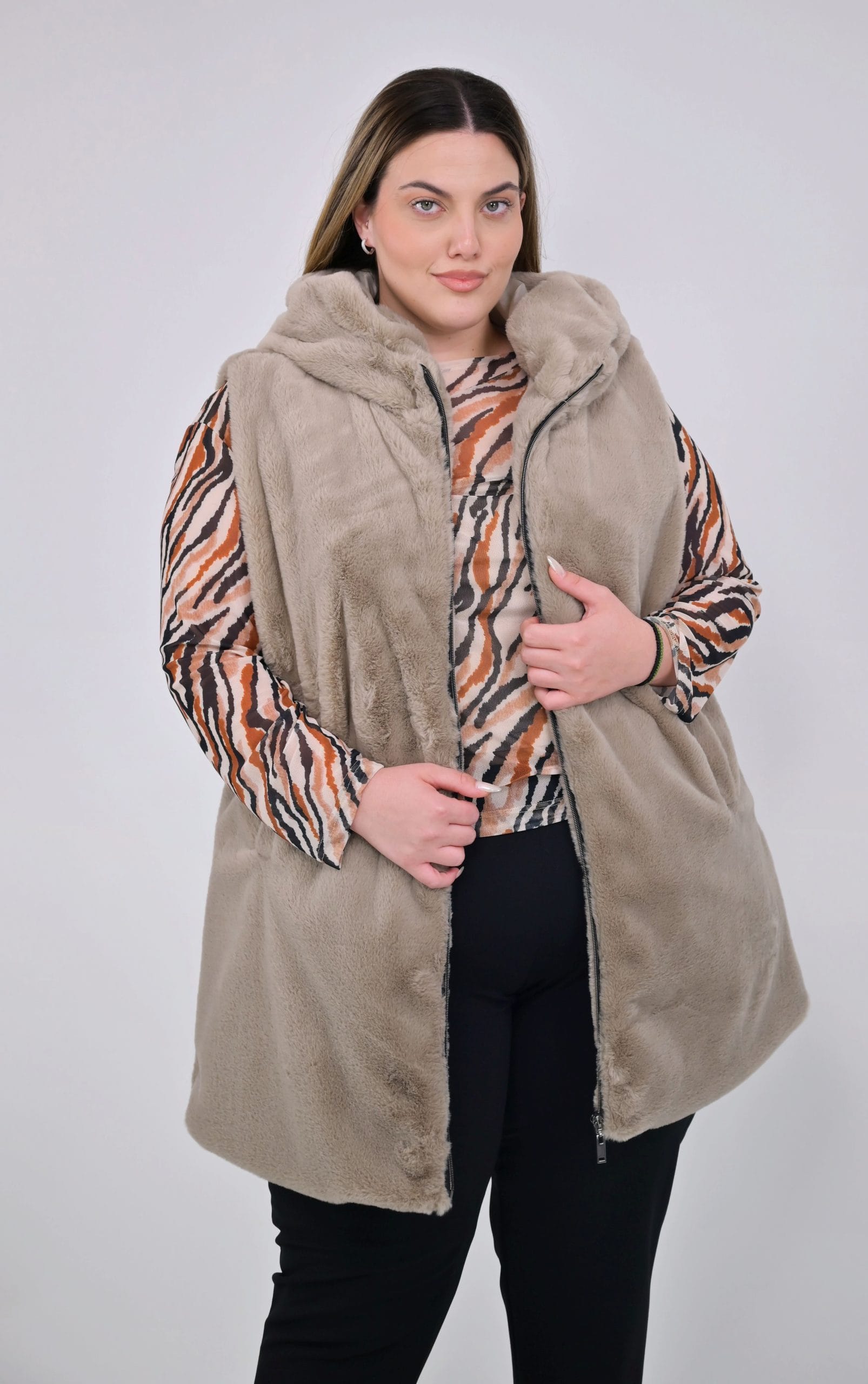 Ψάχνετε ένα βασικό κομμάτι για την γκαρνταρόμπα σας; Αυτό το plus size γούνινο γιλέκο με κουκούλα είναι η ιδανική επιλογή! Προσφέρει άνεση και στυλ σε μεγάλα μεγέθη. Το γούνινο γιλέκο σε μια ζεστή και γήινη μπεζ απόχρωση γίνεται ο καλύτερος σας φίλος για τις μεταβατικές εποχές, αφού προσθέτει μια φυσική και μοντέρνα πινελιά σε κάθε σας σύνολο.