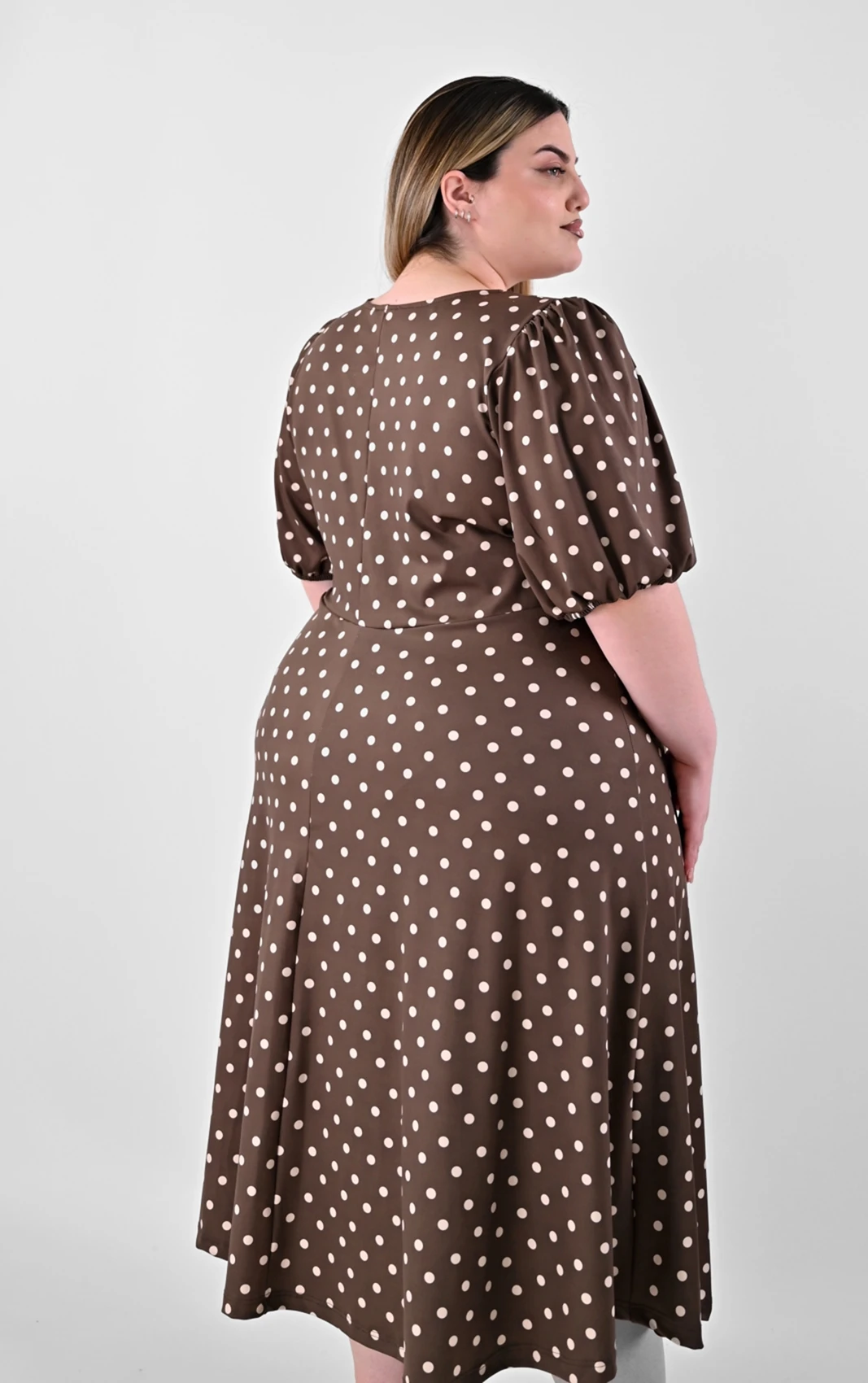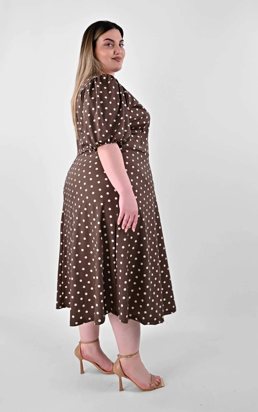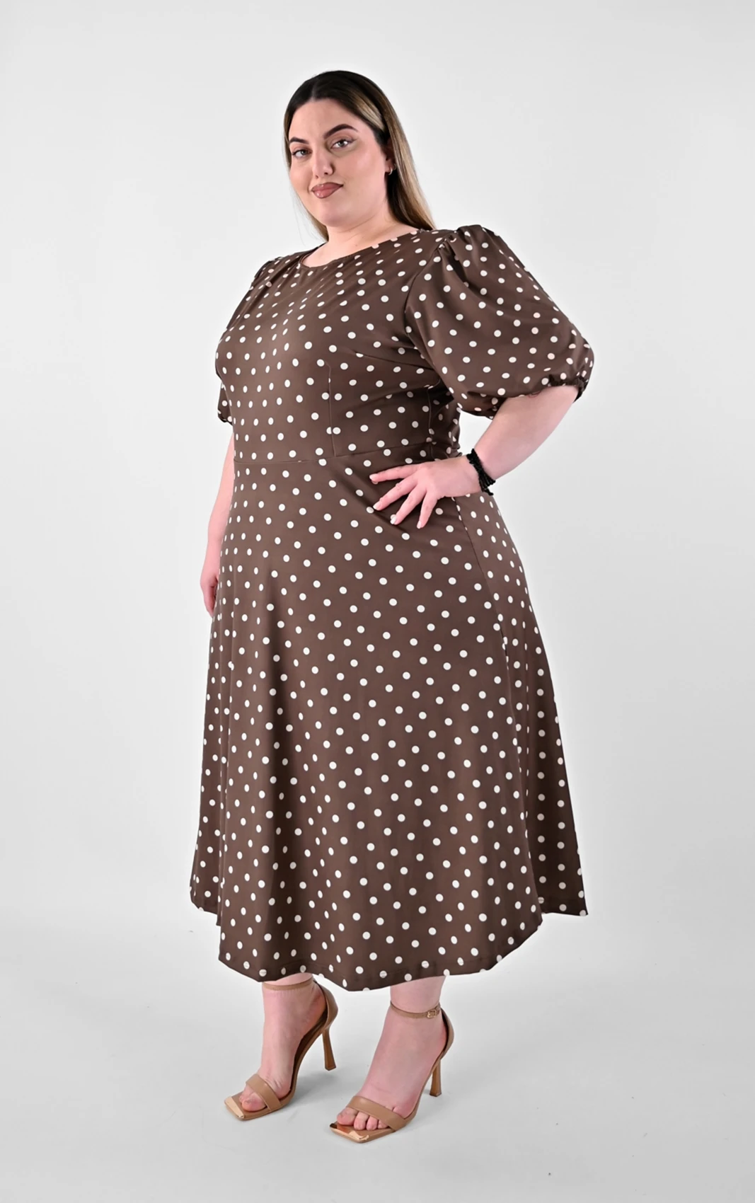 Ανακαλύψτε τη γήινη και ζεστή εκδοχή του αγαπημένου μας σχεδίου. Αυτό το Plus size midi φόρεμα σε πλούσιο καφέ χρώμα με μπεζ πουά προσφέρει μια αίσθηση διαχρονικής κομψότητας. Η άνετη γραμμή του αγκαλιάζει όμορφα τη σιλουέτα, ενώ οι διακριτικές βάτες στους ώμους προσθέτουν έναν ήπιο όγκο και εξασφαλίζουν μια σταθερή, προσεγμένη εφαρμογή.