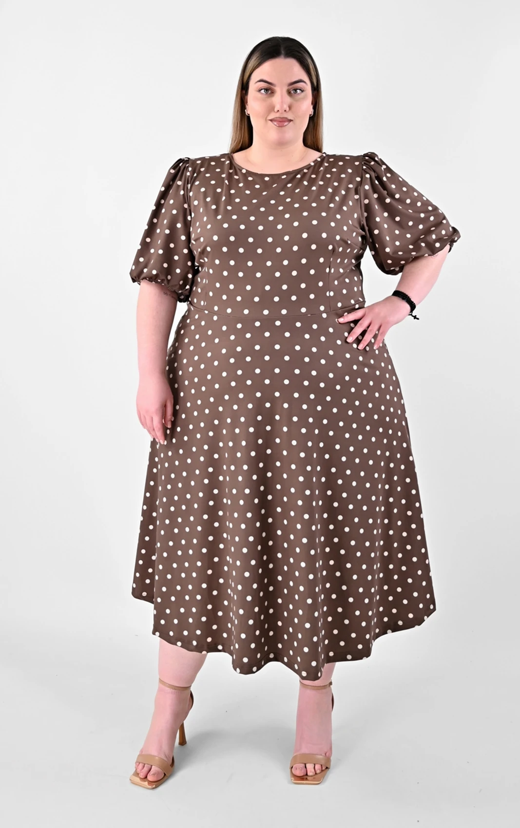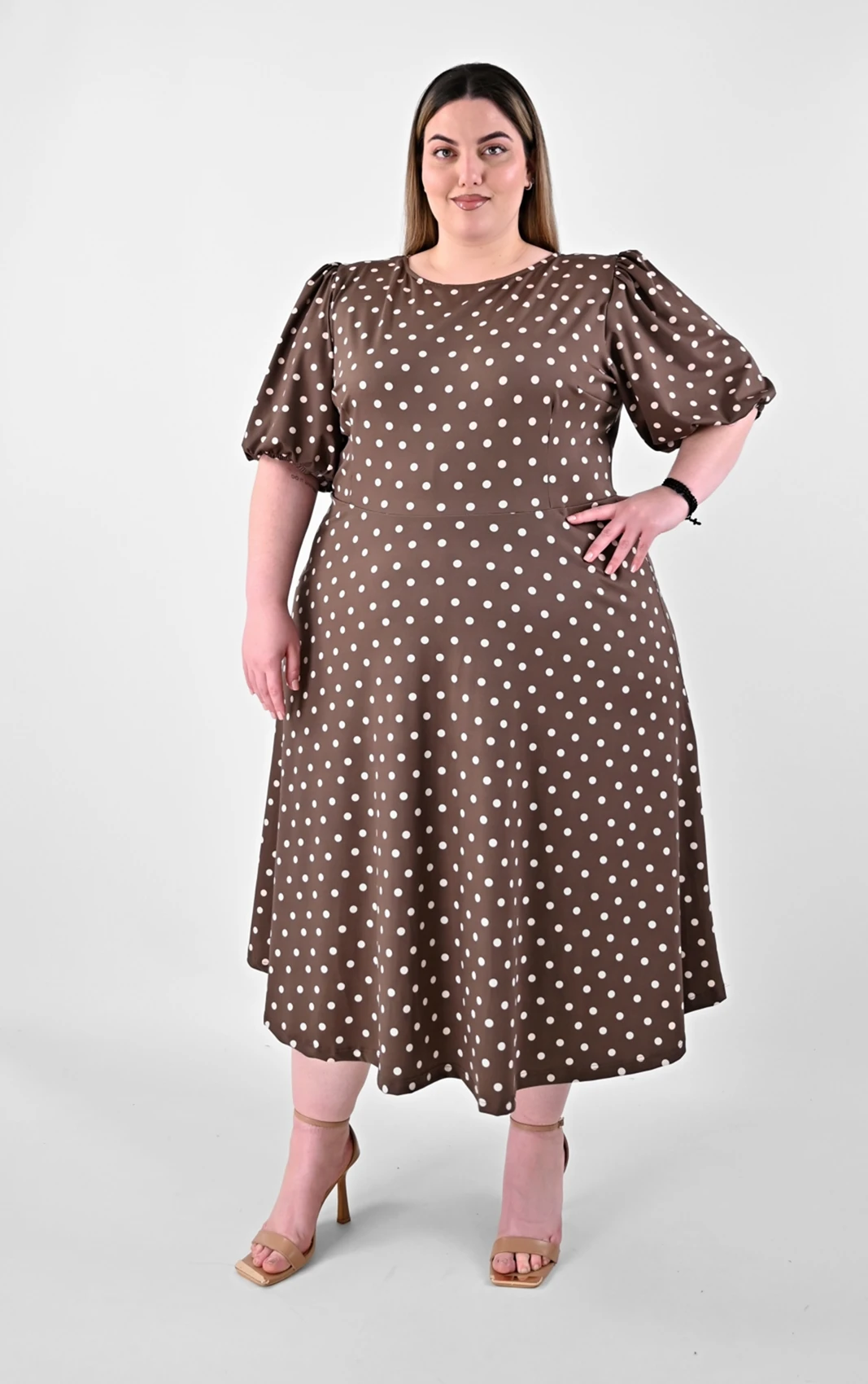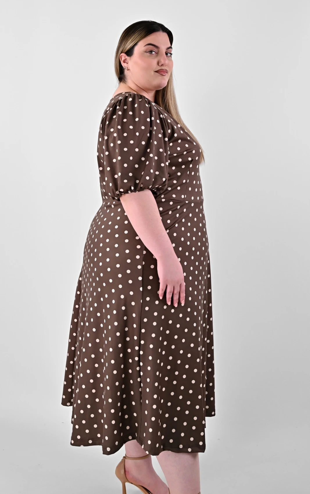 Ανακαλύψτε τη γήινη και ζεστή εκδοχή του αγαπημένου μας σχεδίου. Αυτό το Plus size midi φόρεμα σε πλούσιο καφέ χρώμα με μπεζ πουά προσφέρει μια αίσθηση διαχρονικής κομψότητας. Η άνετη γραμμή του αγκαλιάζει όμορφα τη σιλουέτα, ενώ οι διακριτικές βάτες στους ώμους προσθέτουν έναν ήπιο όγκο και εξασφαλίζουν μια σταθερή, προσεγμένη εφαρμογή.