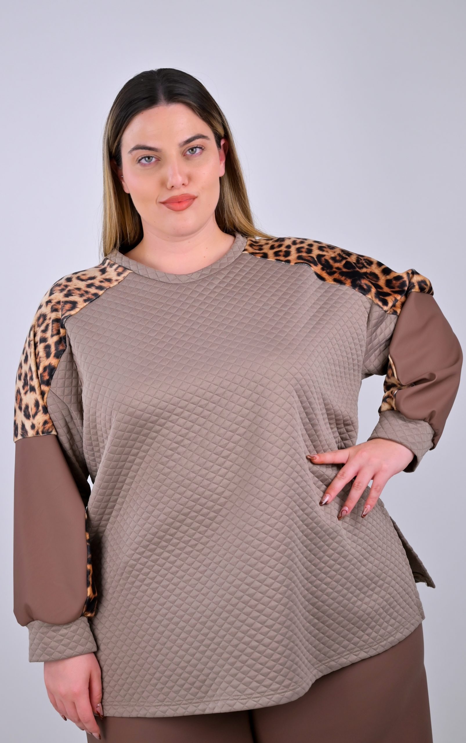 Αυτή η plus size καφέ μπλούζα φούτερ έρχεται για να προσθέσει ζεστασιά και ένα γήινο, μοντέρνο στυλ στην γκαρνταρόμπα σας. Συνδυάζει την ασυναγώνιστη άνεση με ένα design που κλέβει τις εντυπώσεις, χάρη στις τολμηρές λεπτομέρειες από animal print και δερματίνη.