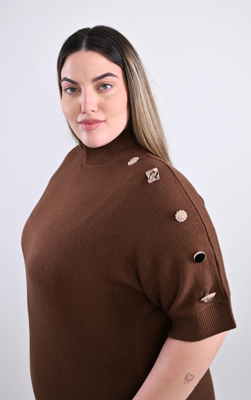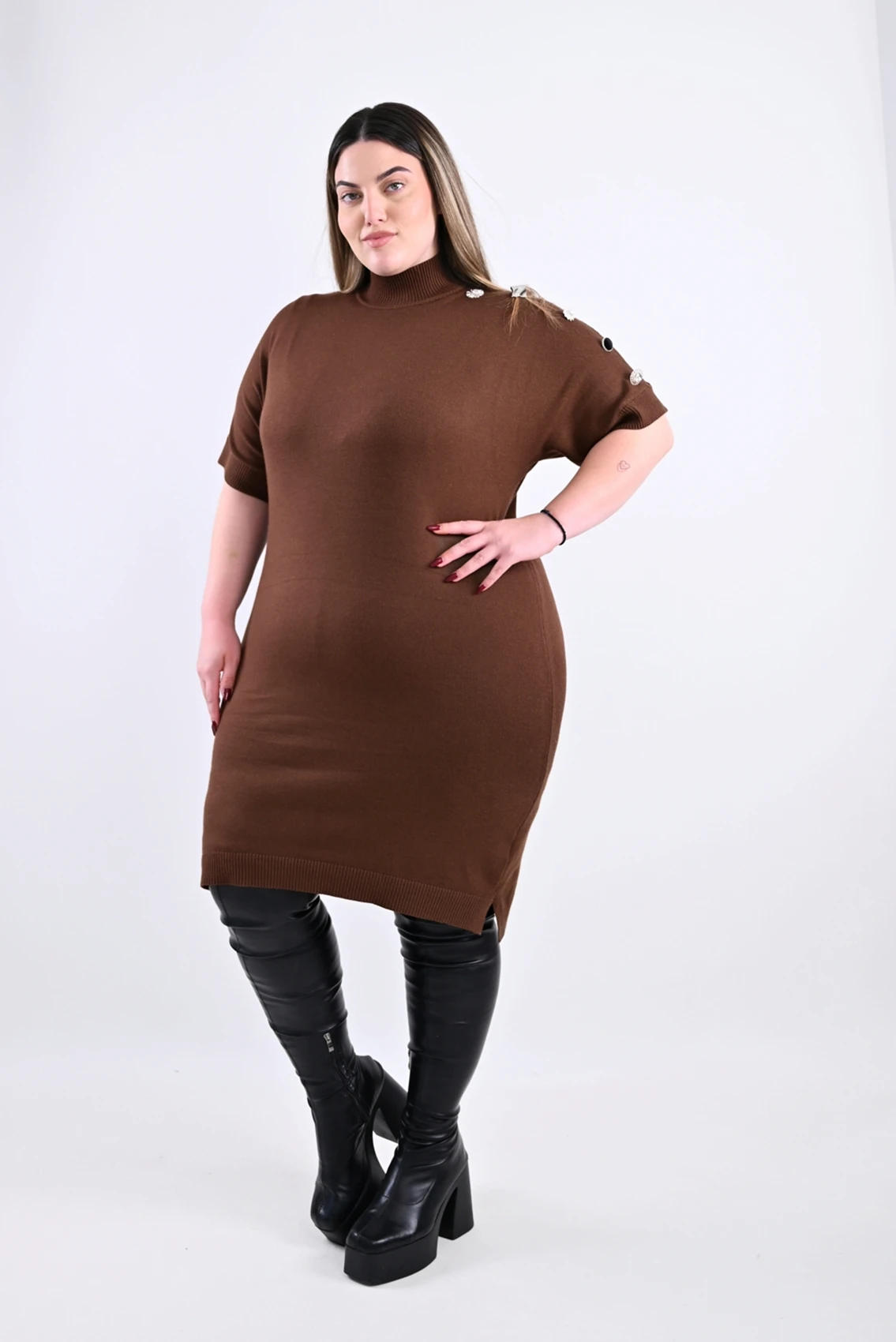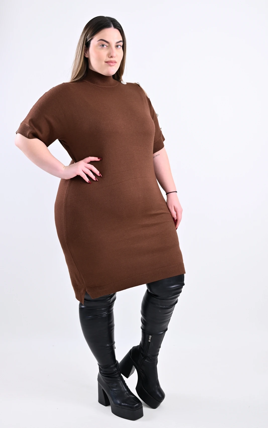 Καφέ Πλεκτό Φόρεμα με Διακοσμητικά Κουμπιά