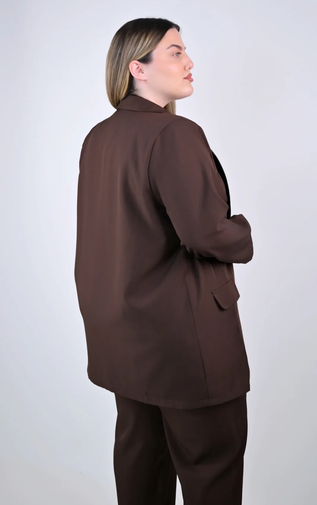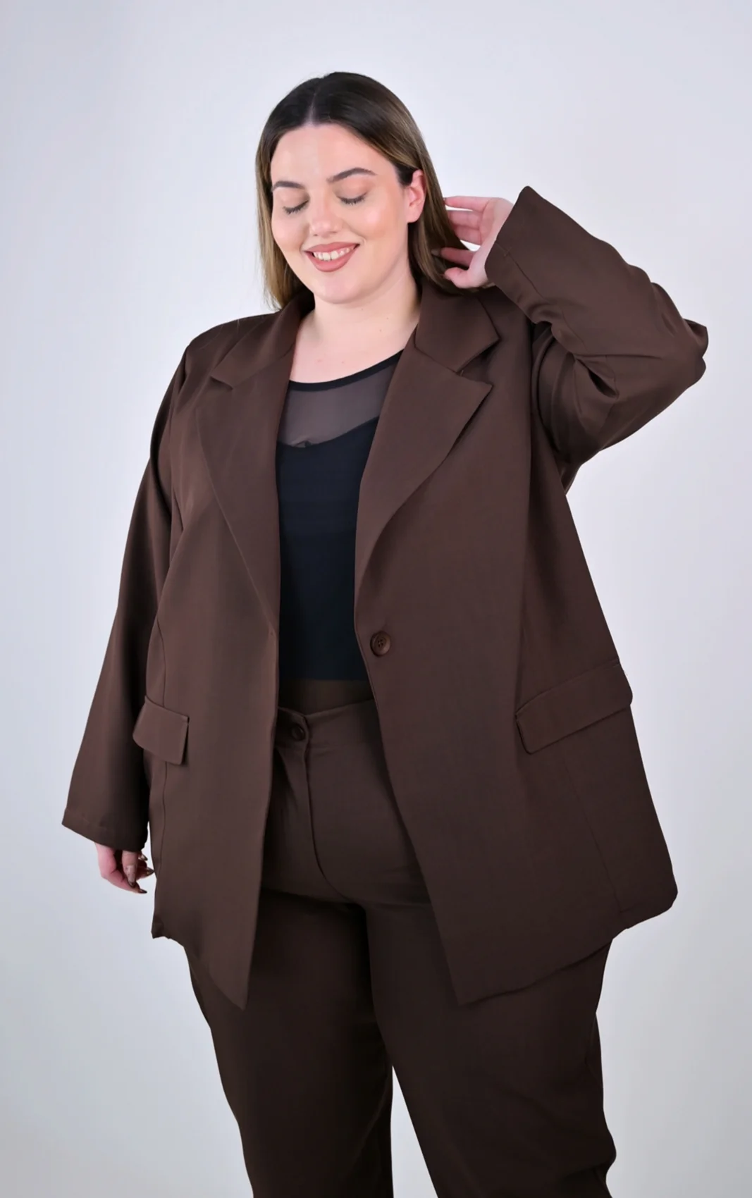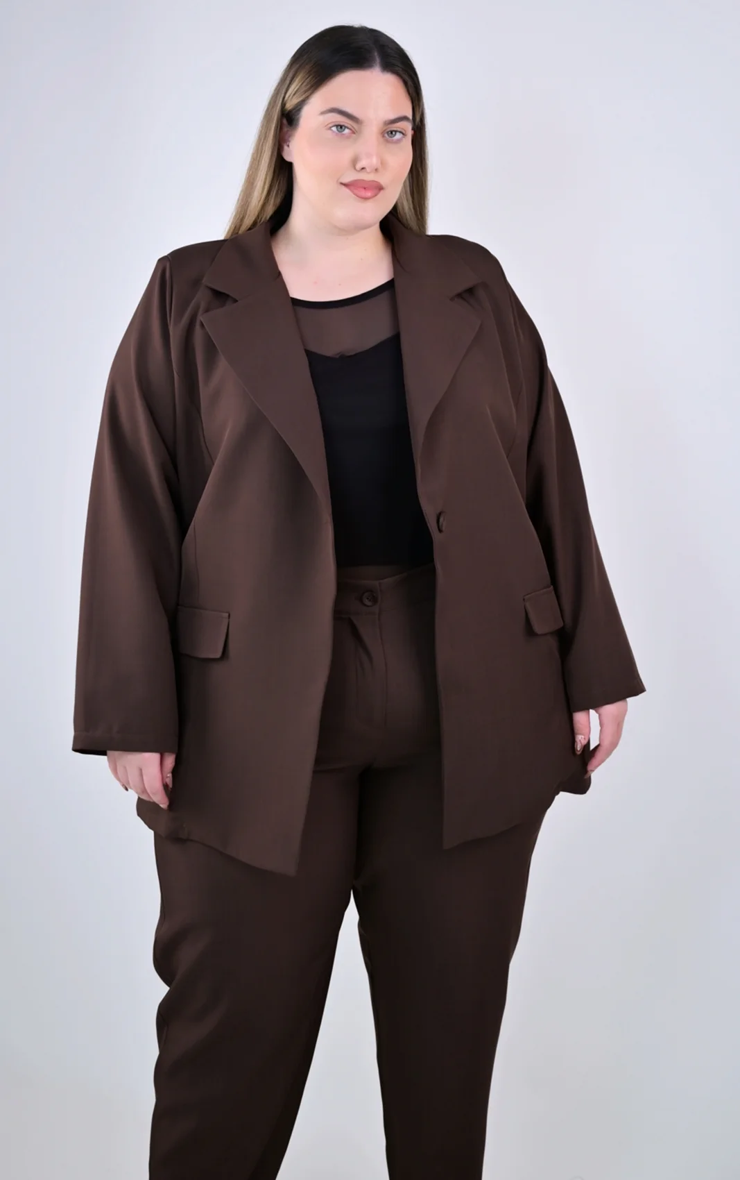 Αναβαθμίστε αμέσως την γκαρνταρόμπας σας με αυτό το plus size καφέ σακάκι, το απόλυτο σύμβολο δυναμικού στυλ. Σχεδιασμένο για να σας συνοδεύει από τις επαγγελματικές συναντήσεις μέχρι τις χαλαρές βόλτες, προσφέρει την τέλεια ισορροπία μεταξύ άνετης εφαρμογής και προσεγμένης εμφάνισης, χαρίζοντας αυτοπεποίθηση σε κάθε σας βήμα.