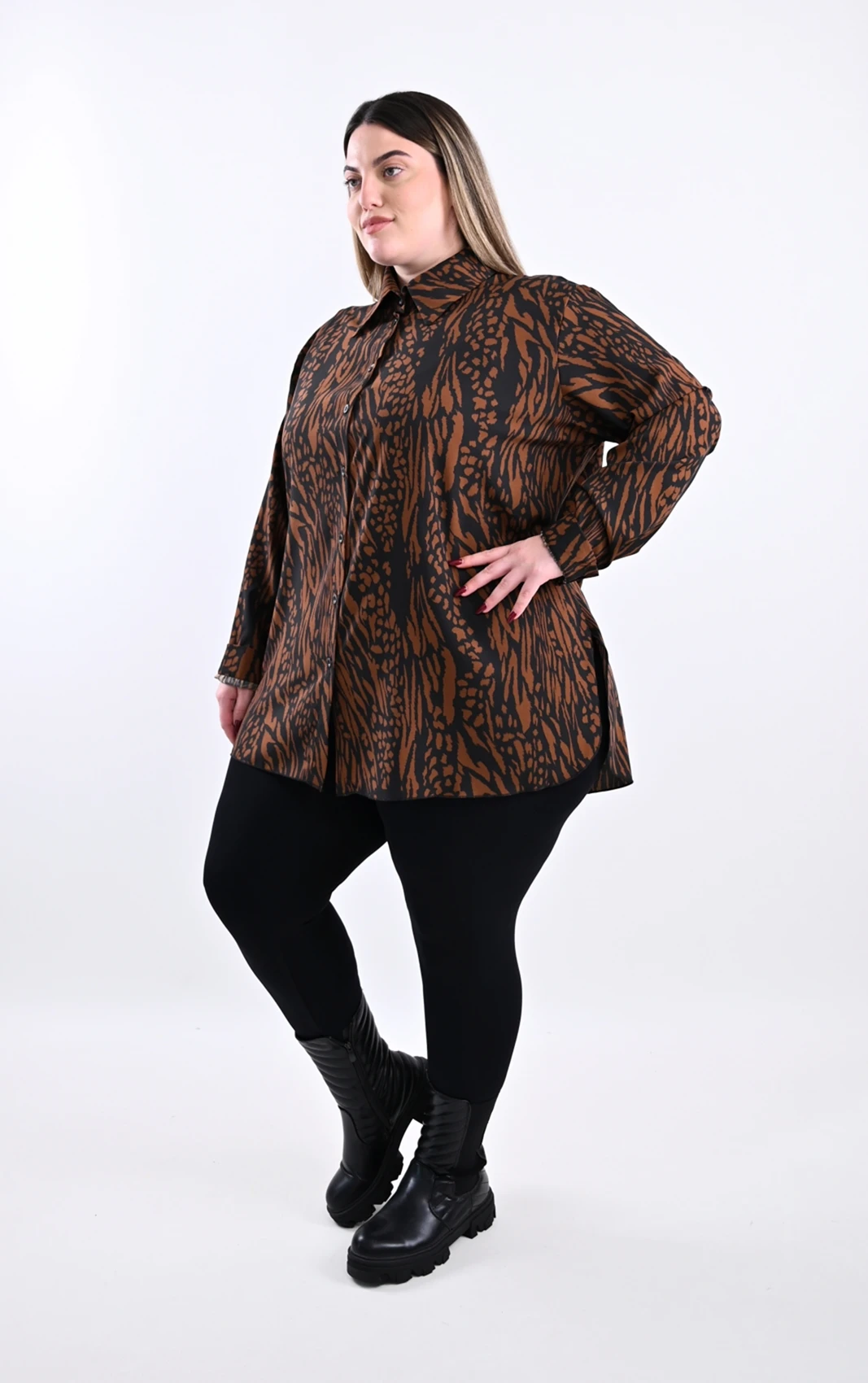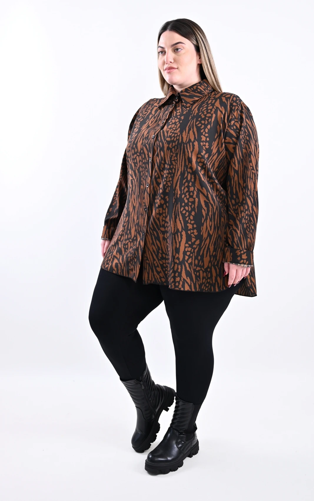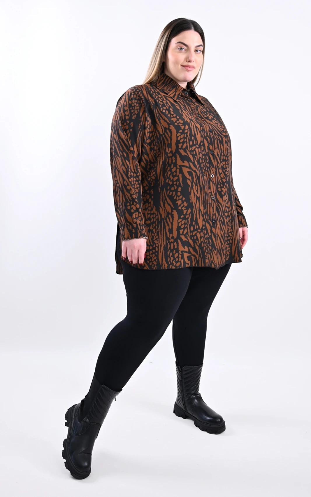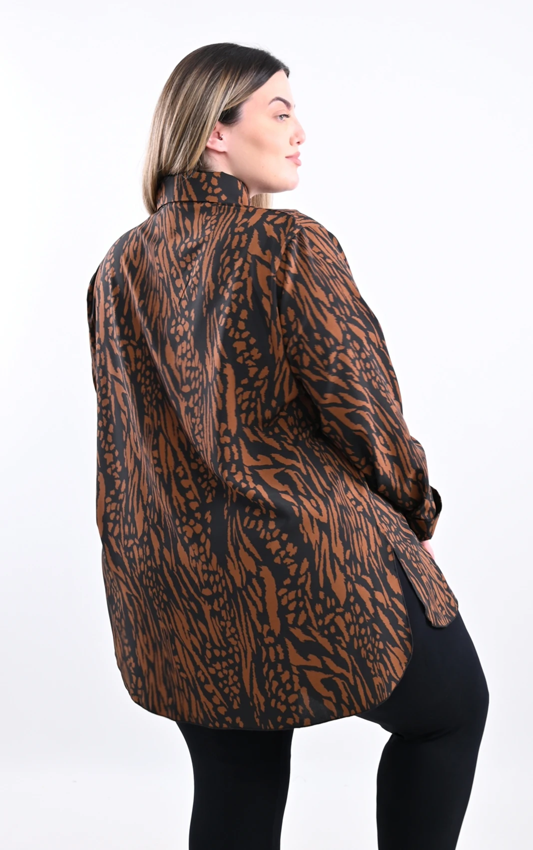Κάντε μια δυναμική και στυλάτη εμφάνιση με αυτή τη μοντέρνα πουκαμίσα. Σχεδιασμένη για να προσφέρει άνεση και ένα σύγχρονο look, αυτό το κομμάτι θα γίνει αναπόσπαστο μέρος της γκαρνταρόμπας σας. Το εντυπωσιακό zebra print, σε μια πλούσια αντίθεση καφέ και μαύρου, προσδίδει έναν αέρα αυτοπεποίθησης και γήινης κομψότητας, ενώ παραμένει εξαιρετικά ευέλικτο στους συνδυασμούς.
