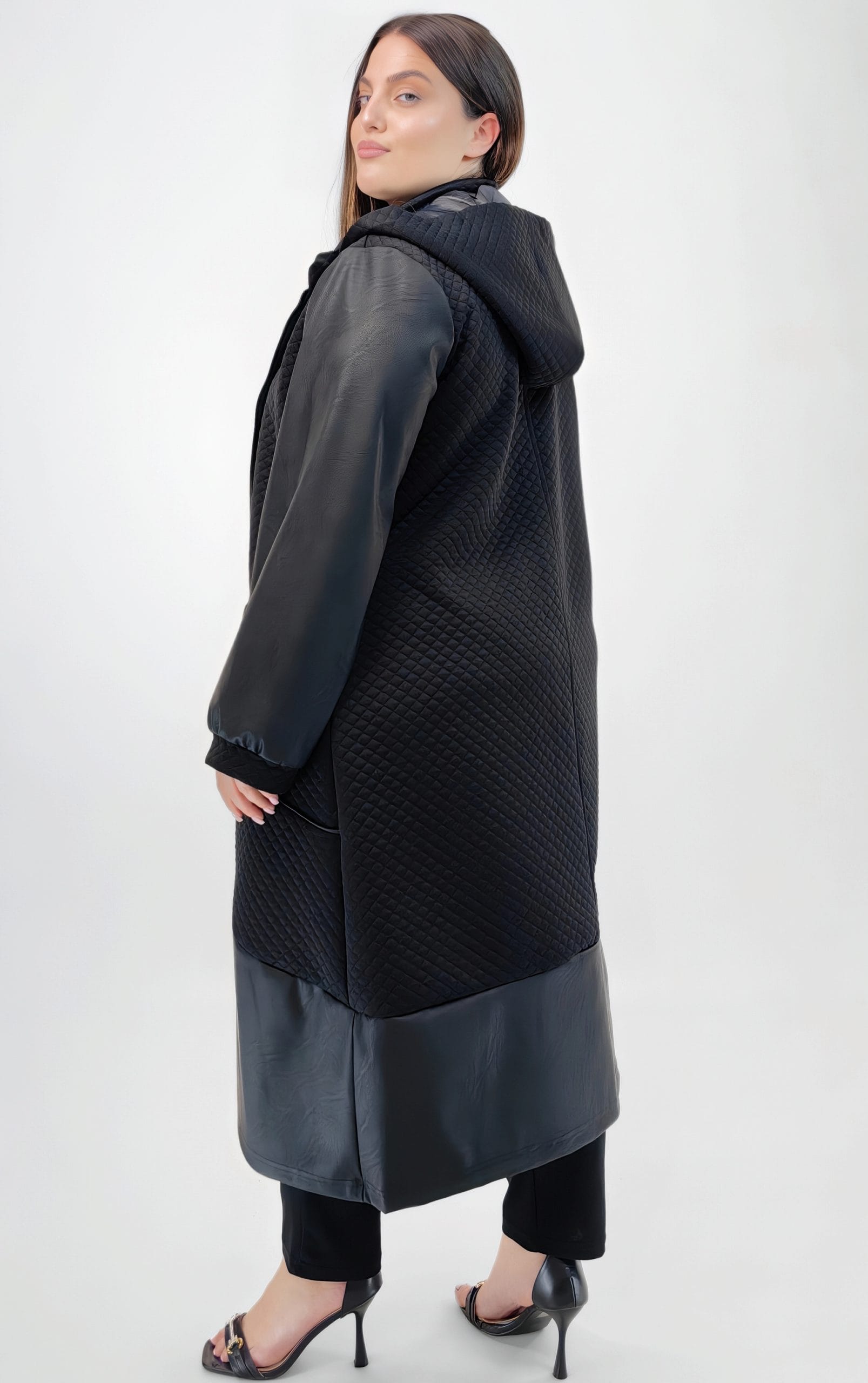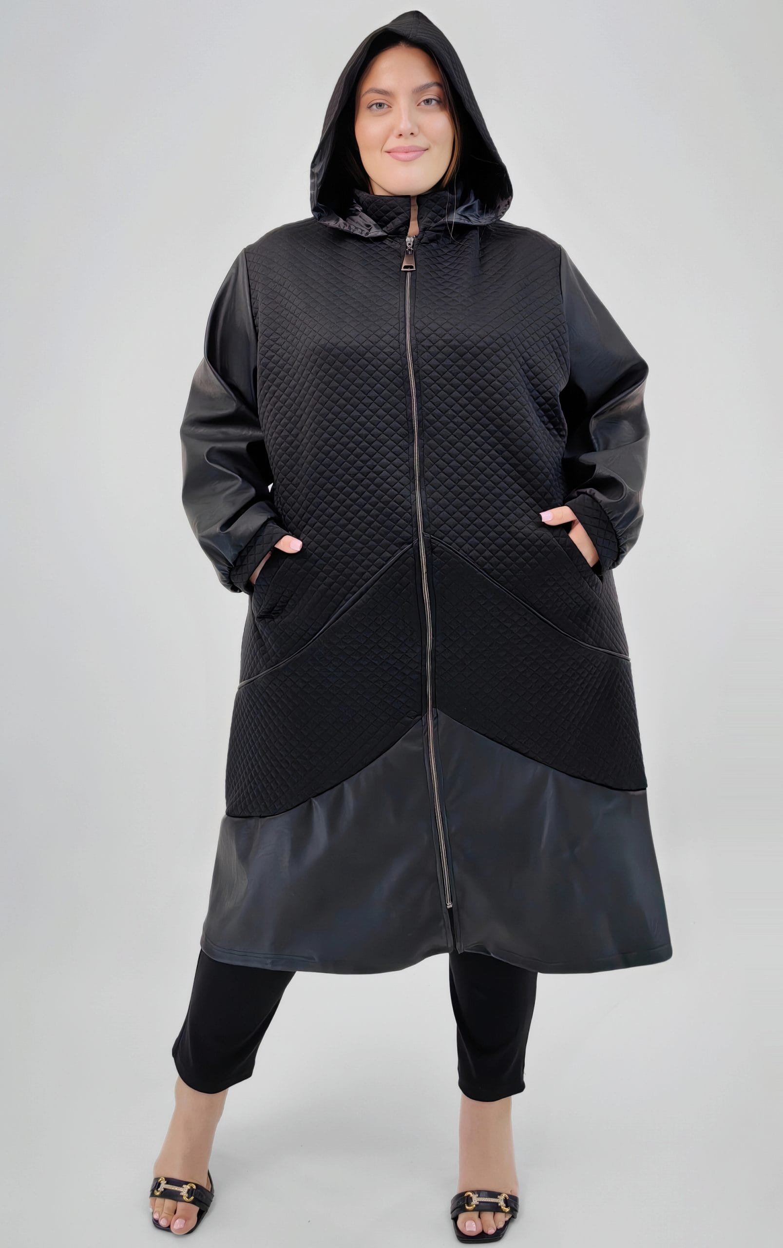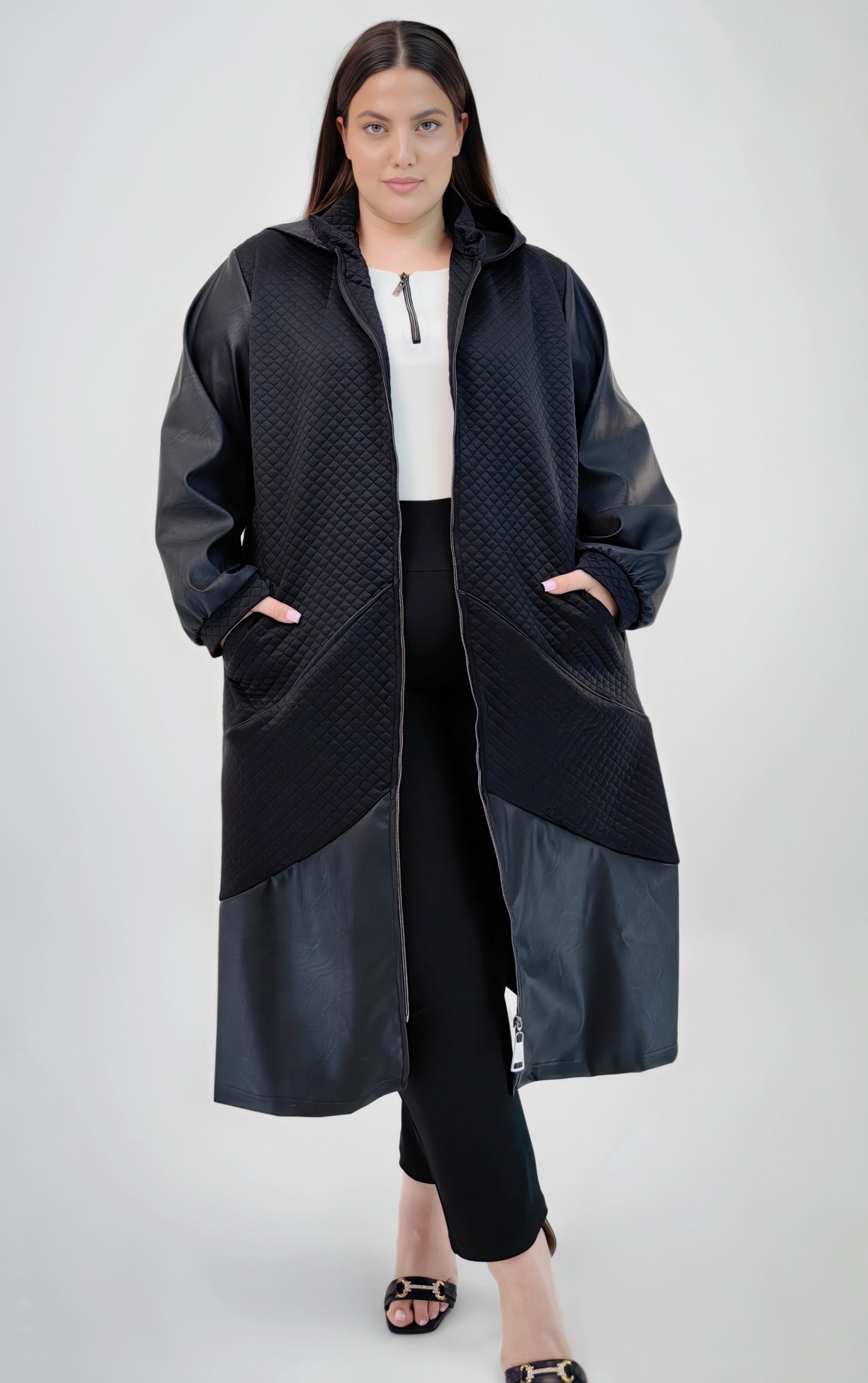 Plus size μακρύ μαύρο πανωφόρι, κατασκευασμένο από καπιτονέ ύφασμα σε συνδυασμό με δερματίνη, ιδανικό για τις πρώτες κρύες ημέρες. Σχεδιάσαμε αυτό το πανωφόρι με κουκούλα, φερμουάρ που κλείνει μέχρι κάτω και πλαϊνές τσέπες για πρακτικότητα και στυλ. Στο ύψος της μέσης, τα λοξά φιλέτα δημιουργούν ένα σχήμα που κολακεύει τη σιλουέτα και προσθέτουν ύψος.