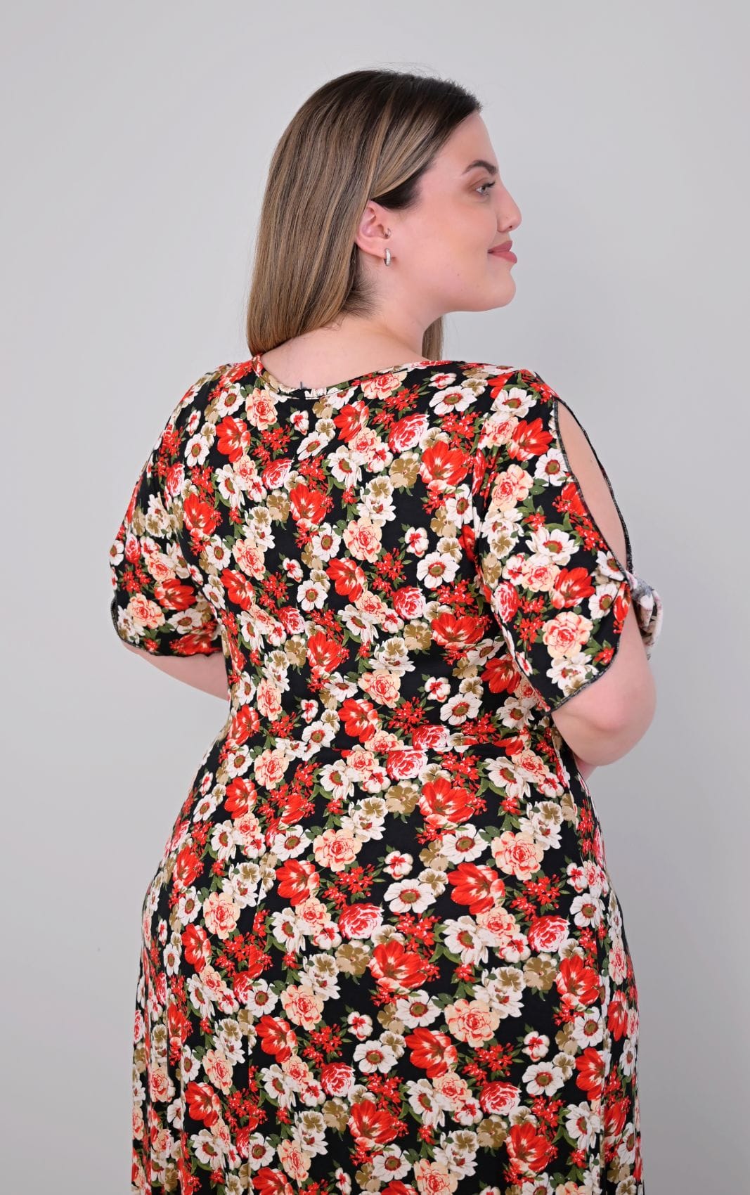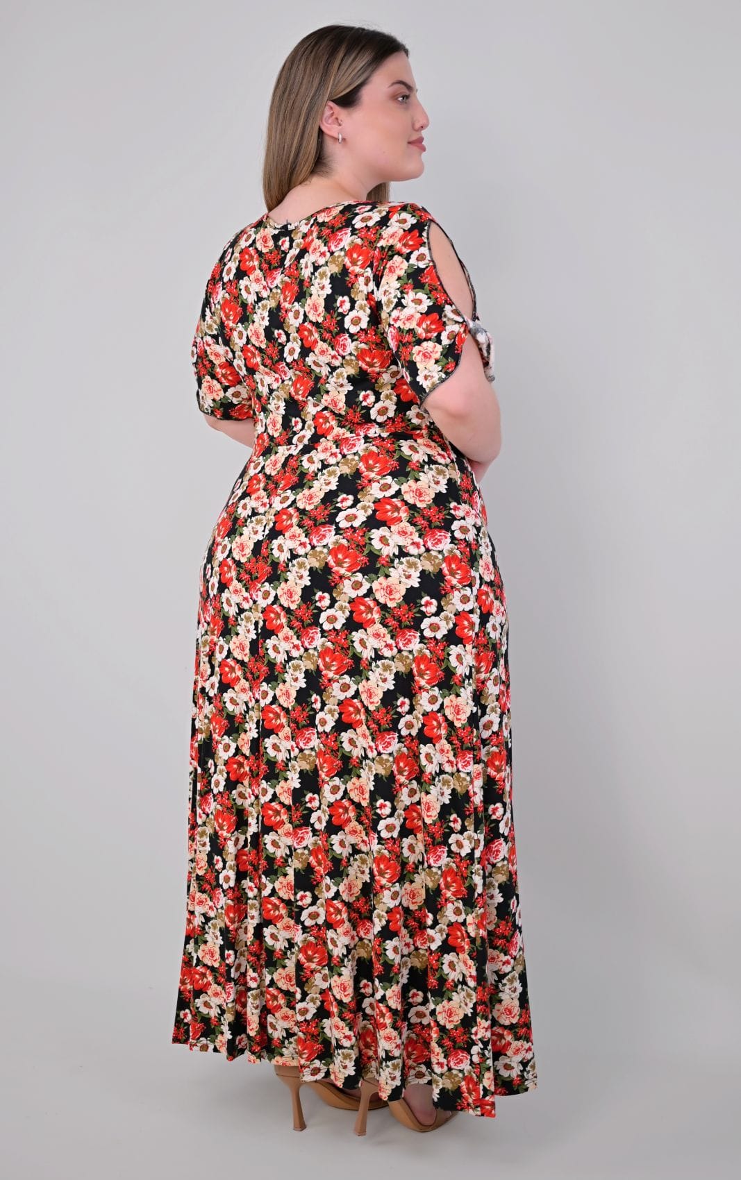 Αυτό το plus size μάξι φόρεμα είναι η απόλυτη έκφραση του δυναμικού στυλ. Συνδυάζει την αέρινη, πολυτελή αίσθηση της 100% βισκόζης με ένα παθιασμένο μοτίβο σε αποχρώσεις του μαύρου και του κόκκινου, δημιουργώντας ένα σύνολο που είναι ταυτόχρονα άνετο και άκρως εντυπωσιακό.