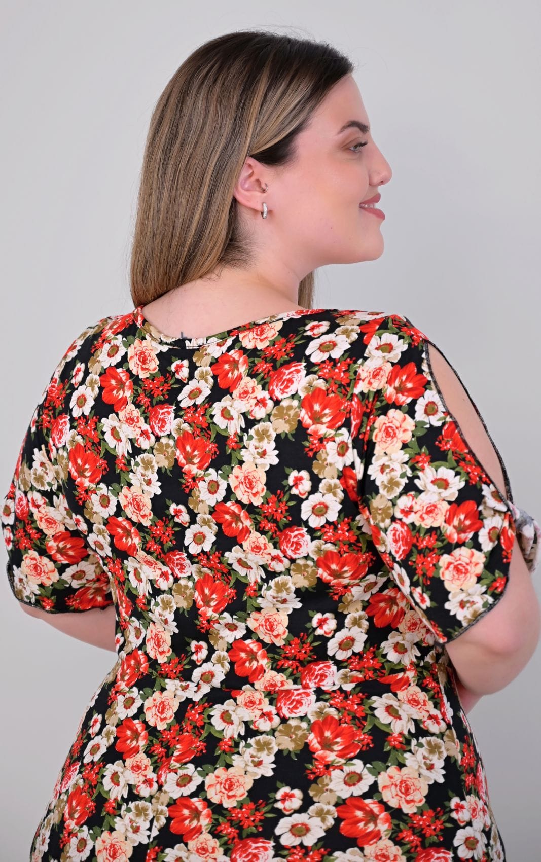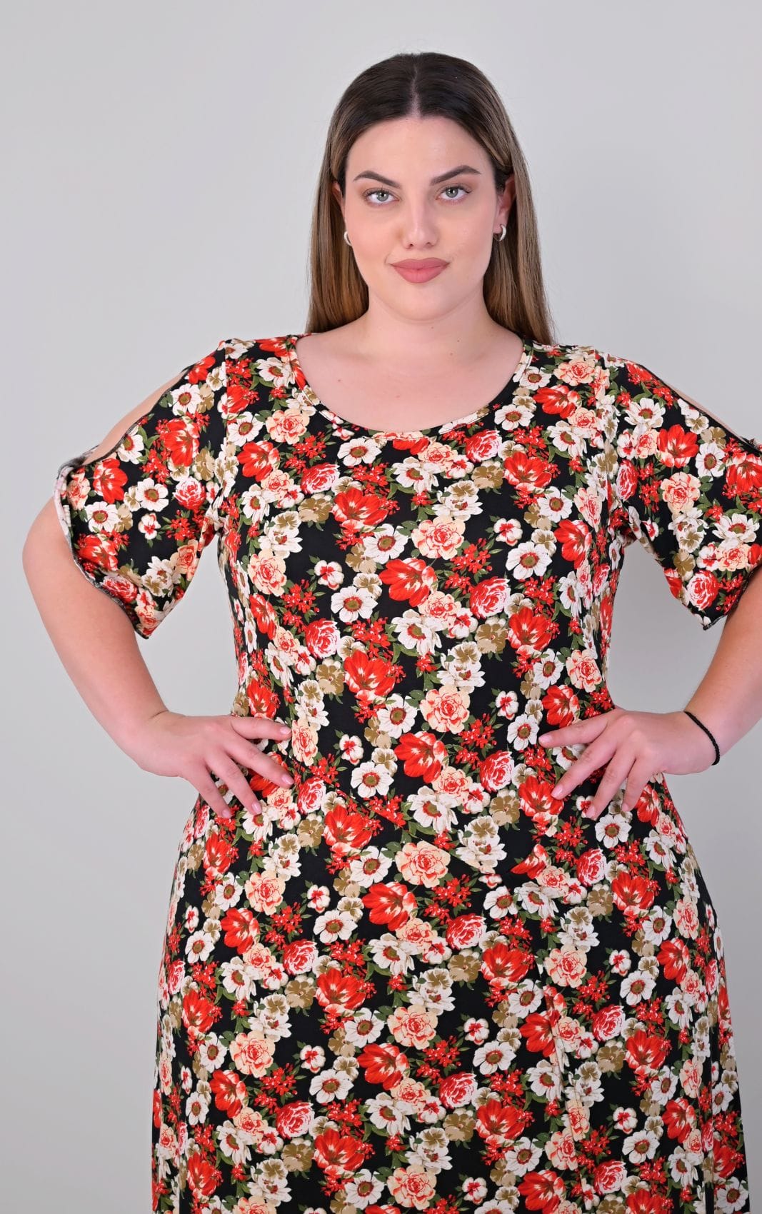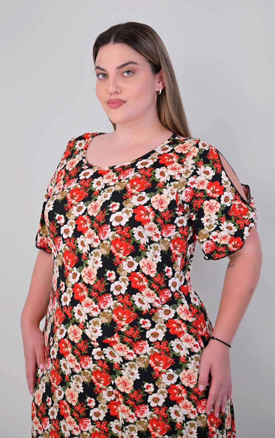 Κατασκευασμένο εξ ολοκλήρου από ποιοτικό ύφασμα βισκόζης, αυτό το φόρεμα προσφέρει απαράμιλλη απαλότητα και μια ανάλαφρη, δροσερή αίσθηση στο δέρμα. Η άνετη plus size γραμμή του πέφτει ρευστά στο σώμα, αγκαλιάζοντας τις καμπύλες χωρίς να τις περιορίζει, εξασφαλίζοντας ελευθερία κινήσεων και κομψότητα όλη την ημέρα. Διαθέτει κλασική στρογγυλή λαιμόκοψη και μανίκια με διακριτικό άνοιγμα στο μπράτσο, που κλείνουν με μικρό γύρισμα για κομψή λεπτομέρεια. Στη μία πλευρά του φορέματος υπάρχει πλαϊνό σκίσιμο που φτάνει μέχρι το μπούτι, προσδίδοντας ζωντάνια και πρακτικότητα.