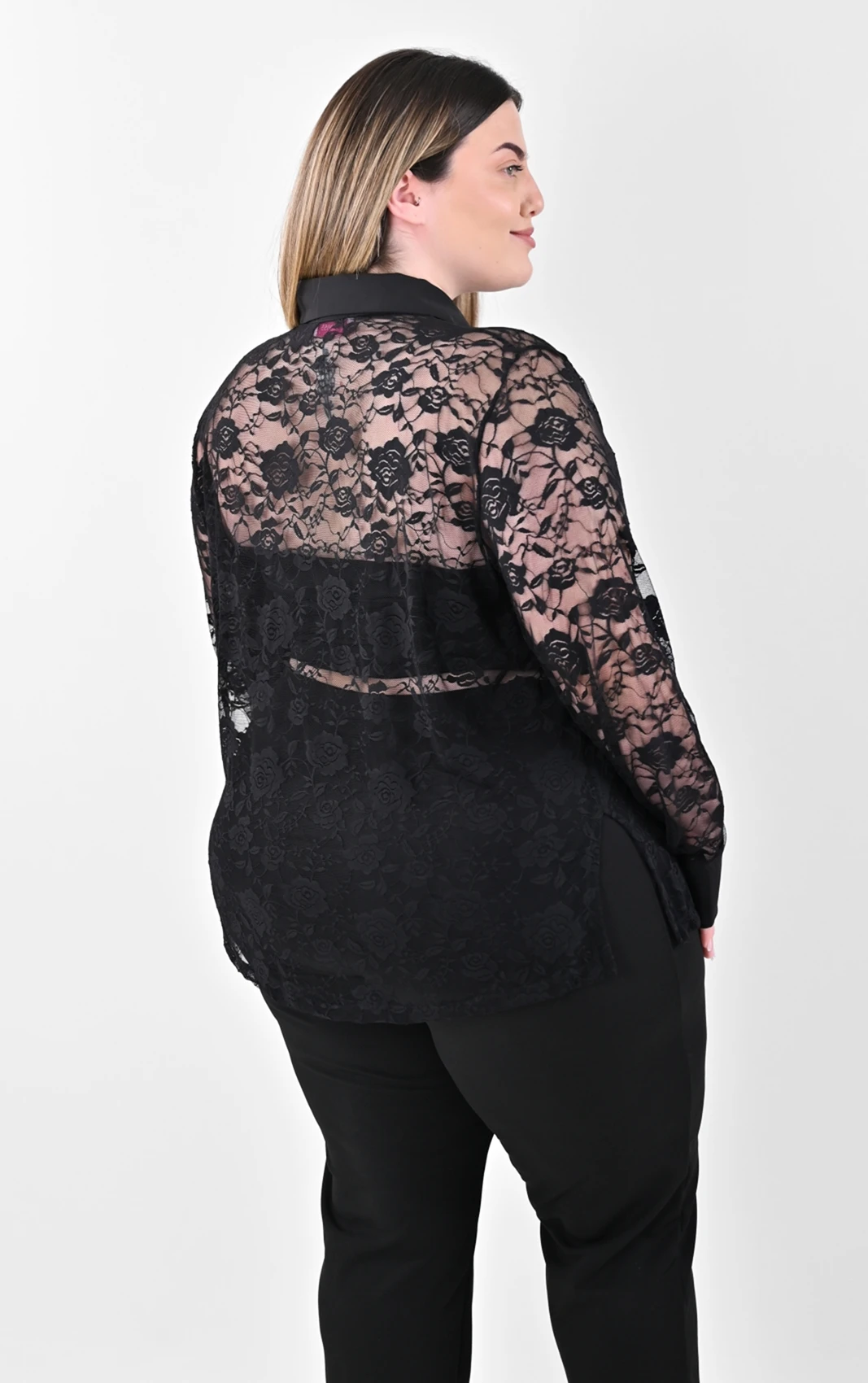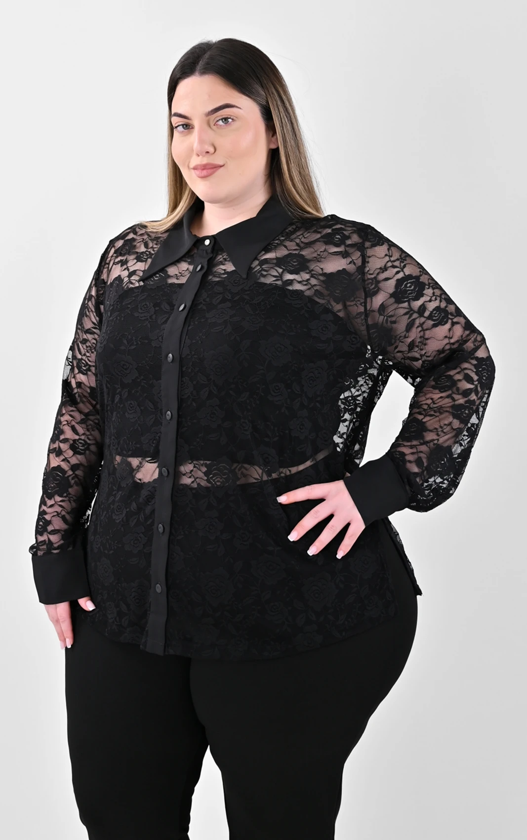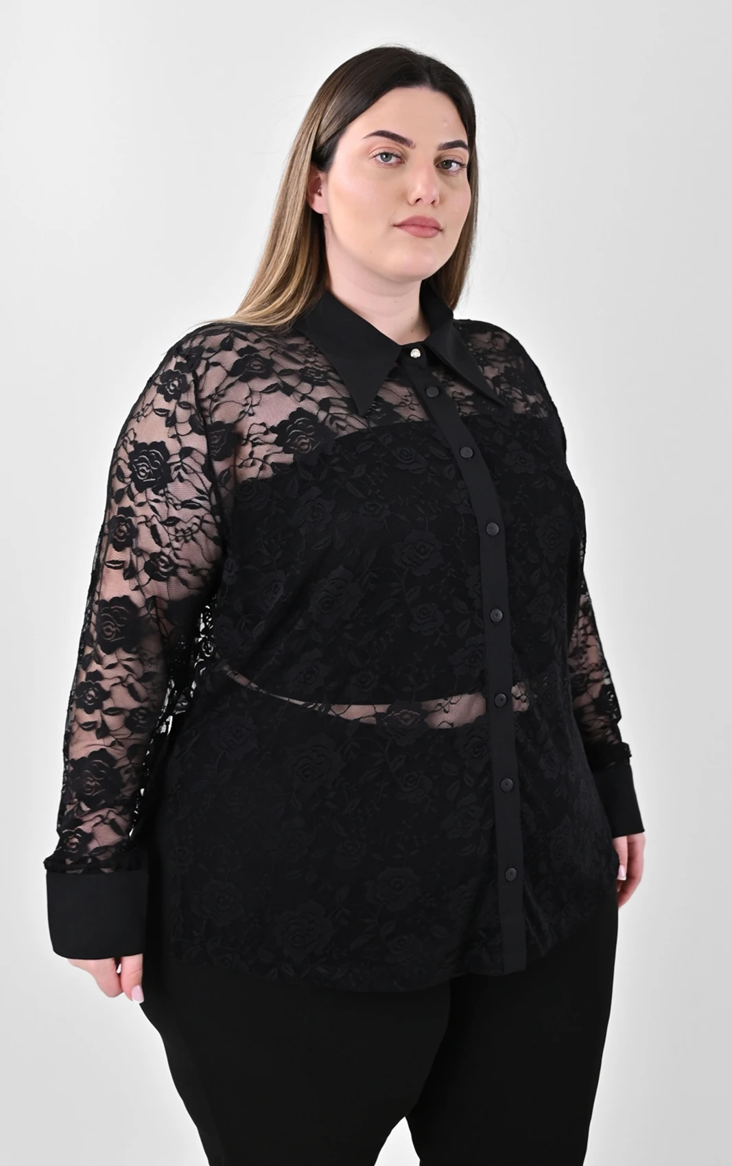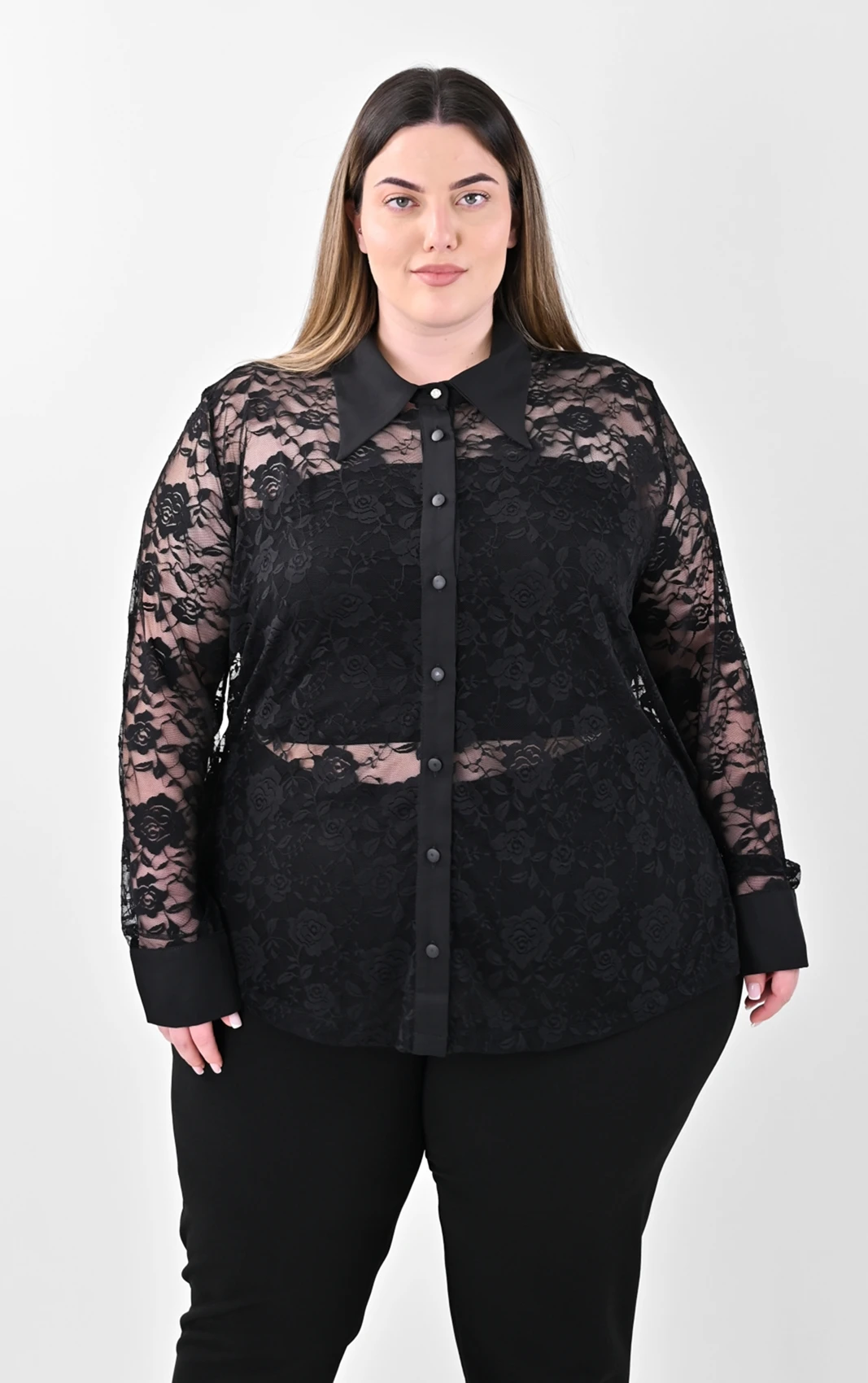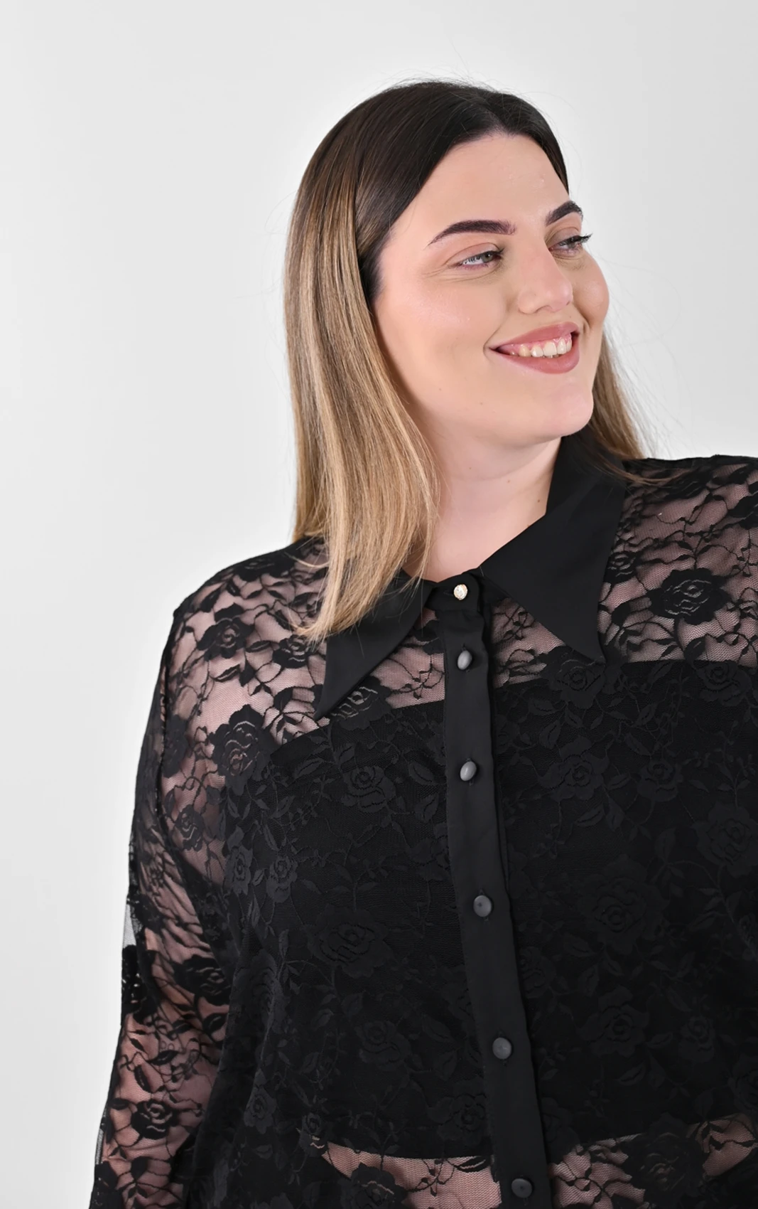 Αποκτήστε αυτό το μοντέρνο μαύρο πουκάμισο από δαντέλα, ένα stylish κομμάτι που συνδυάζει διαφάνεια με την πρακτικότητα. Η μπλούζα είναι φτιαγμένη από ανάλαφρη δαντέλα με εντυπωσιακό floral μοτίβο και διαθέτει κλασικό γιακά και πατιλέτα με κουμπιά από ματ σατέν ύφασμα, προσφέροντας ξεχωριστή αντίθεση στις υφές. Συνοδεύεται από ανεξάρτητο, αφαιρούμενο εσωτερικό μαύρο μπούστο (τοπ), το οποίο μπορείτε να φορέσετε από μέσα για πλήρη κάλυψη, εξασφαλίζοντας άνεση και σιγουριά. Φορέστε τα μαζί για μια ολοκληρωμένη εμφάνιση ή συνδυάστε το δαντελένιο πουκάμισο με άλλα τοπ. Είναι ιδανικό για να δημιουργήσετε εντυπωσιακές εμφανίσεις με γούστο.