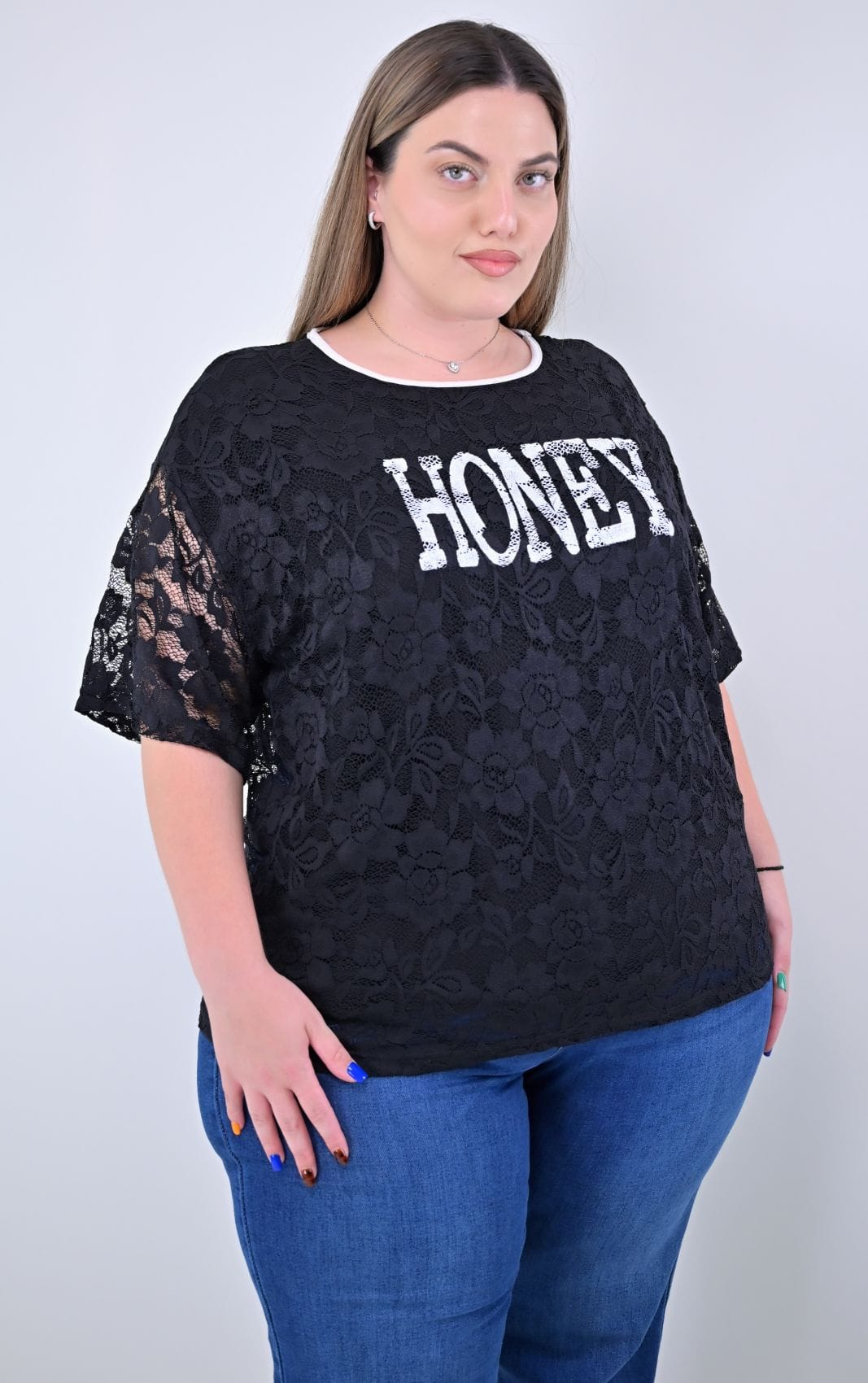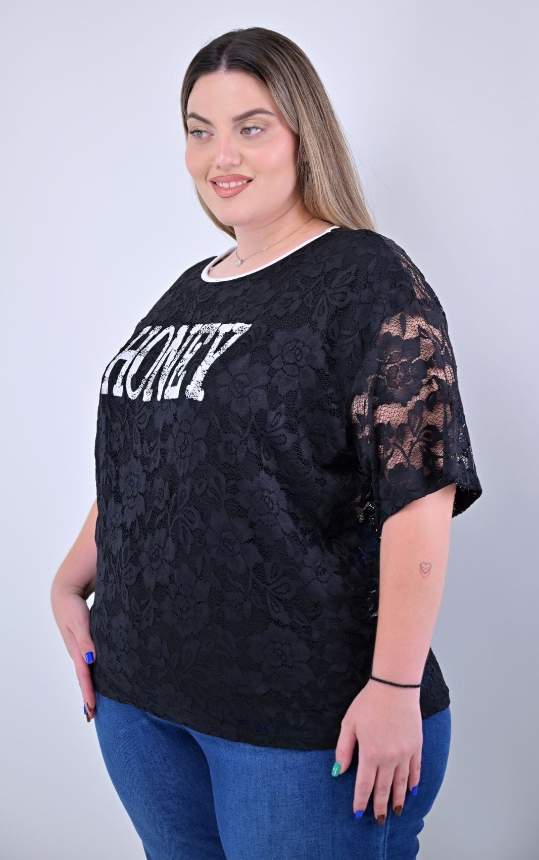 Η plus size μαύρη μπλούζα δαντέλα με τύπωμα HONEY συνδυάζει το καθημερινό με το ιδιαίτερο, προσφέροντας μια ξεχωριστή επιλογή για casual αλλά και πιο τολμηρές εμφανίσεις. Το βασικό ύφασμα είναι φλοράλ δαντέλα σε μαύρη απόχρωση, με εμφανή λουλουδένια μοτίβα σε όλη την επιφάνεια.