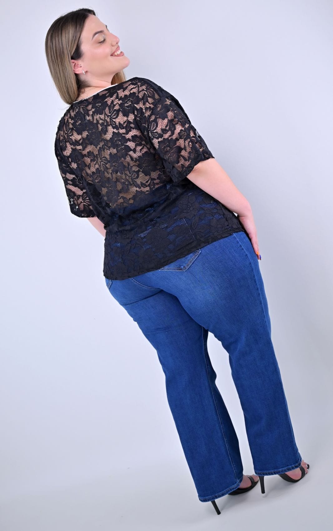 Η γραμμή της μπλούζας είναι ίσια και χαλαρή, χωρίς σούρες, λάστιχα ή πιέτες. Το τελείωμα είναι ευθύ, χωρίς καμπυλώσεις ή ανοίγματα. Στην πίσω όψη, η διαφάνεια της δαντέλας δημιουργεί ένα ανάλαφρο οπτικό αποτέλεσμα, χωρίς να αποκαλύπτει υπερβολικά.