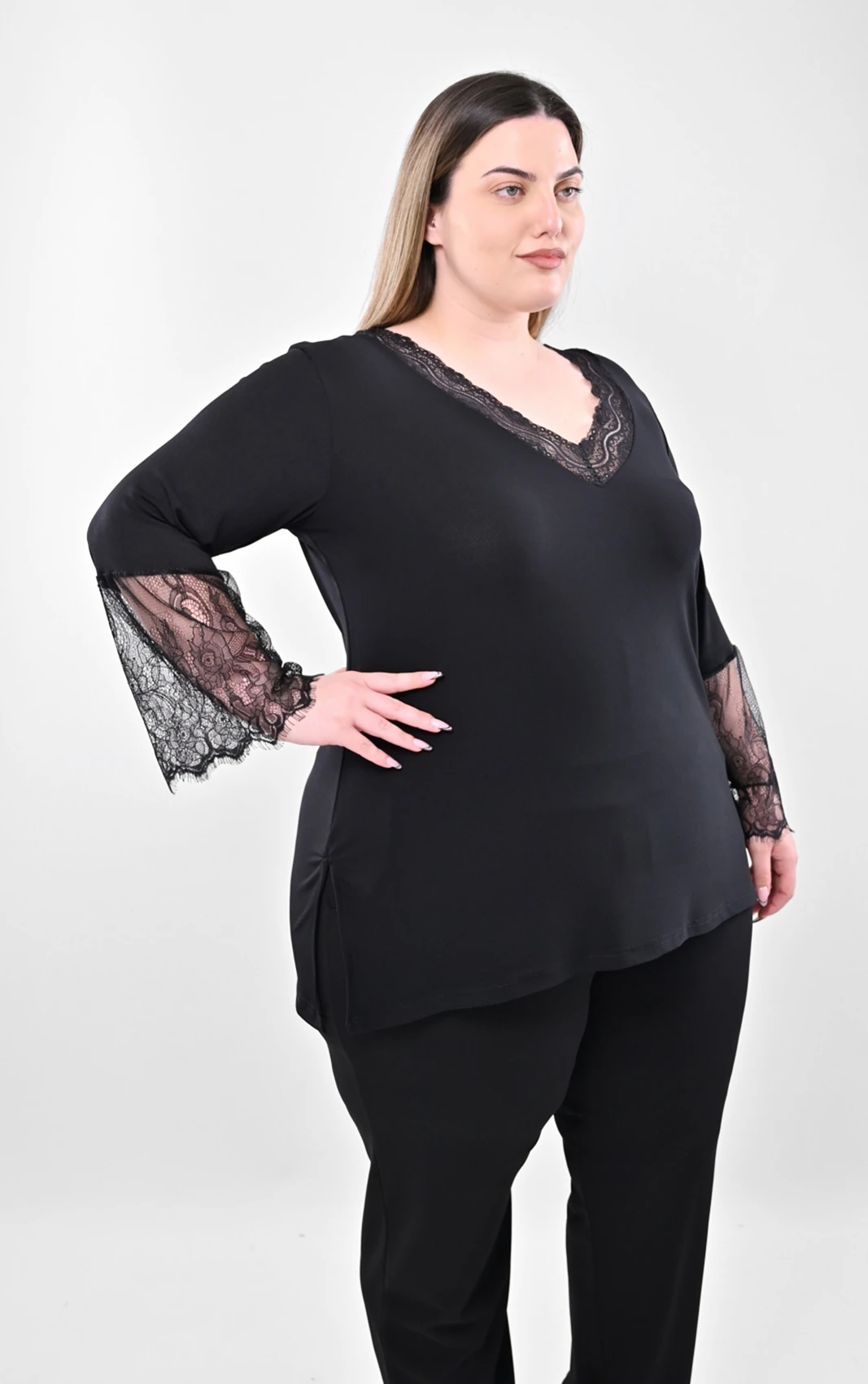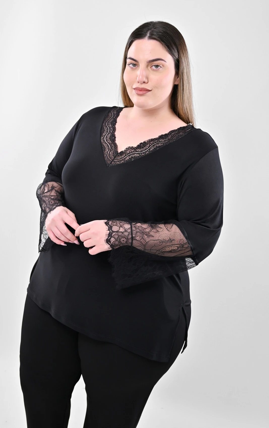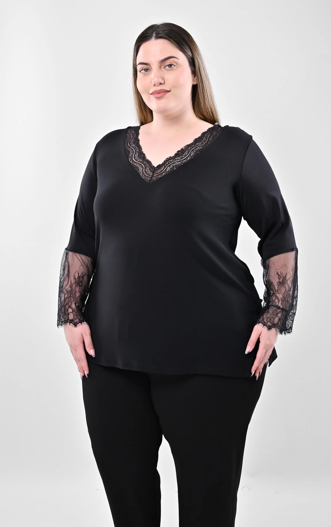 Ανακαλύψτε αυτή τη στυλάτη μαύρη μπλούζα, σχεδιασμένη ειδικά για να προσφέρει άνεση και στυλ σε plus size νούμερα. Διαθέτει μια όμορφη V λαιμόκοψη που τονίζεται διακριτικά από ποιοτική, ασορτί μαύρη δαντέλα.