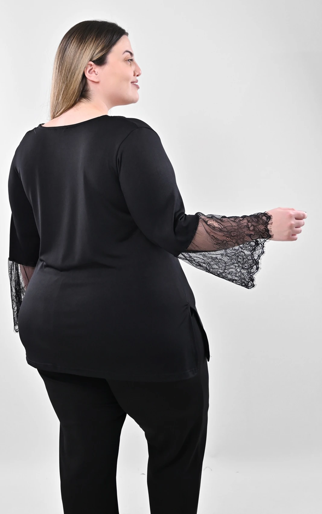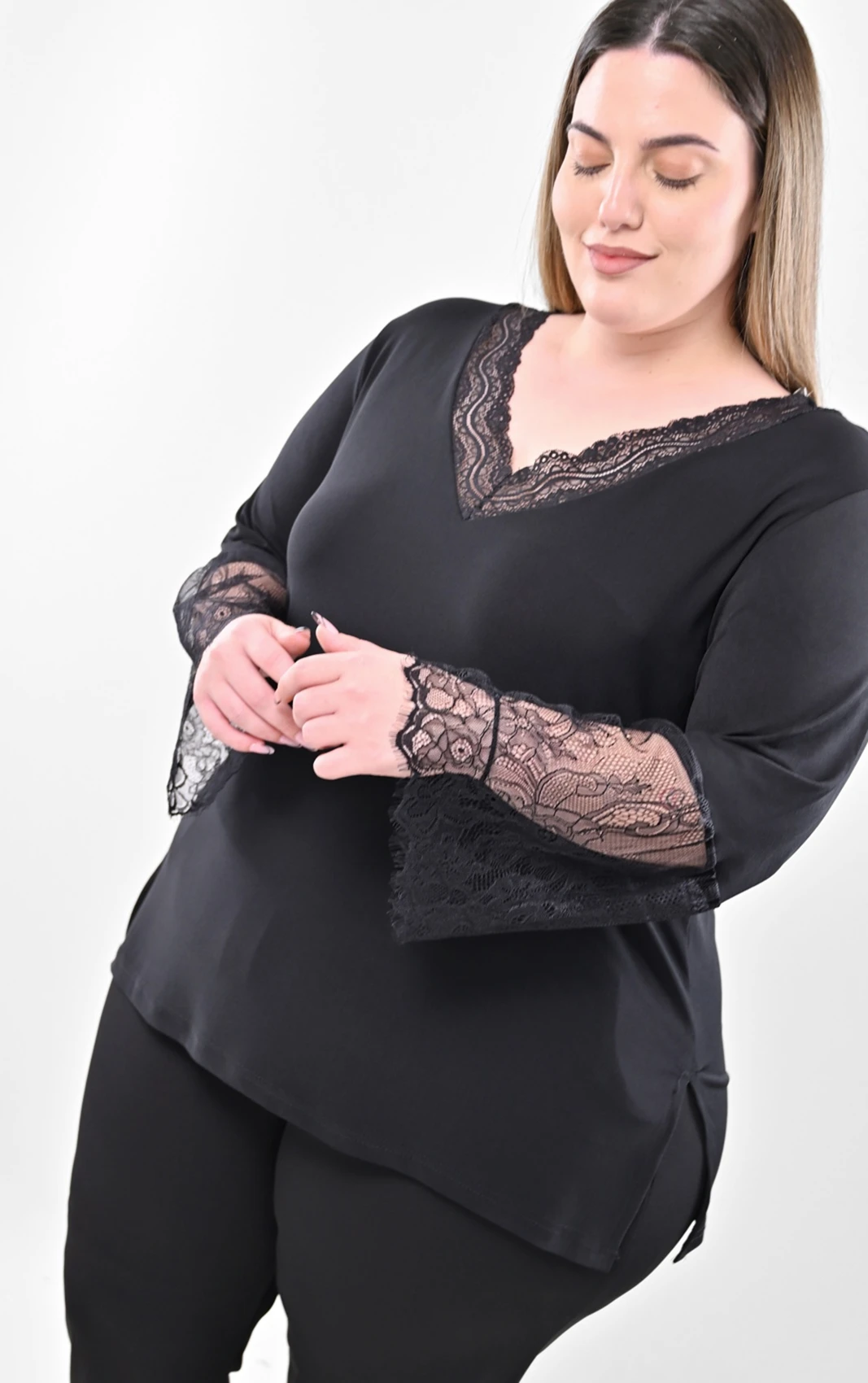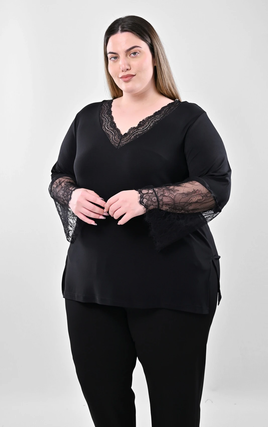 Ανακαλύψτε αυτή τη στυλάτη μαύρη μπλούζα, σχεδιασμένη ειδικά για να προσφέρει άνεση και στυλ σε plus size νούμερα. Διαθέτει μια όμορφη V λαιμόκοψη που τονίζεται διακριτικά από ποιοτική, ασορτί μαύρη δαντέλα.