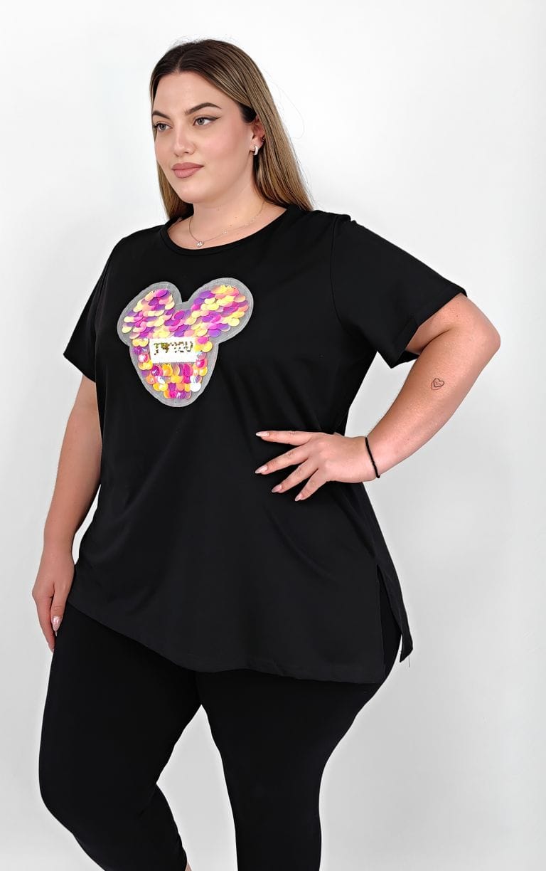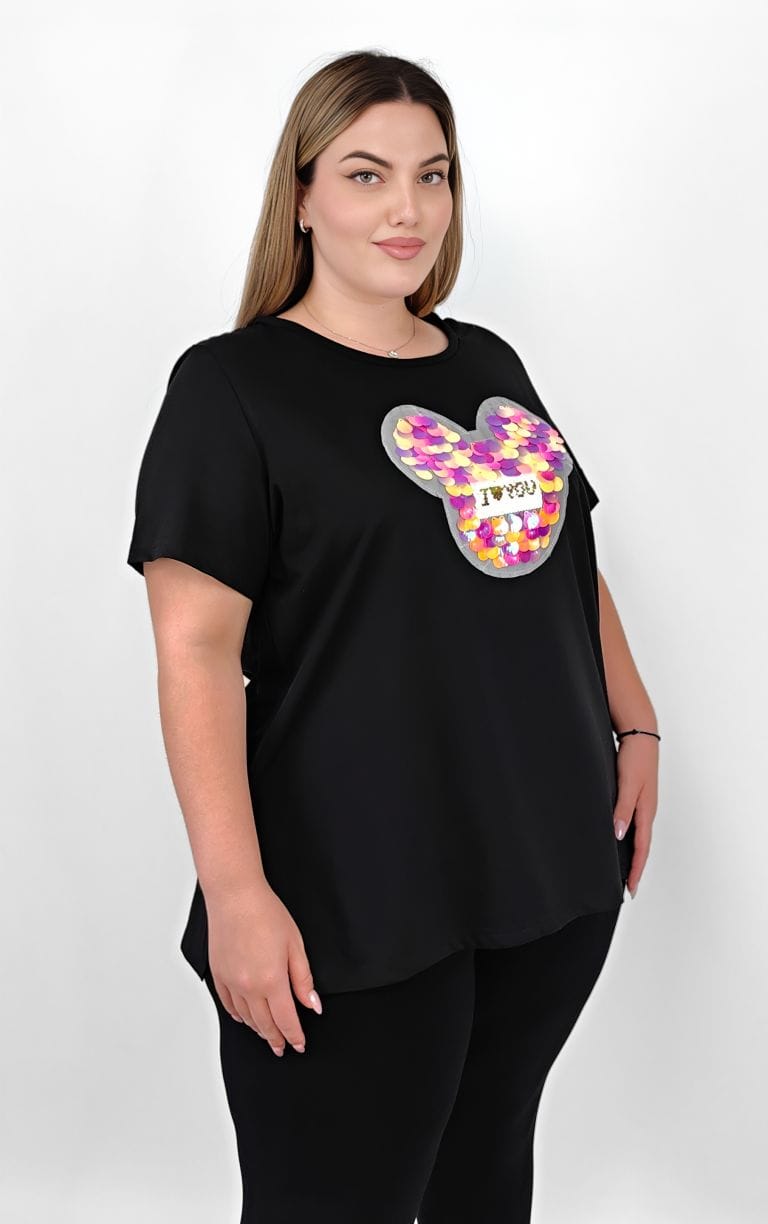 Plus Size Μαύρη Μπλούζα με Παγιέτες σε Σχήμα Mickey