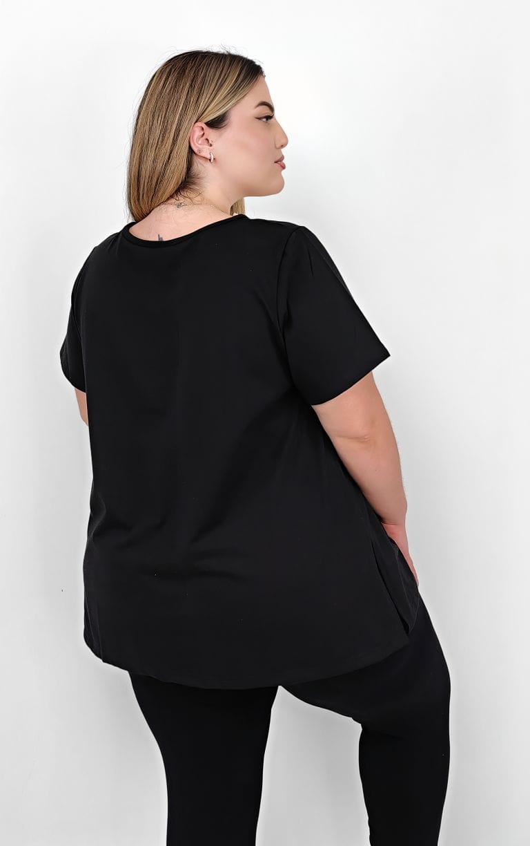 Ανανεώστε τη συλλογή σας με αυτή τη plus size μαύρη μπλούζα από 100% βαμβάκι, σχεδιασμένη για καθημερινή άνεση και ευχάριστη εφαρμογή. Το σταθερό ύφασμα προσφέρει φυσική αίσθηση στο δέρμα και υποστηρίζει σωστά το σώμα, χωρίς να κολλάει.