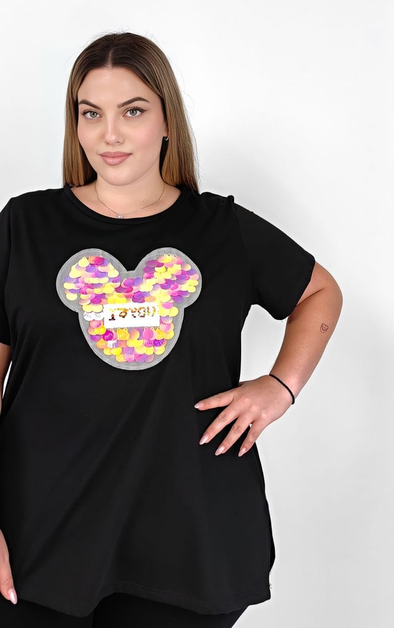 Η PsX Fashion δημιουργεί με πάθος κομψά και οικονομικά plus size ρούχα που αγκαλιάζουν κάθε σωματότυπο. Συνεργαζόμαστε με γνωστά brands για να εξασφαλίσουμε την υψηλότερη ποιότητα, ενώ ταυτόχρονα προσφέρουμε μοντέρνα και άνετα σχέδια. Στόχος μας είναι να καλύψουμε τις ανάγκες ακόμη και των πιο απαιτητικών γυναικών, συνδυάζοντας κομψότητα και λειτουργικότητα. Plus Size Μαύρη Μπλούζα με Παγιέτες σε Σχήμα Mickey