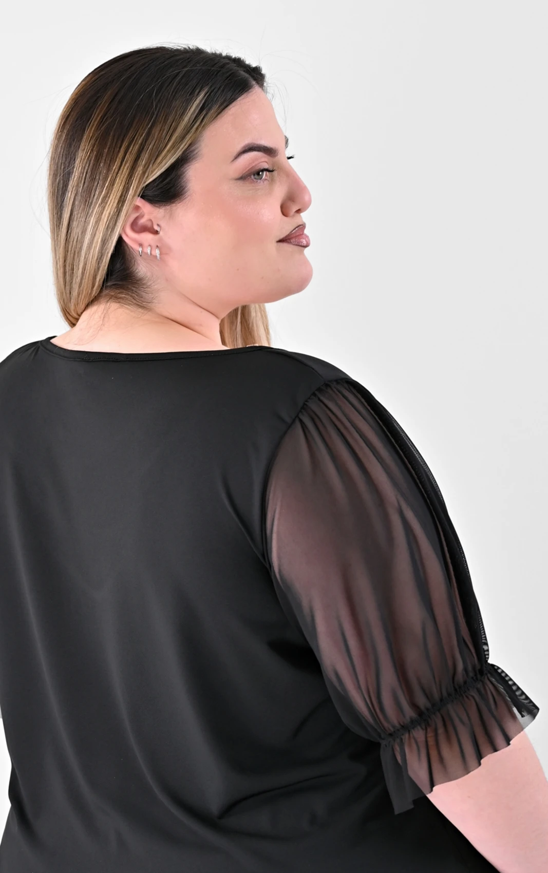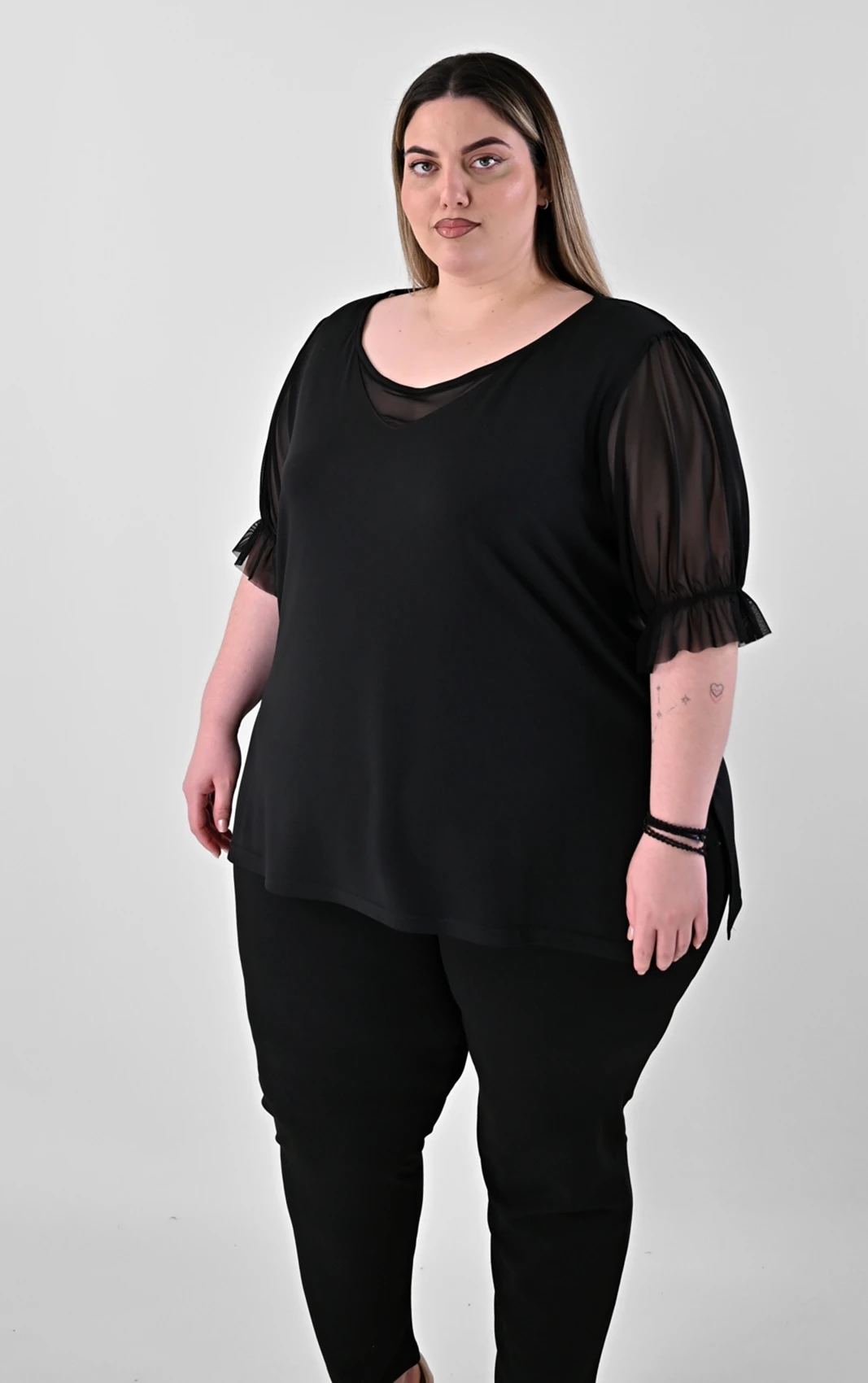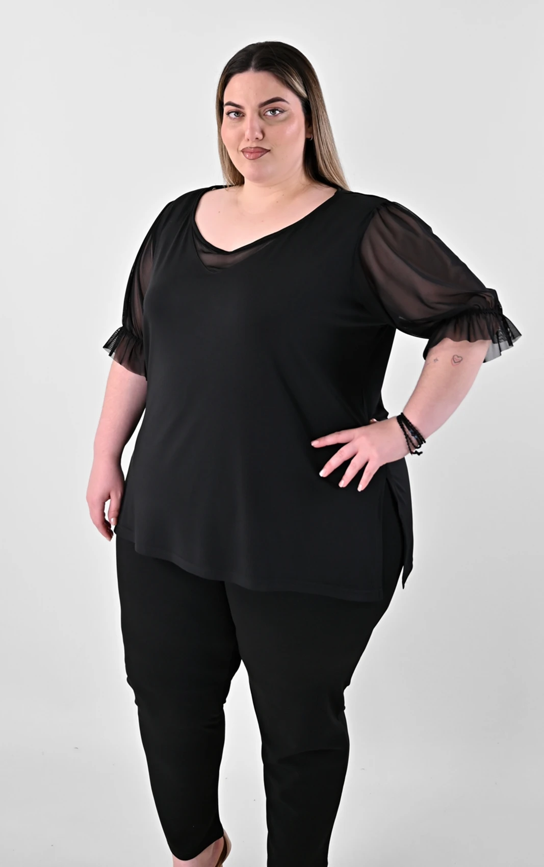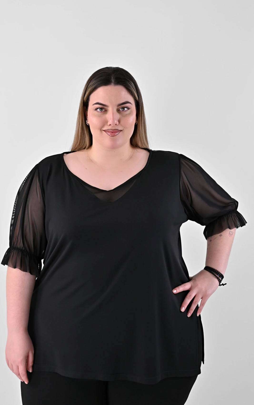 Ανακαλύψτε μια ιδιαίτερη Plus size μπλούζα που συνδυάζει την άνεση με καλόγουστες λεπτομέρειες. Το κύριο χαρακτηριστικό της είναι η διακριτική διαφάνεια στα μανίκια και στο στήθος, η οποία σχηματίζει ένα κομψό “V”, προσφέροντας μια μοντέρνα πινελιά χωρίς να θυσιάζεται η πρακτικότητα.