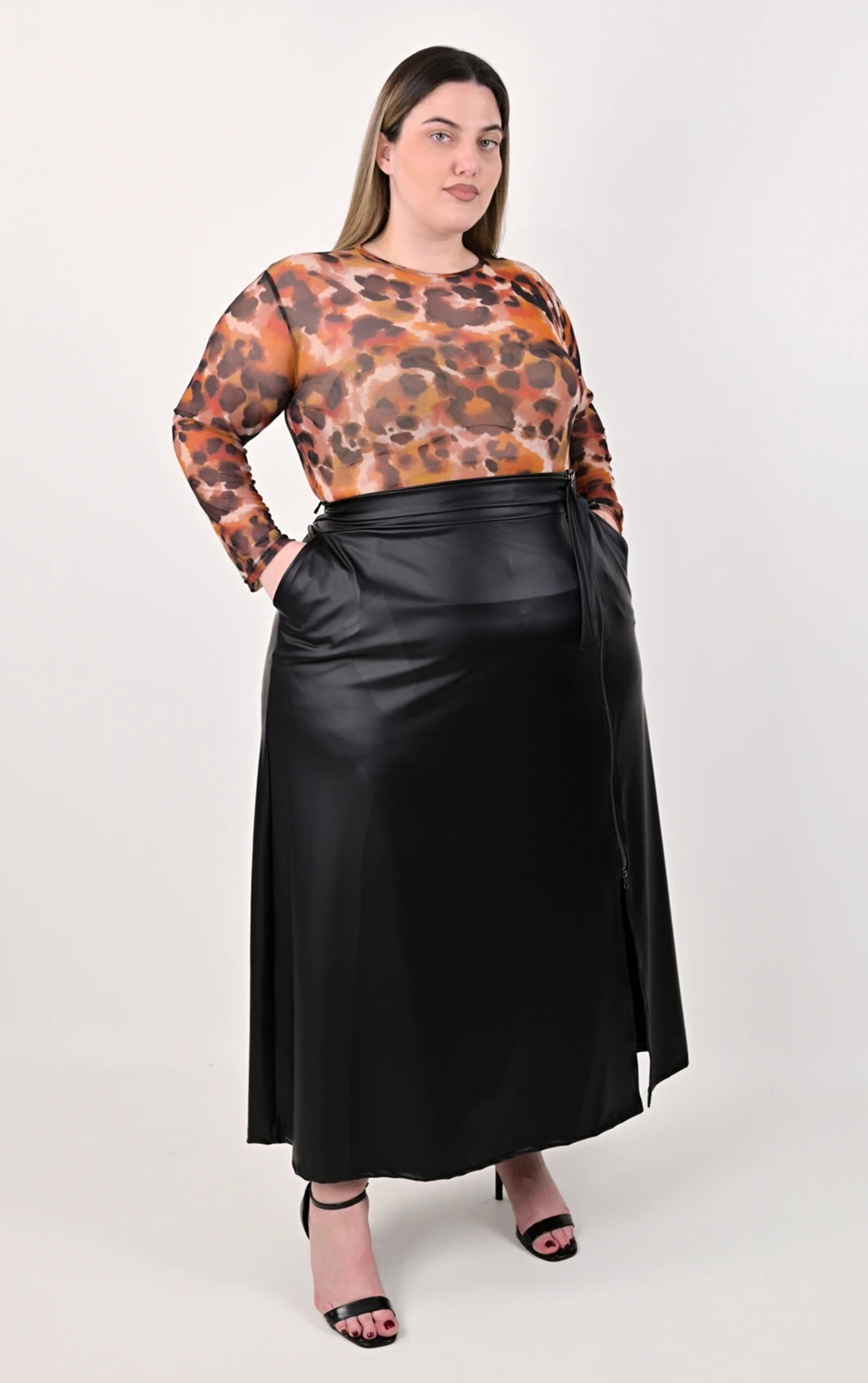 Αυτή η στυλάτη μάξι φούστα ήρθε για να αναβαθμίσει κάθε σας εμφάνιση. Κατασκευασμένη από ποιοτική faux leather (δερματίνη) σε κλασική μαύρη απόχρωση, είναι ένα κομμάτι που συνδυάζει το “edgy” στυλ με την άνεση.