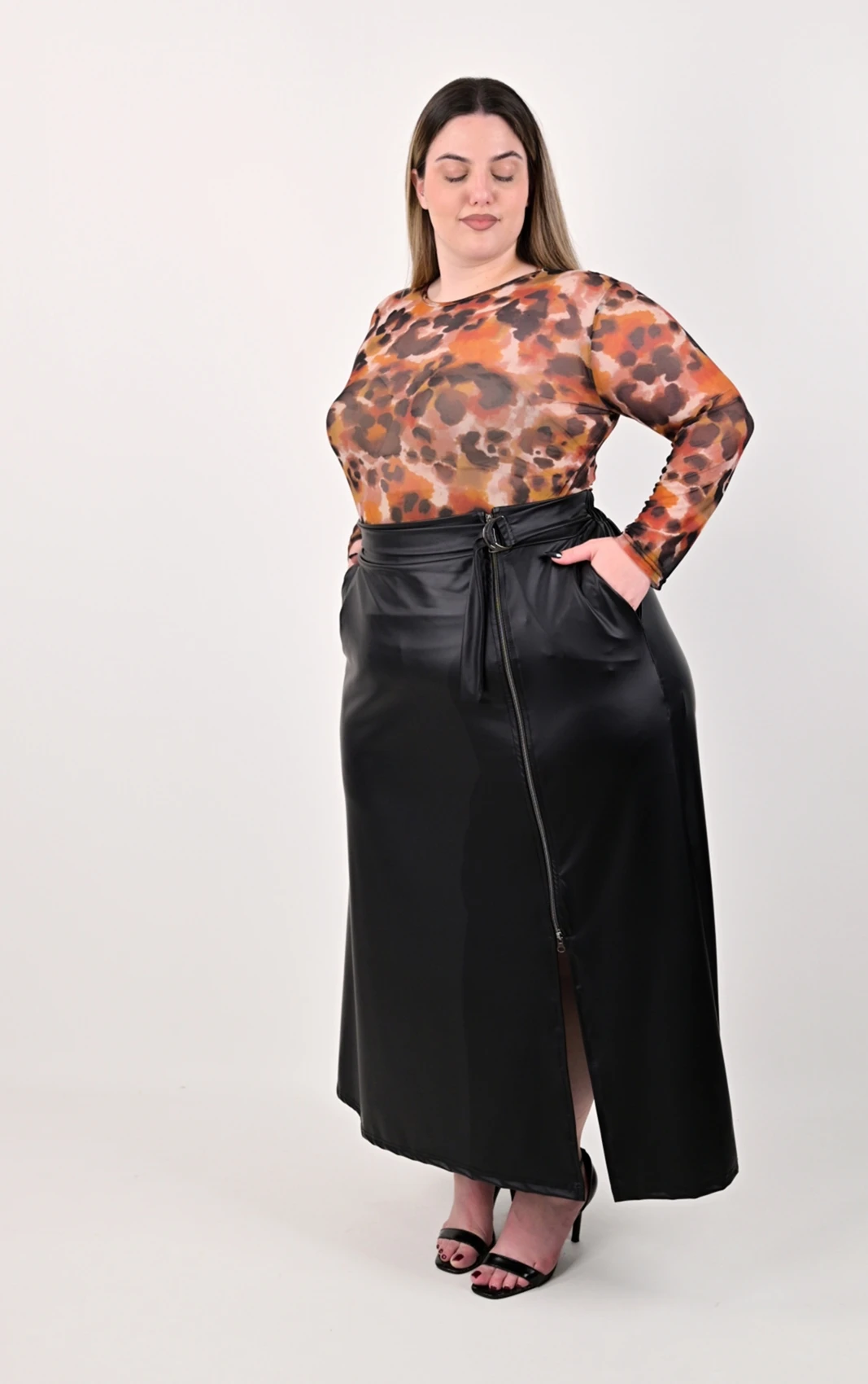 Μάξι Μαύρη Φούστα Δερματίνη με Ζώνη & Ασύμμετρο Φερμουάρ