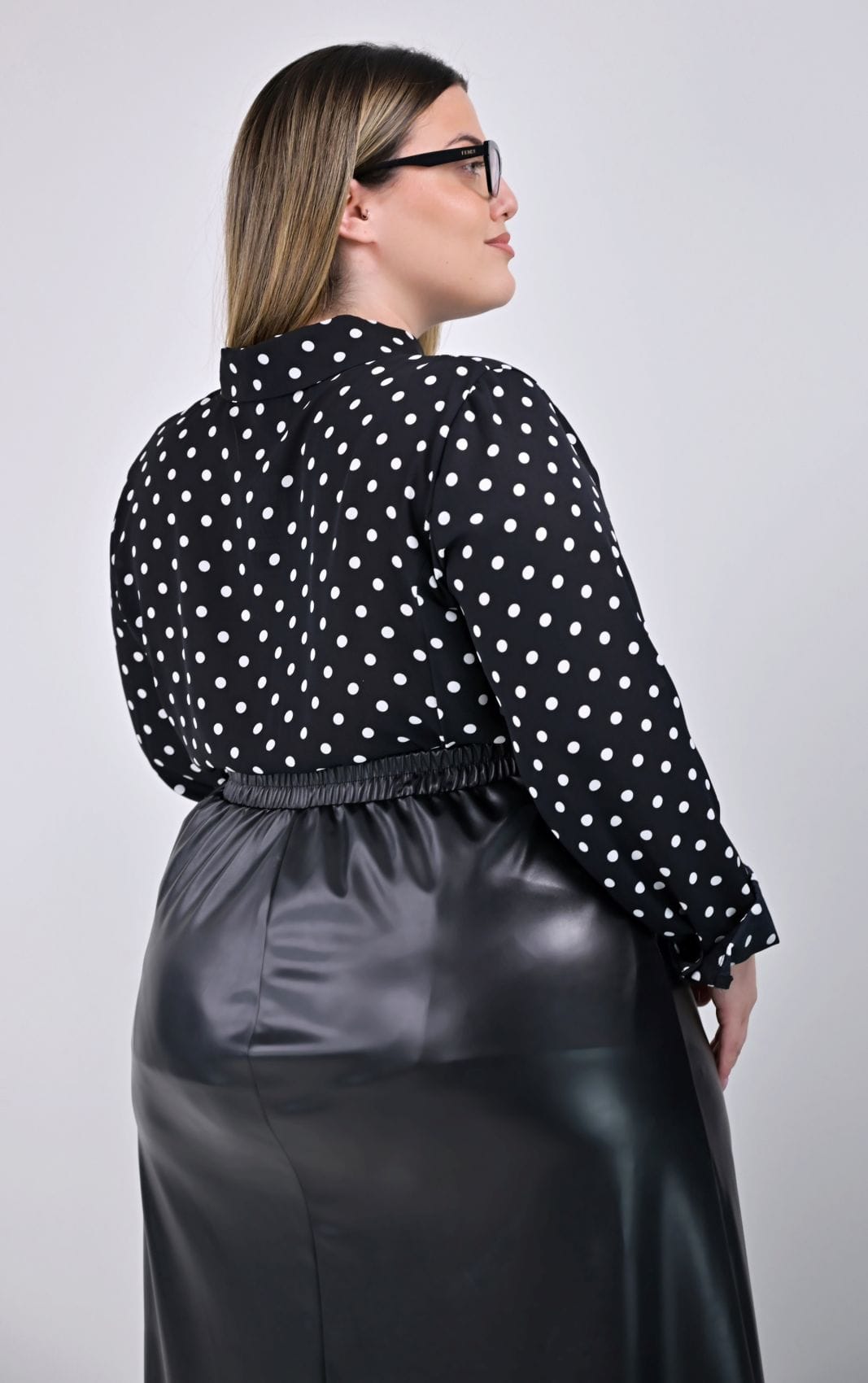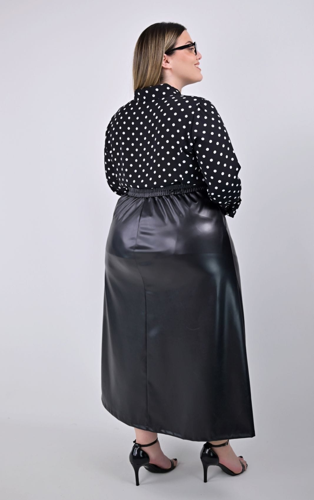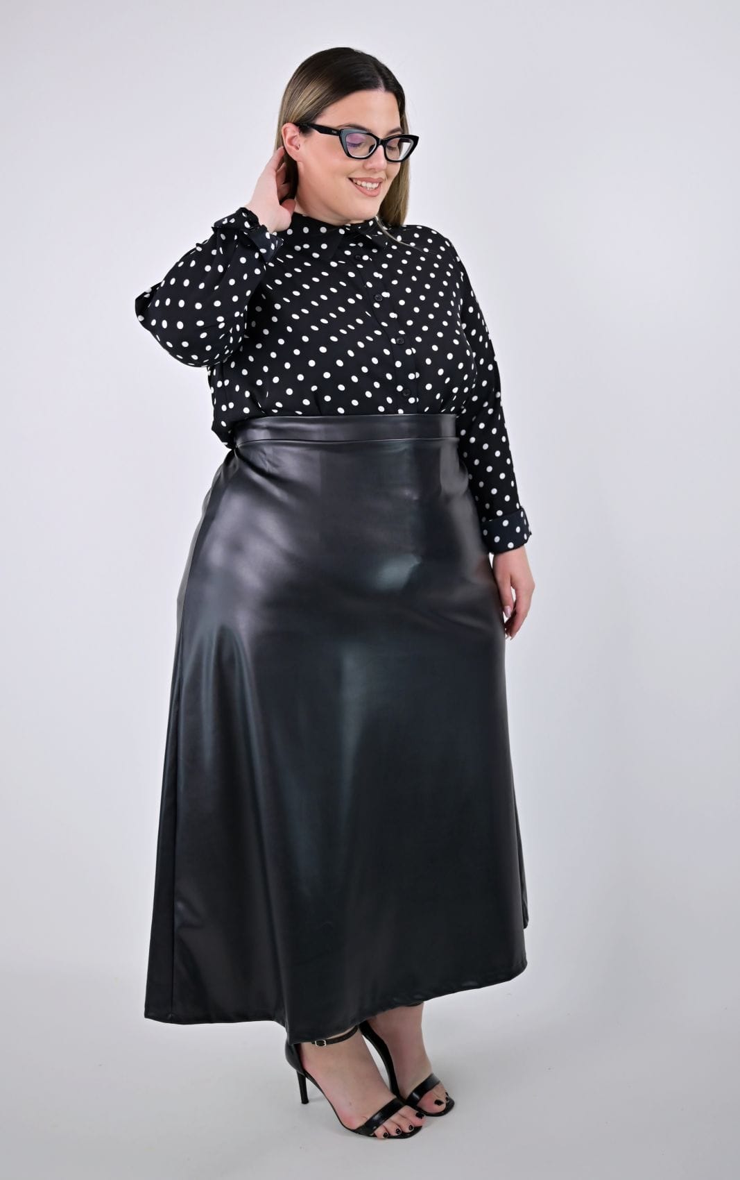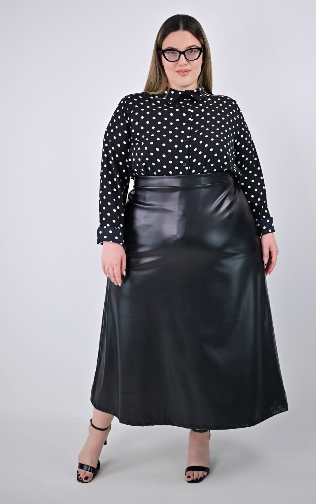 Plus size μαύρη midi φούστα από ελαστική δερματίνη, ιδανική για κομψές και μοντέρνες εμφανίσεις. Σχεδιάσαμε αυτή τη φούστα με ψηλόμεση γραμμή και διακριτική άλφα εφαρμογή, που αγκαλιάζει τη σιλουέτα προσφέροντας άνεση και στυλ. Στο πίσω μέρος της μέσης υπάρχει λάστιχο, εξασφαλίζοντας τέλεια εφαρμογή, ενώ το μπροστινό μέρος συνεχίζει με μαλακό ύφασμα για επιπλέον άνεση.