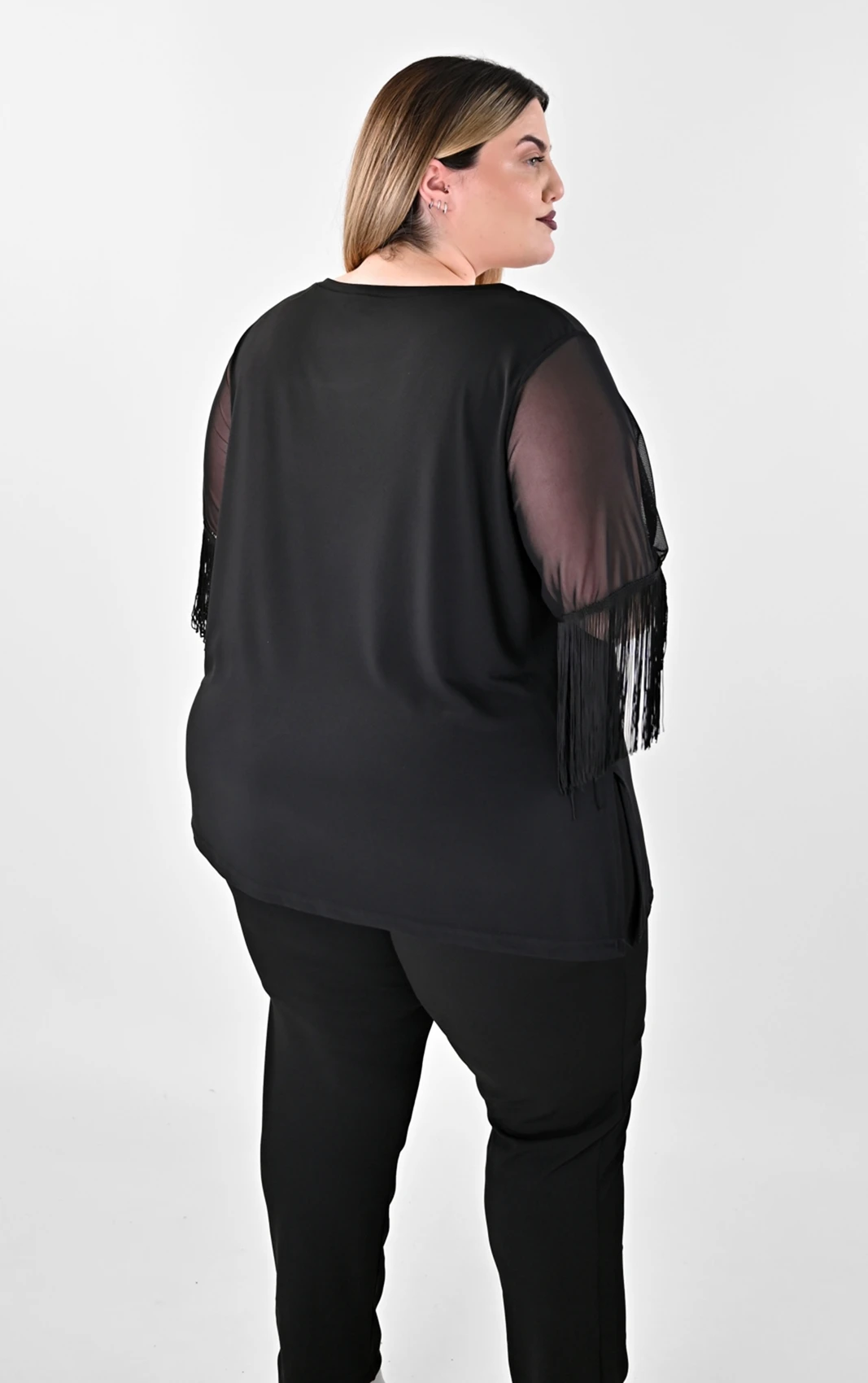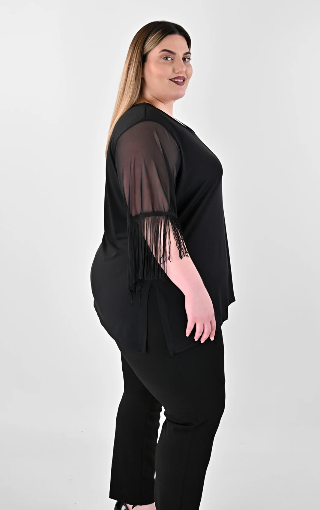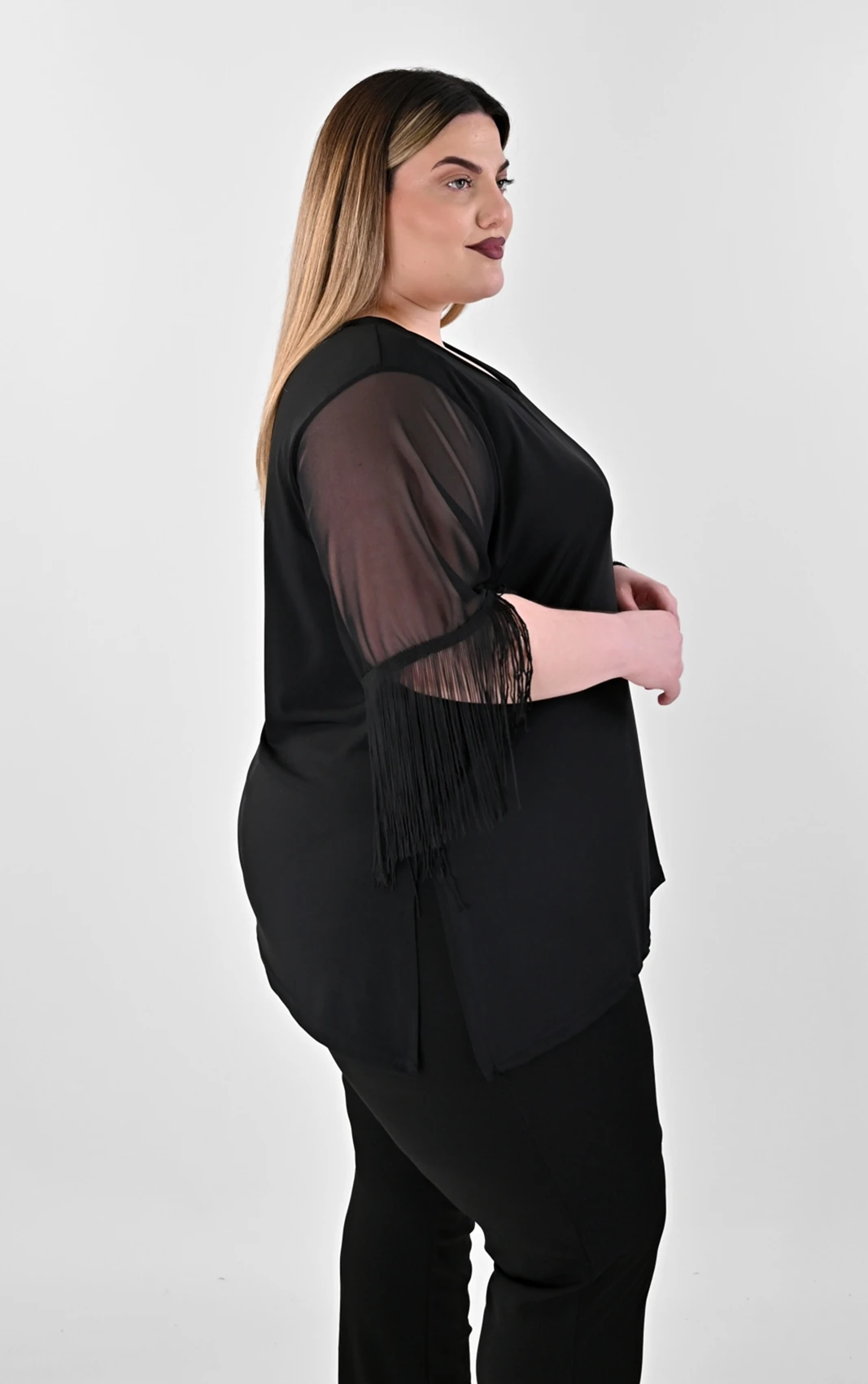 Μανίκια: 3/4 από διάφανο τούλι με εντυπωσιακή λεπτομέρεια από κρόσσια στο τελείωμα.