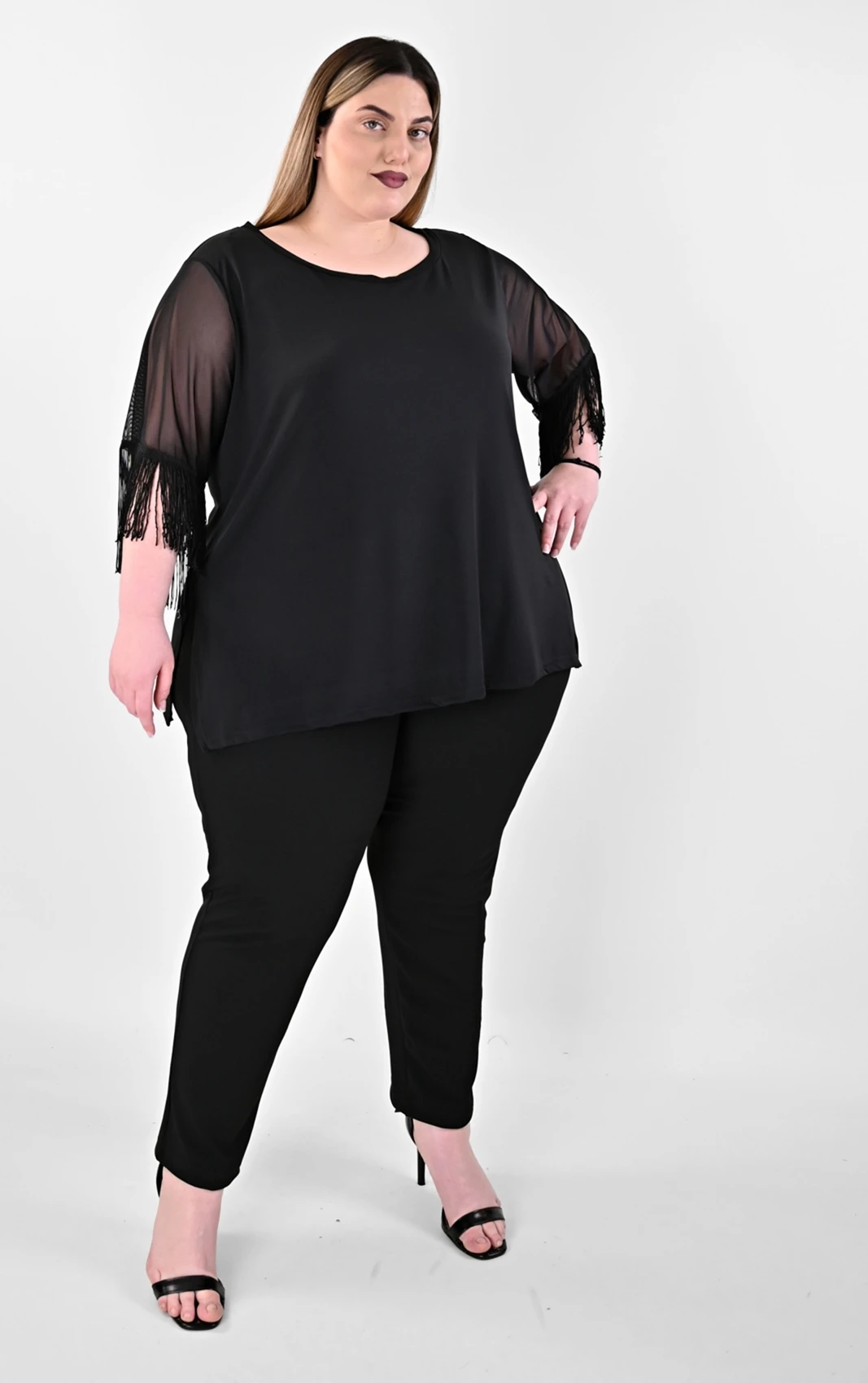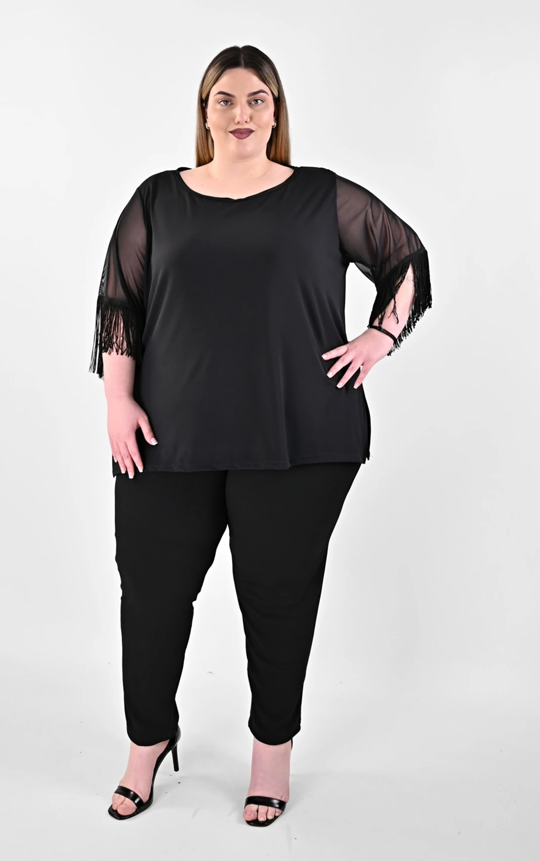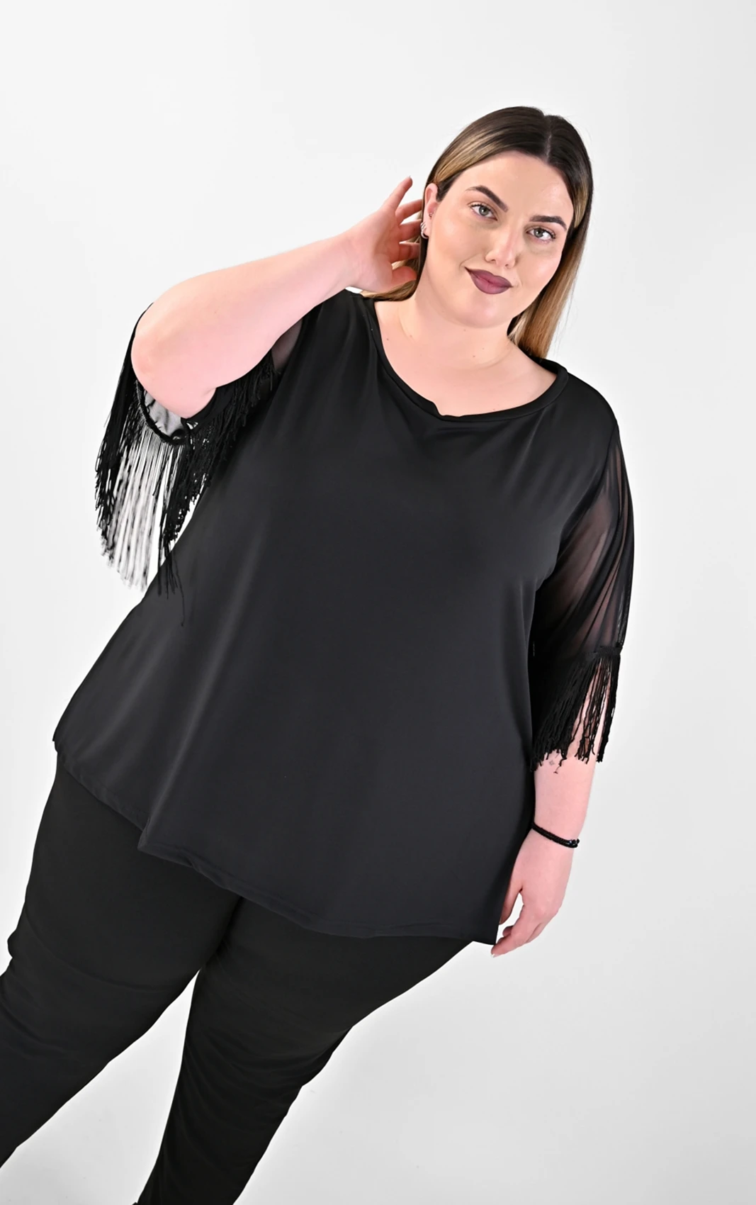Δώσε πνοή στις εμφανίσεις σου με τη Μαύρη Μπλούζα με Κρόσσια στα Μανίκια. Το σχέδιο κλέβει τις εντυπώσεις χάρη στα 3/4 μανίκια από αέρινη διαφάνεια, τα οποία καταλήγουν σε πυκνά, μακριά κρόσσια που ακολουθούν κάθε σου κίνηση. Με πλαϊνά ανοίγματα για άψογη εφαρμογή και στρογγυλή λαιμόκοψη, αυτή η μπλούζα αγκαλιάζει ομοιόμορφα τη σιλουέτα, προσφέροντας έναν tasteful συνδυασμό σταθερότητας και αέρινης αίσθησης.