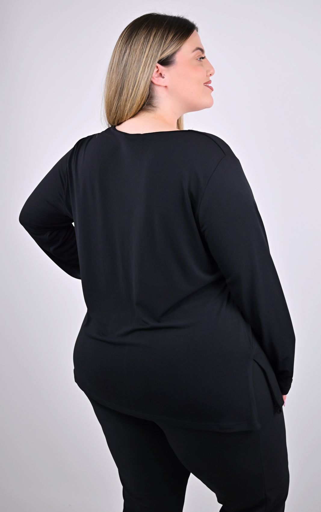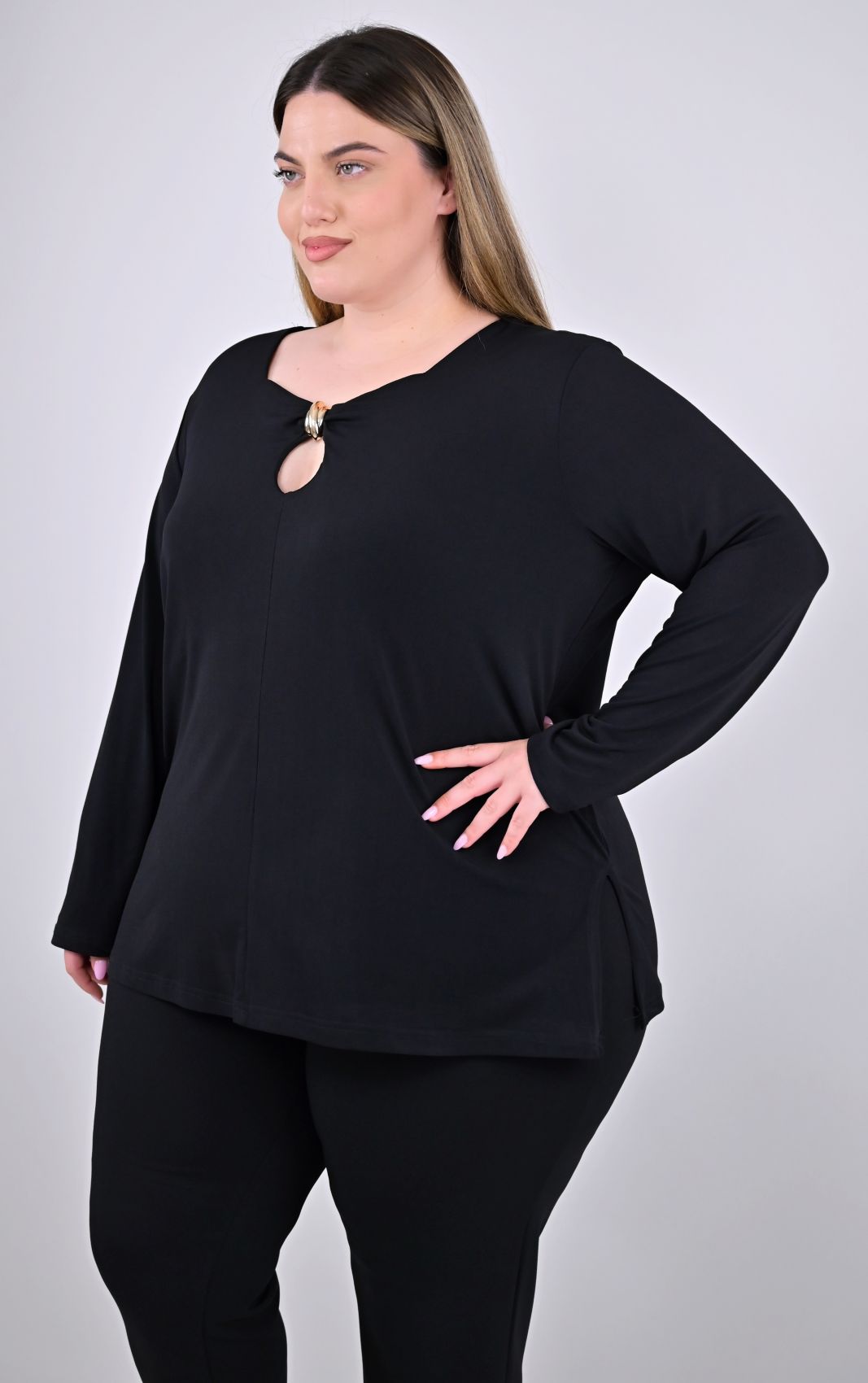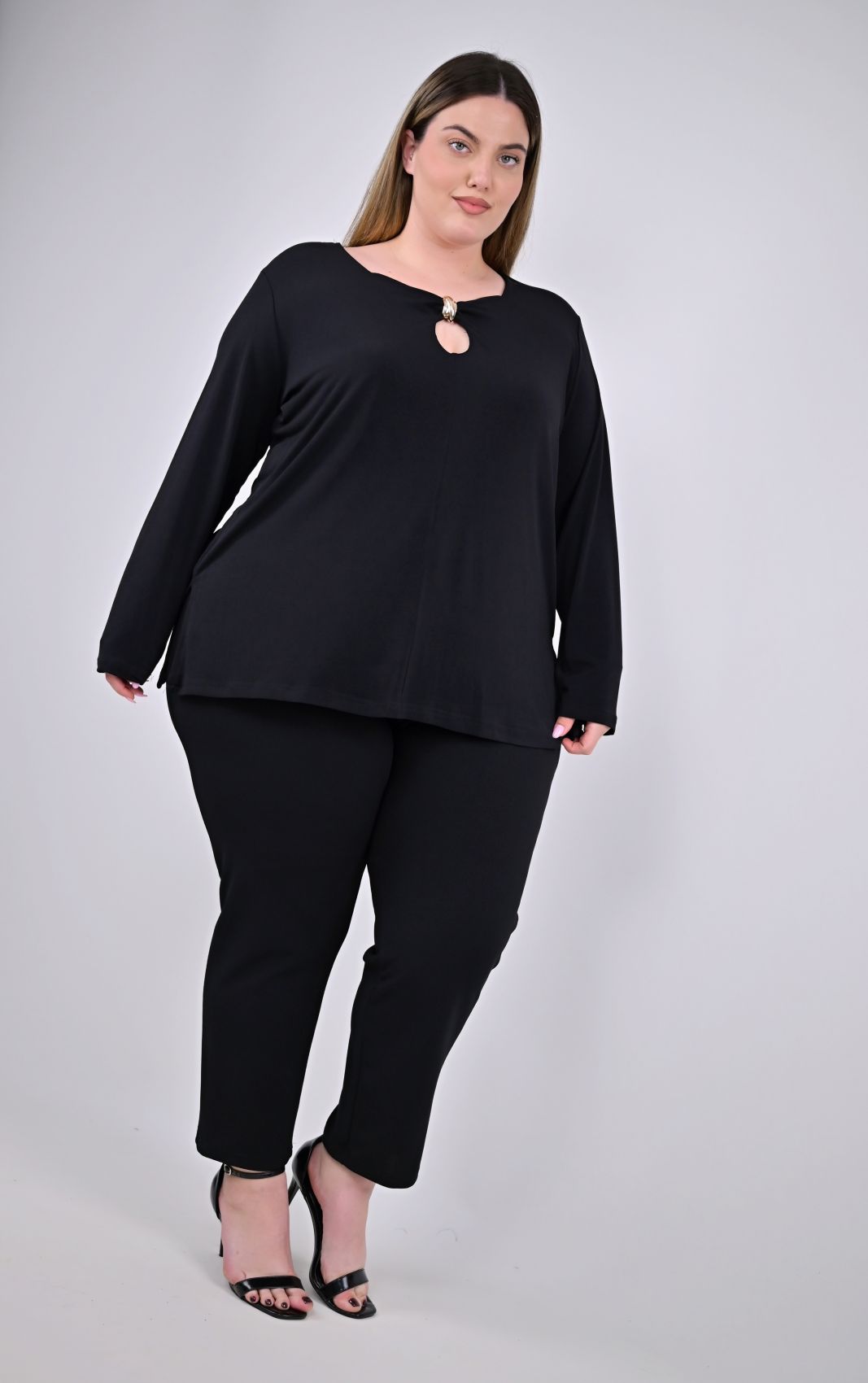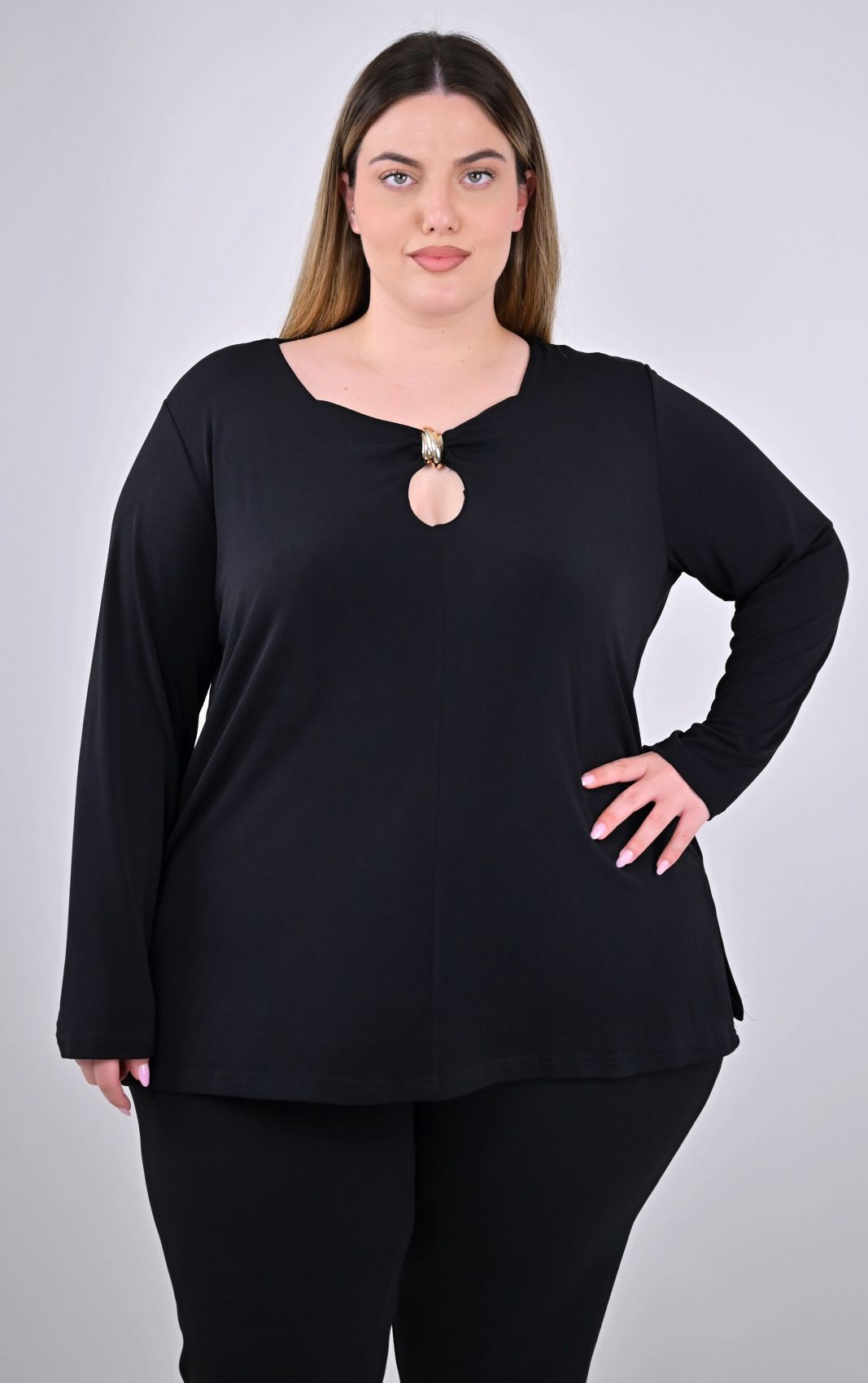 Προσθέστε μια μοντέρνα και ξεχωριστή πινελιά στην γκαρνταρόμπα σας με αυτή την plus size μαύρη μπλούζα. Η κομψή χρυσή μεταλλική λεπτομέρεια στο ντεκολτέ δημιουργεί ένα statement κομμάτι, ιδανικό για να σας συνοδεύσει σε κάθε περίσταση, από μια επαγγελματική εμφάνιση μέχρι μια έξοδο.